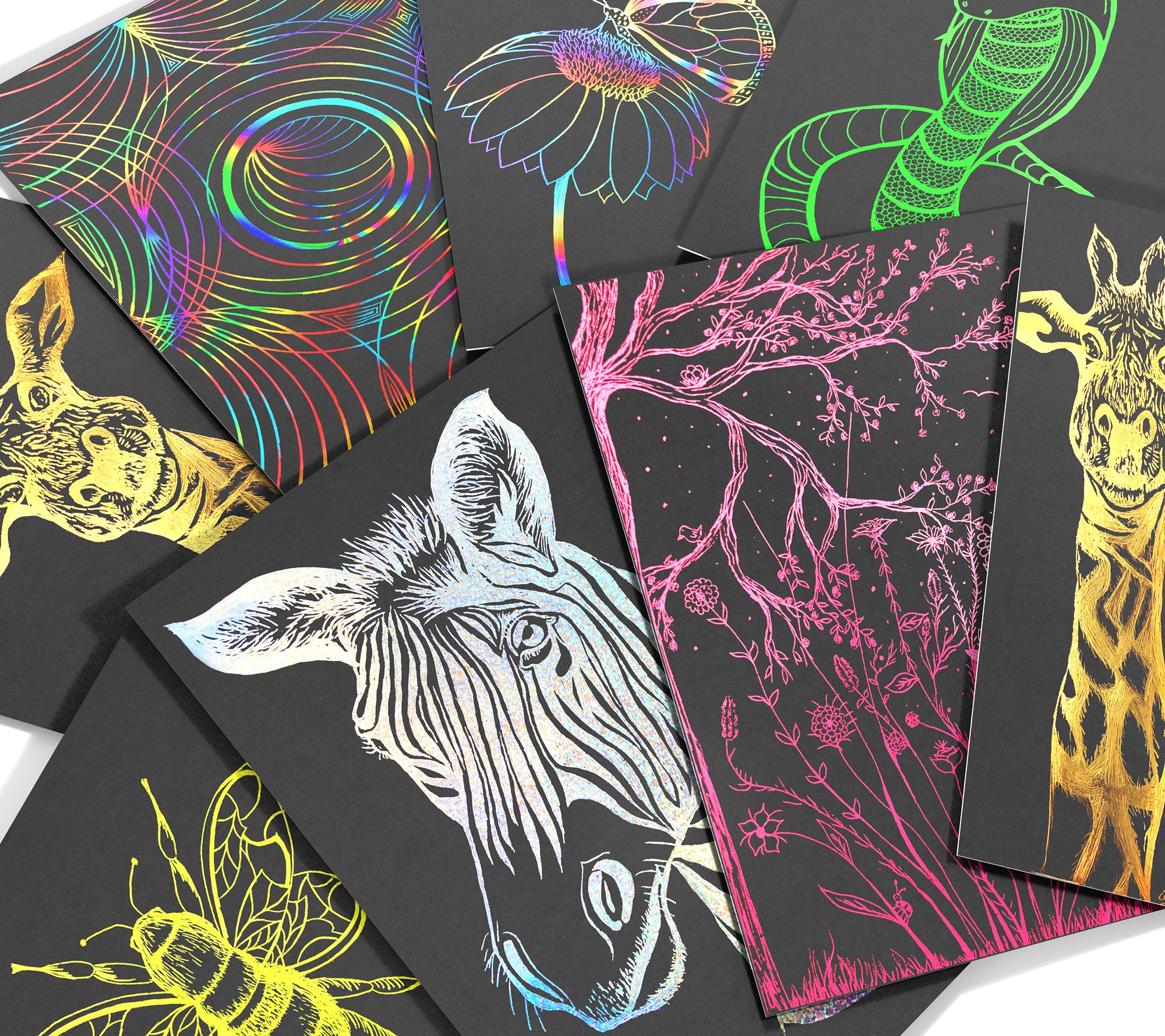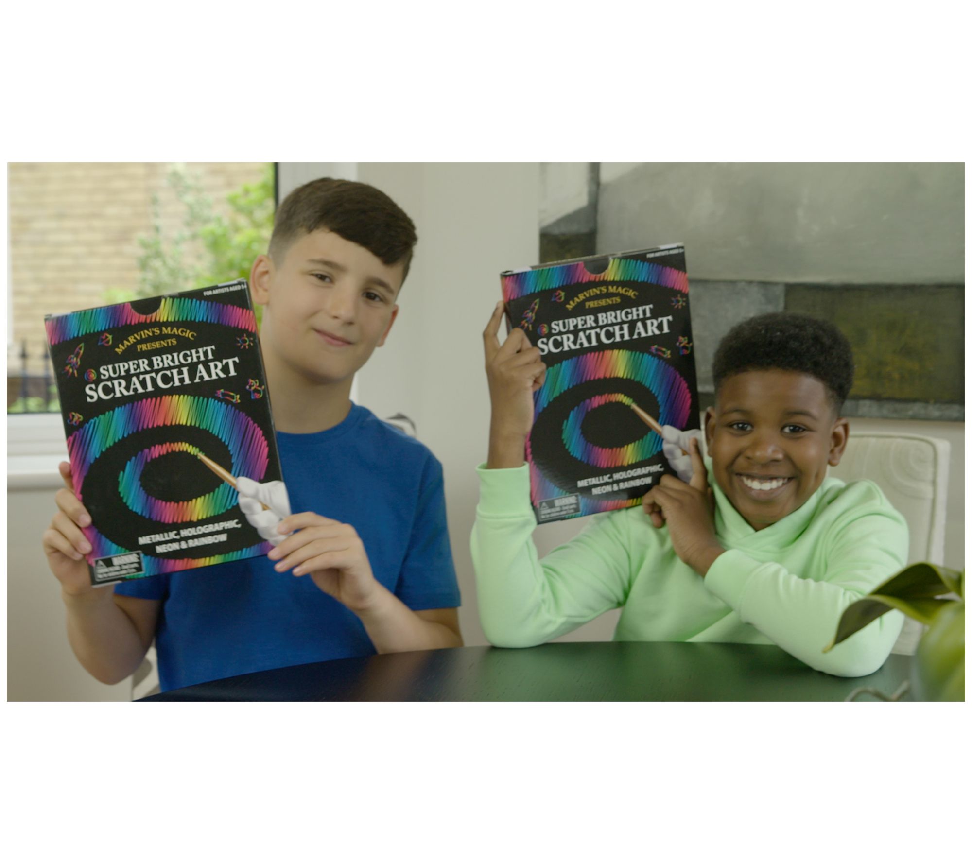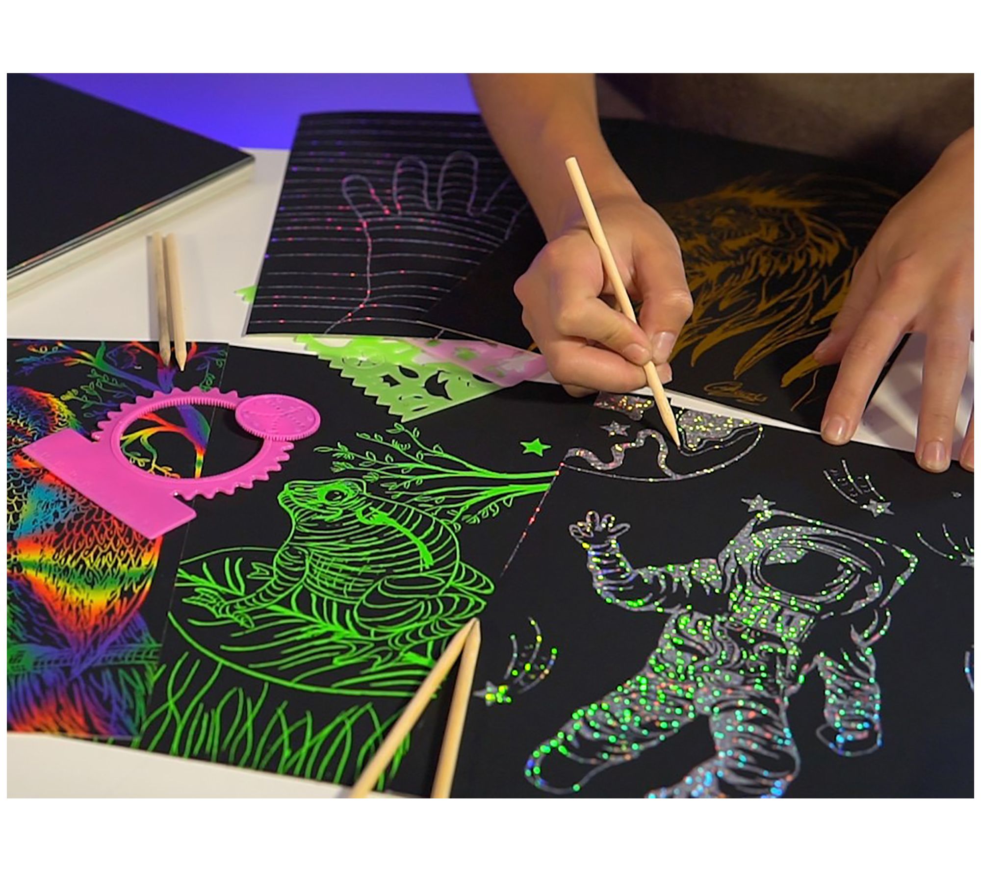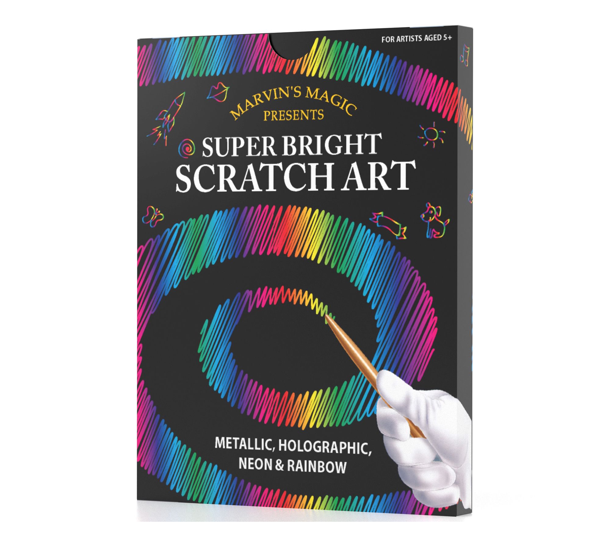 Unleash your creativity with super bright scratch art! Perfect for school projects, presentations, or unique greeting cards, this set allows you to write, draw, and discover vibrant colors hidden beneath the surface. From Marvin's Magic.