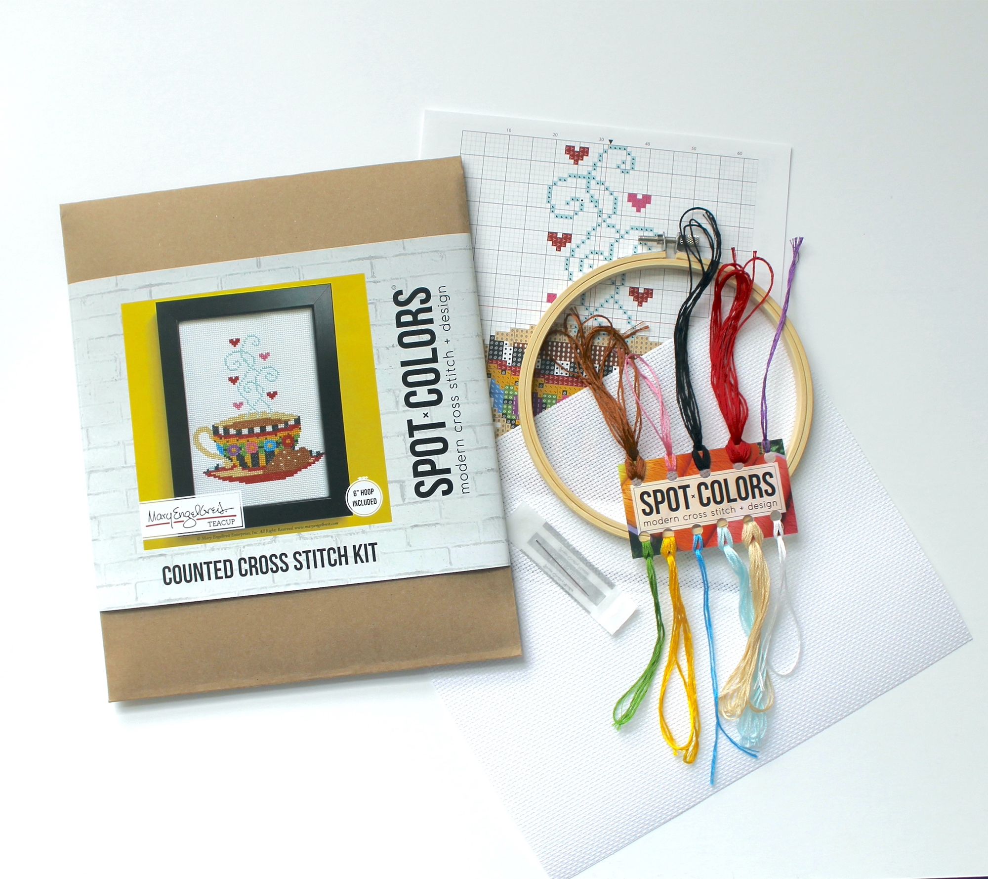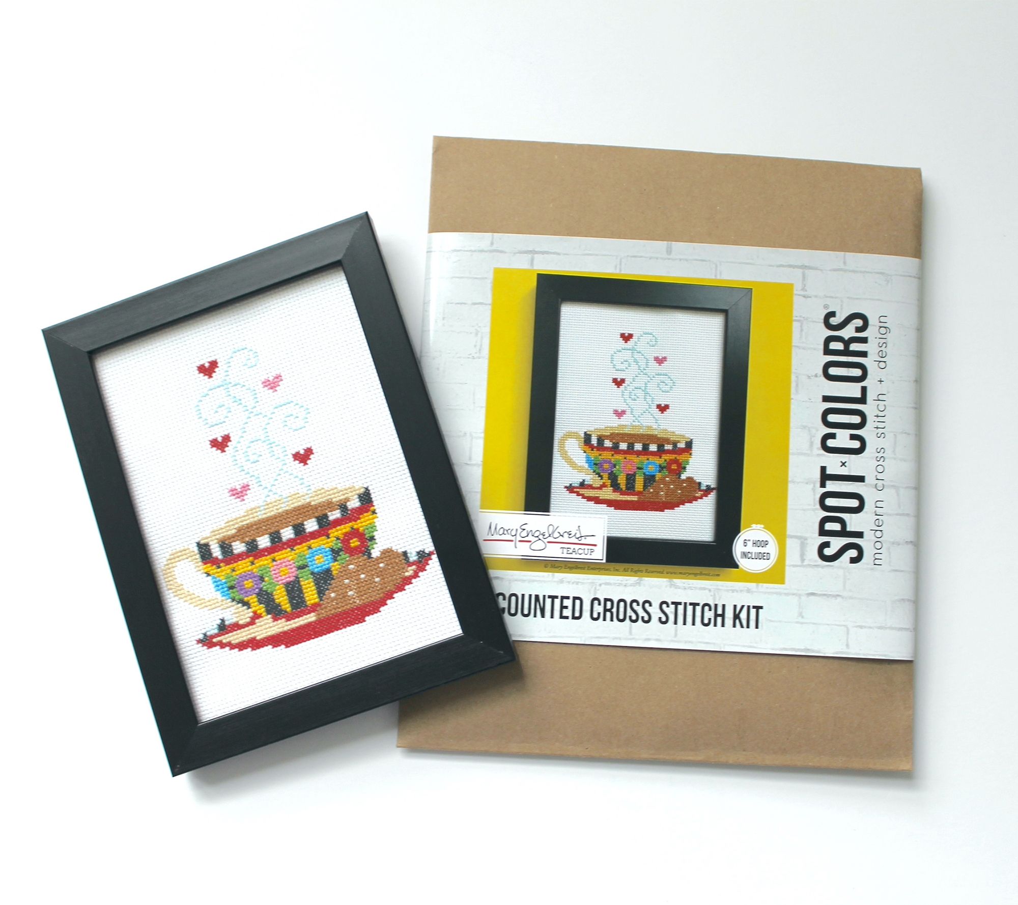 Enjoy relaxing creative time with this Mary Engelbreit teacup cross-stitch kit. The kit comes complete with embroidery thread, needle, 14-count aida fabric, wood embroidery hoop, pattern, and instructions, so you are ready to stitch as soon as you receive it. This beginner-friendly kit makes a charming gift or personal project. From Mary Engelbreit by Spot Colors.