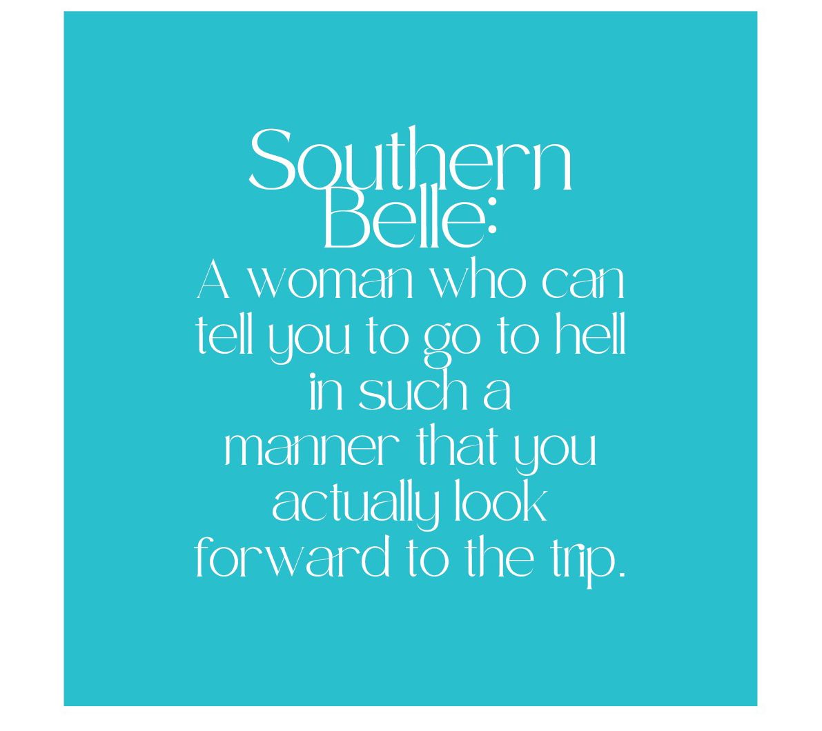 • Features the quote: Southern Belle: A woman who can tell you to go to hell in such a manner that you actually look forward to the trip