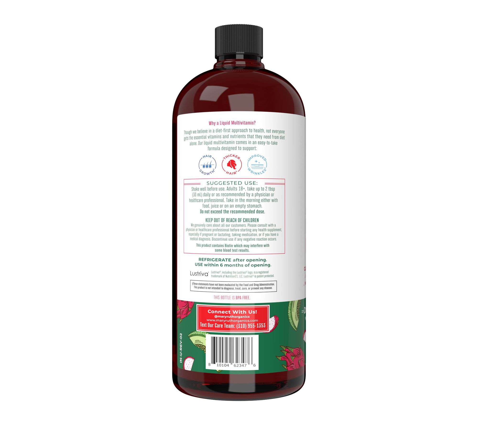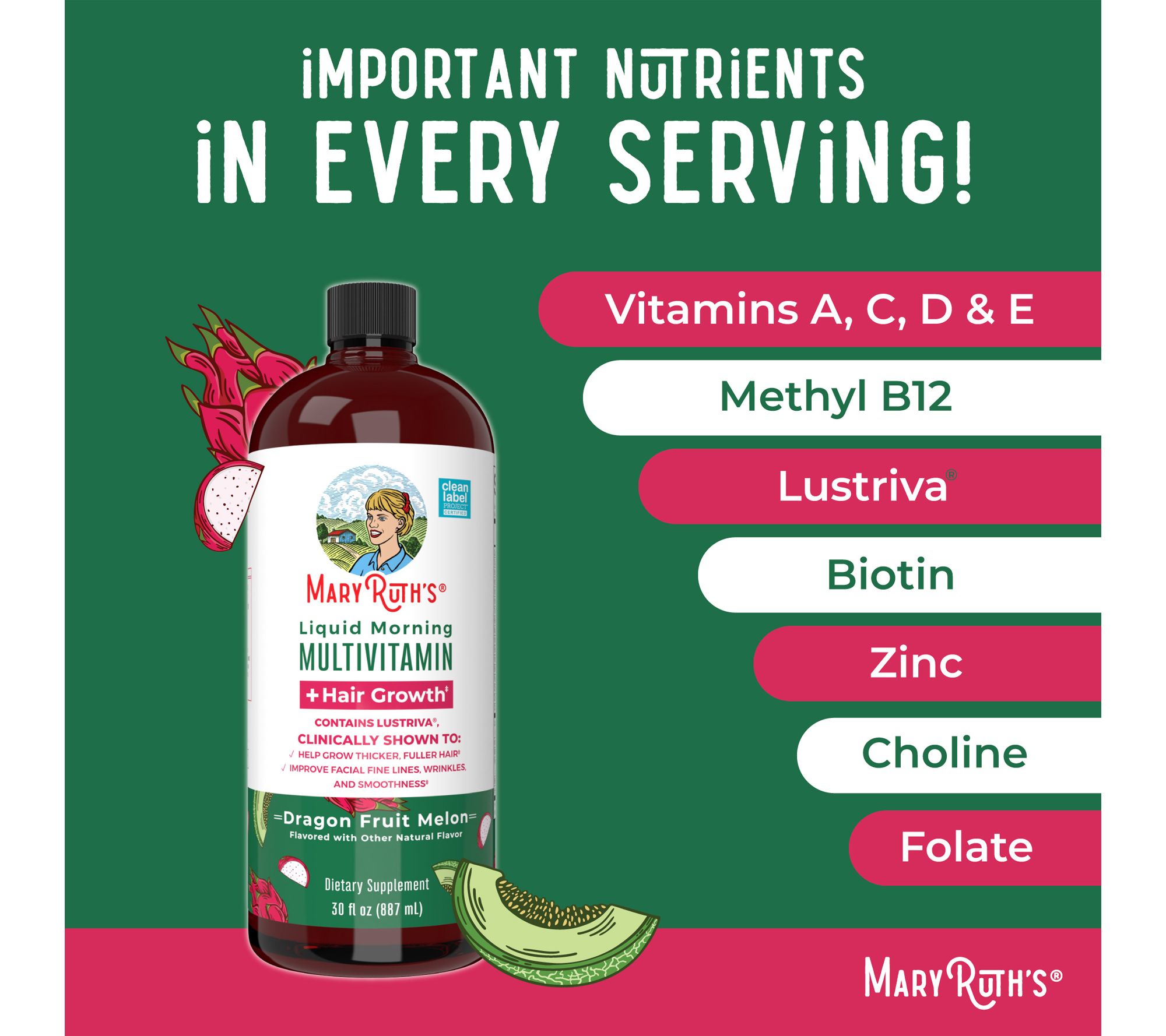 Start your day the right way with Mary Ruth's Liquid Morning Multivitamin & Hair Growth. The dragonfruit-flavored formula contains all eight B vitamins, vitamin C, and vitamin D3, and is also made with Lustriva, which has been shown to reduce the appearance of fine lines and wrinkles and which has been shown to increase the number of existing hair follicles in the growth phase versus hair follicles in the hair shedding/terminal phase. From Mary Ruth's.