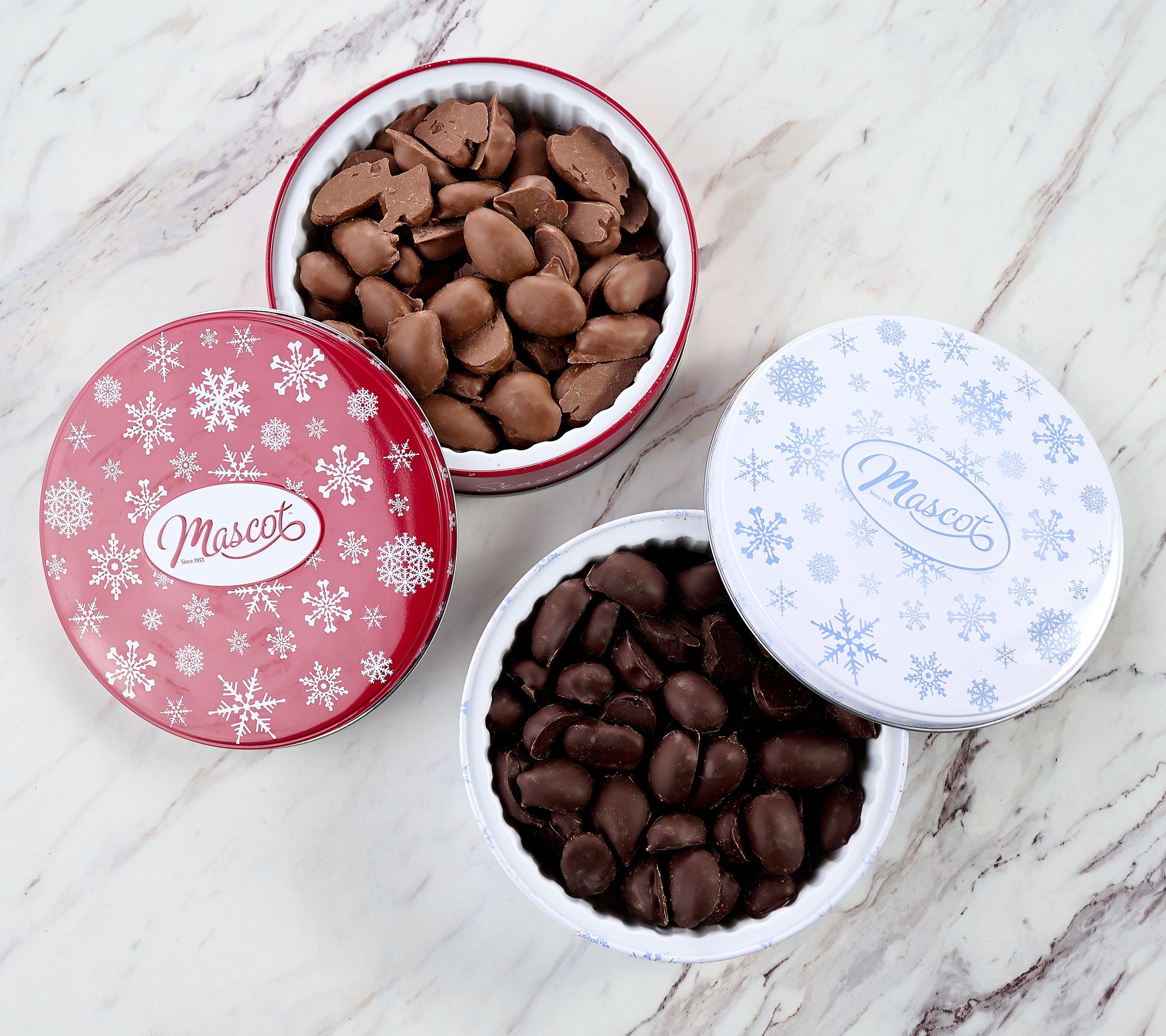 • Includes two gift tins of chocolate-covered pecans