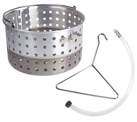 Includes turkey fryer, lid, basket with bailing handle, lifting hook, draining hose, and strainer