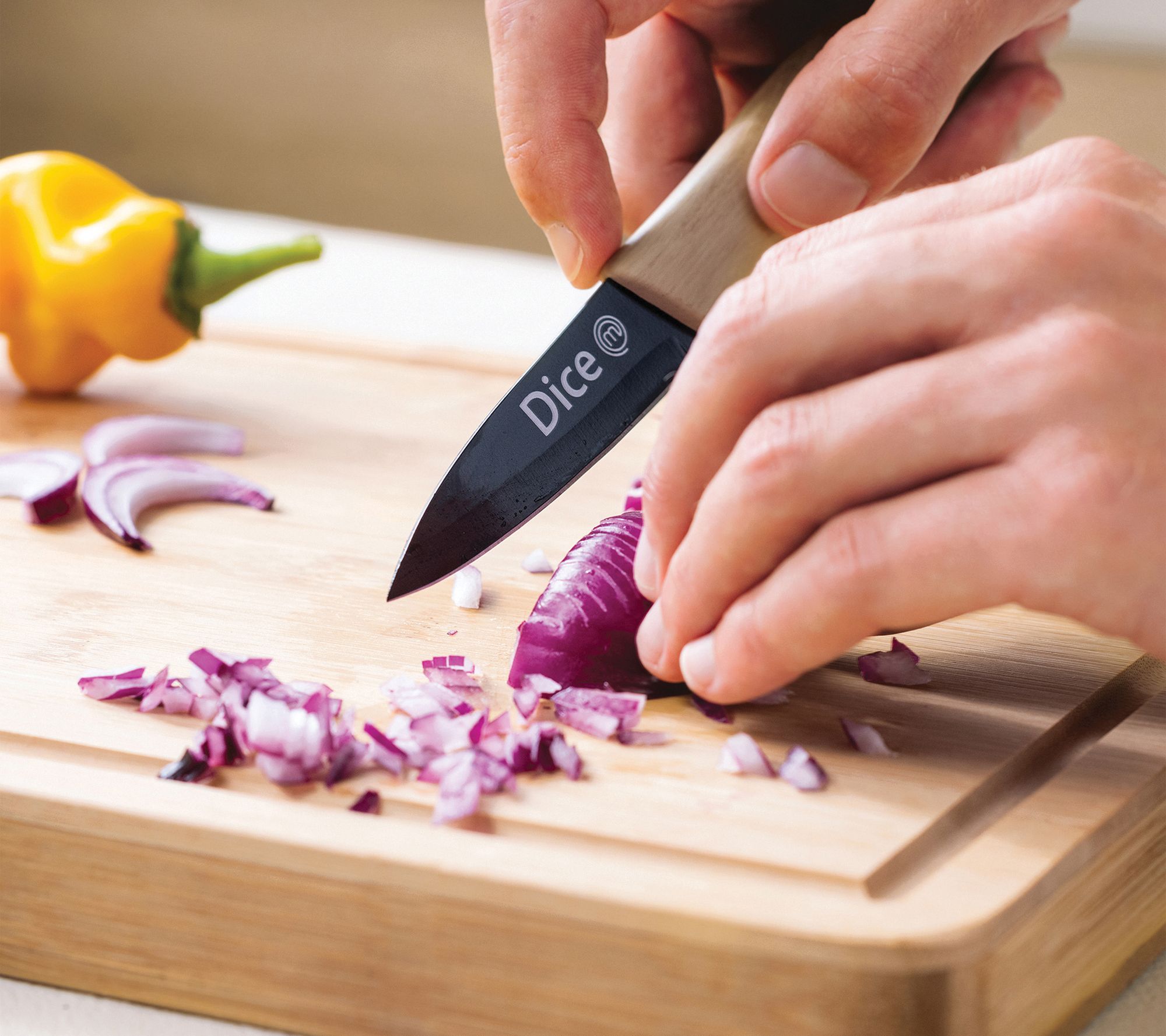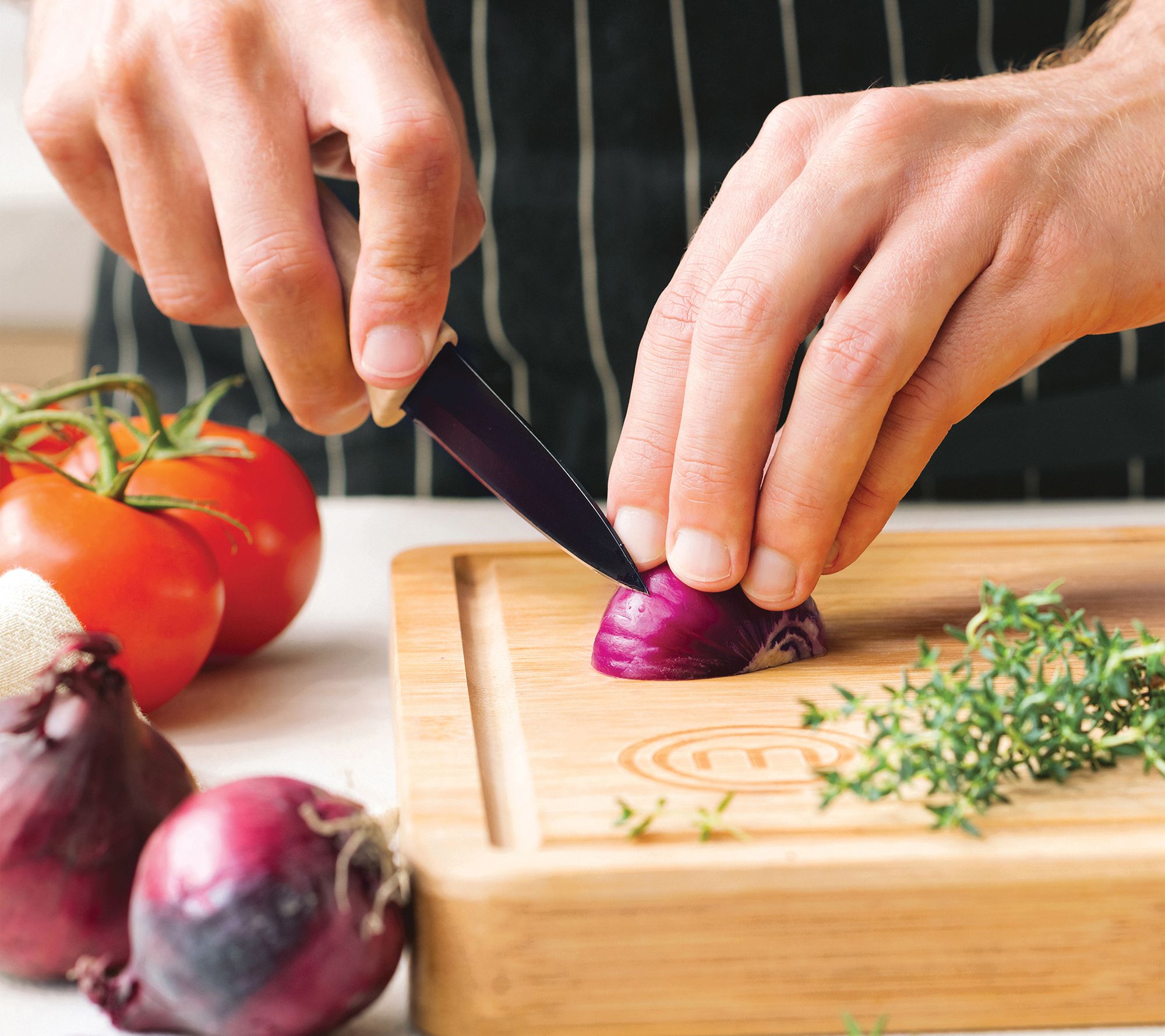 Whether you're chopping herbs, dicing veggies, or slicing meats, this set has you covered! It comes with three non-stick, stainless steel knives and a bamboo cutting board so you can meal-prep like a boss. From MasterChef.
