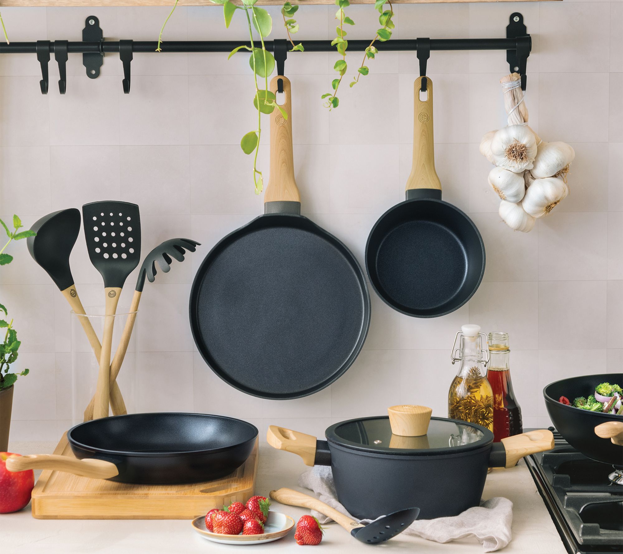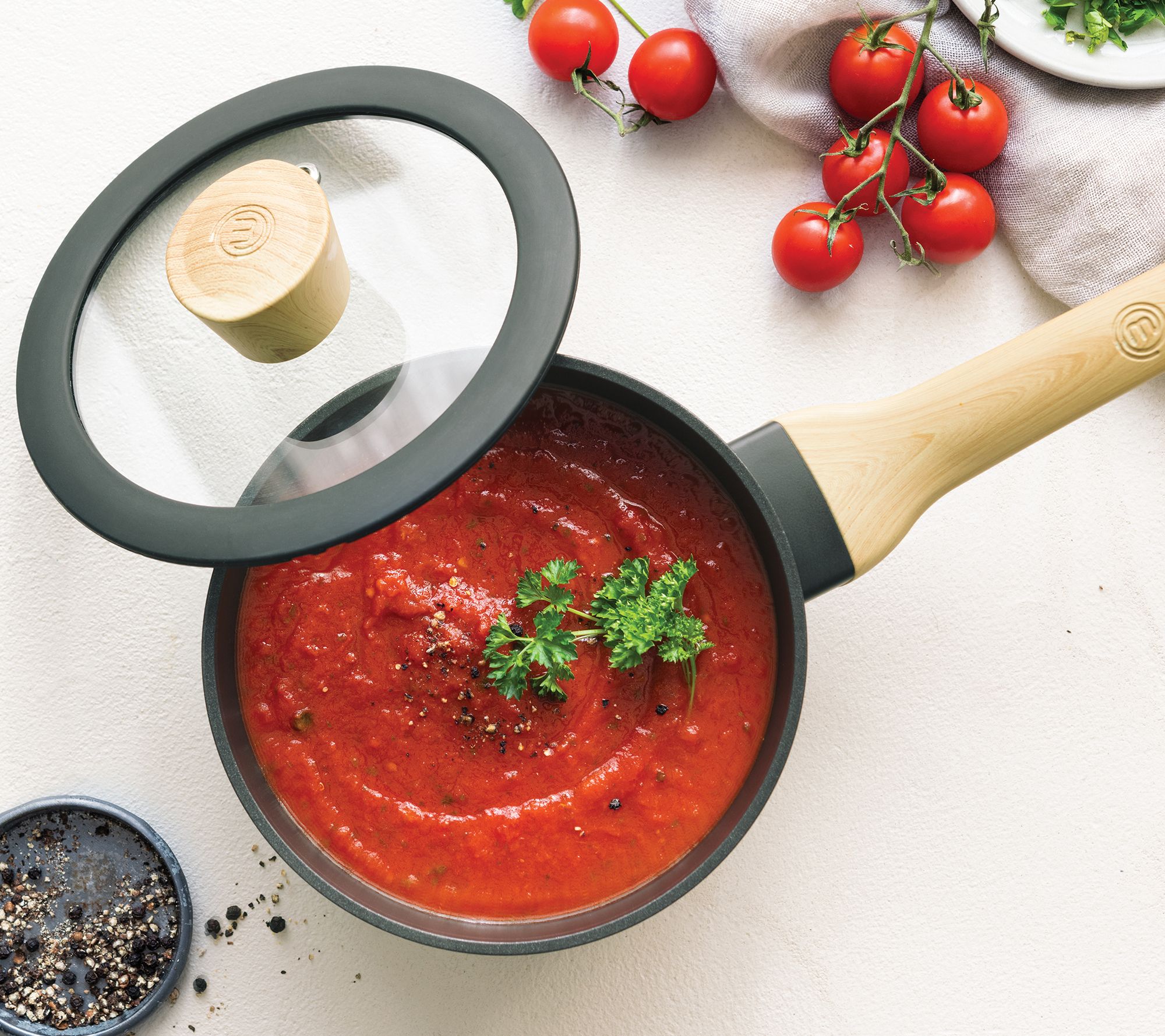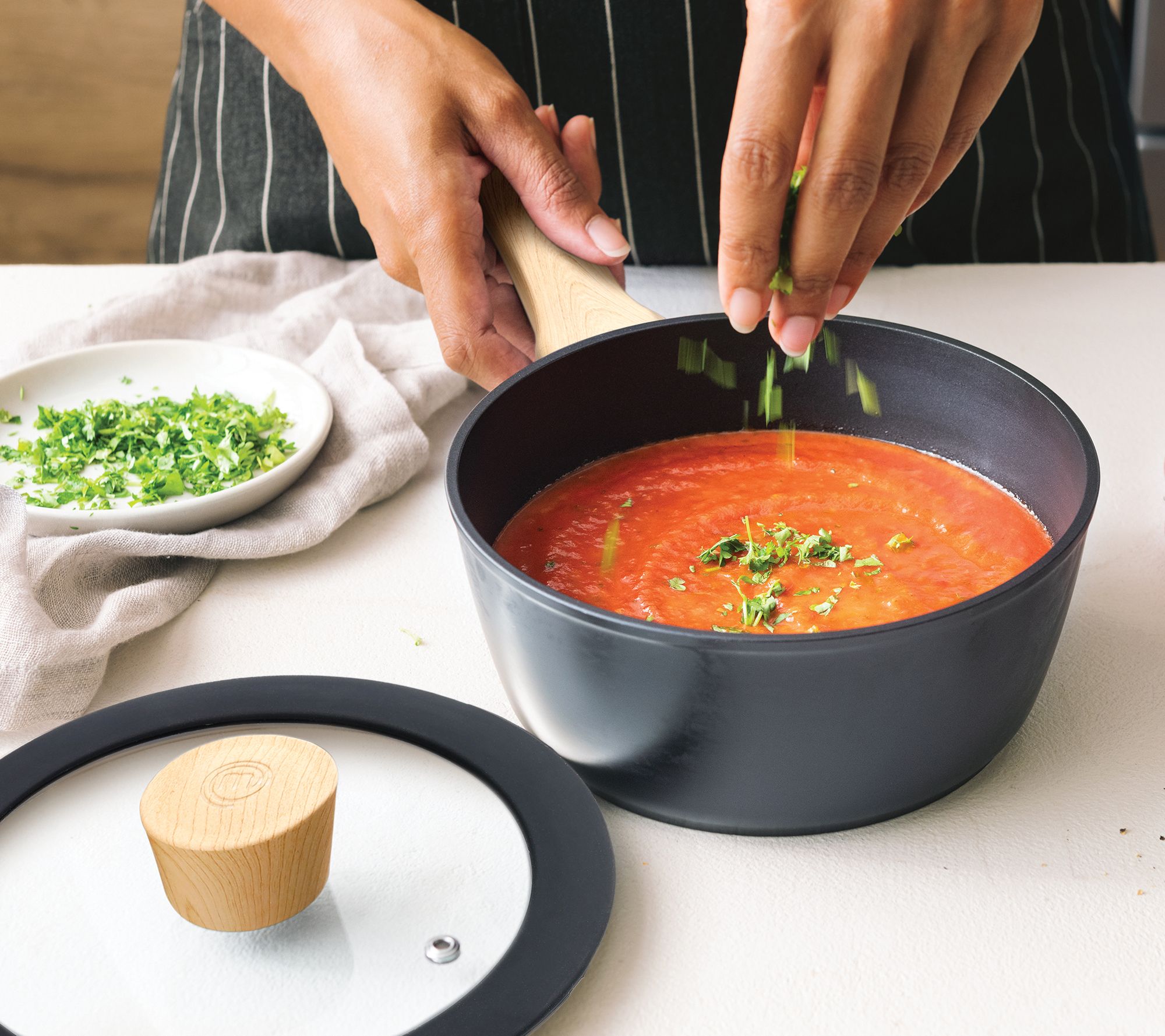 Elevate your culinary potential with the thoughtfully-designed construction of this cookware set. Crafted from sturdy aluminum, it features non-stick interiors and soft-touch handles so cooking and cleaning are a breeze. From MasterChef.