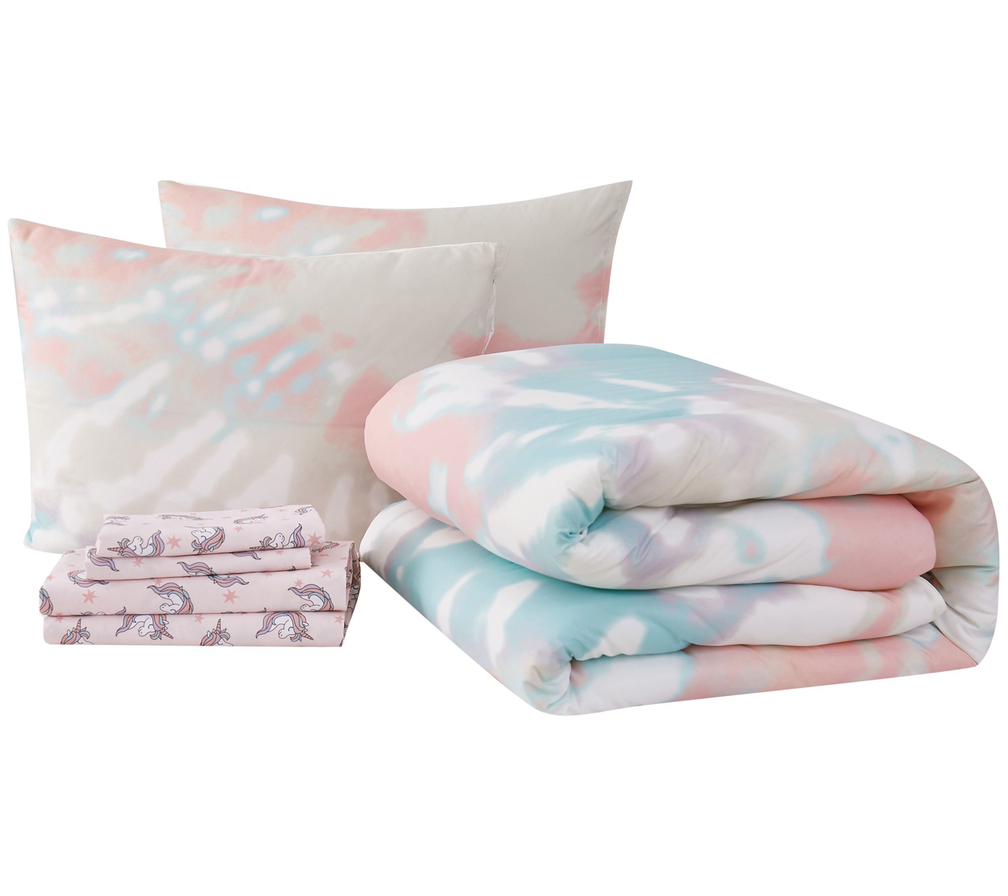 Bedroom, you've met your match! This fun tie-dye bed-in-a-bag set includes everything you need for a complete bedding makeover. (Check out the unicorn sheets!) From Material Girl.