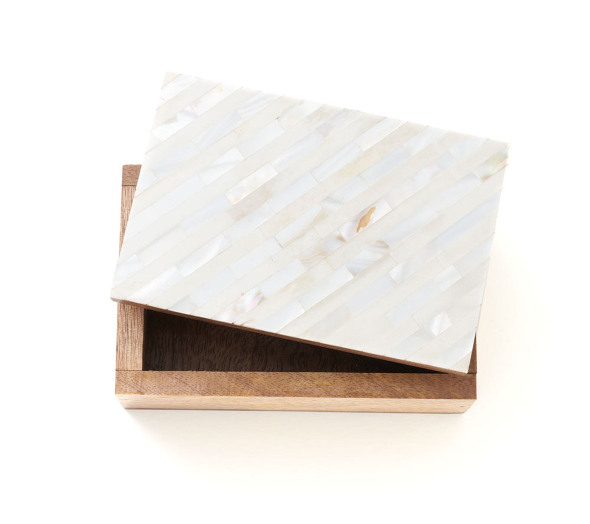 Perfect for stashing jewelry, trinkets, and other small treasures, this beautiful wooden box offers artisanal style and a lid with a diagonal, subtly striped pattern. From Matr Boomie.