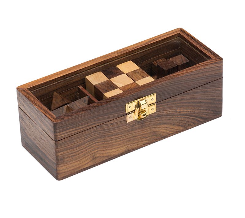 These wooden puzzles offer a challenge for all -- and they all fit in this storage box for challenges on the go! From Matr Boomie.