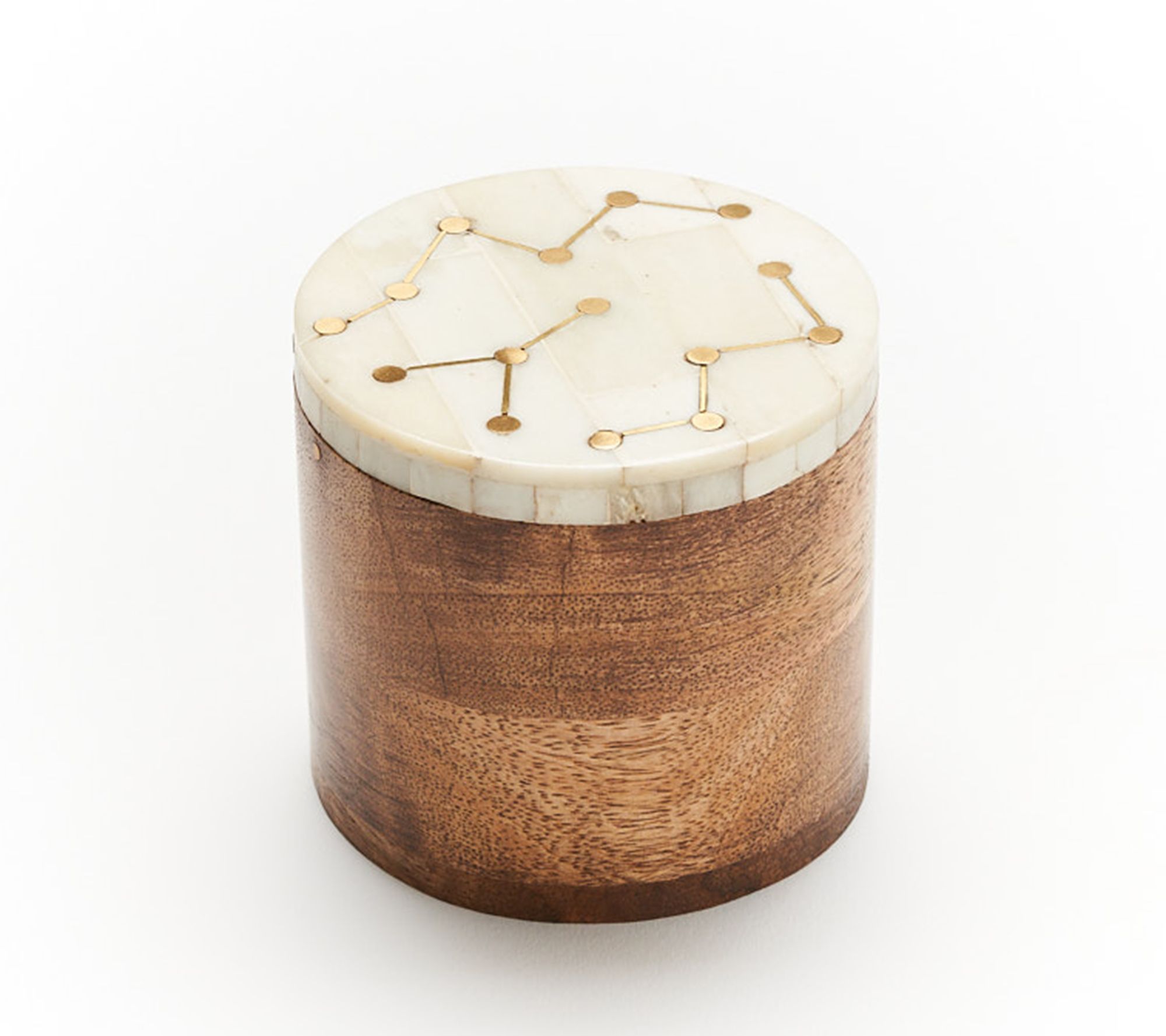 Bring a touch of enchantment to your jewelry storage with this cylindrical keepsake box, featuring an inlaid celestial design set in a beautiful pearl-white bone lid. From Matr Boomie.