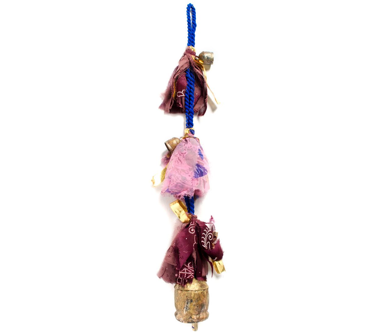 This darling decor combines cheerful sari fabric and gold tassel with the delicate chime of three bells. From Matr Boomie.