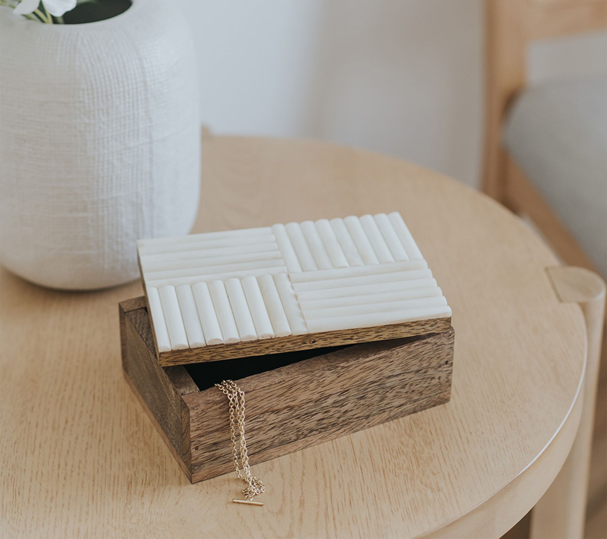 Offering clean lines and contemporary yet earthy style, this beautiful wooden box is topped by a ribbed lid and is the perfect size for stashing keys, jewelry, and other small treasures. From Matr Boomie.