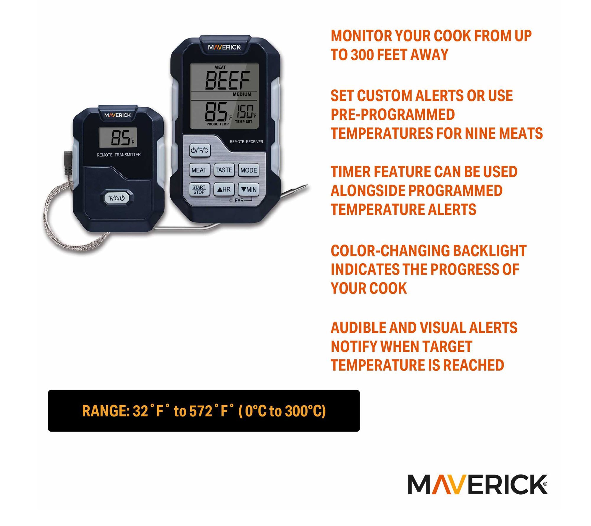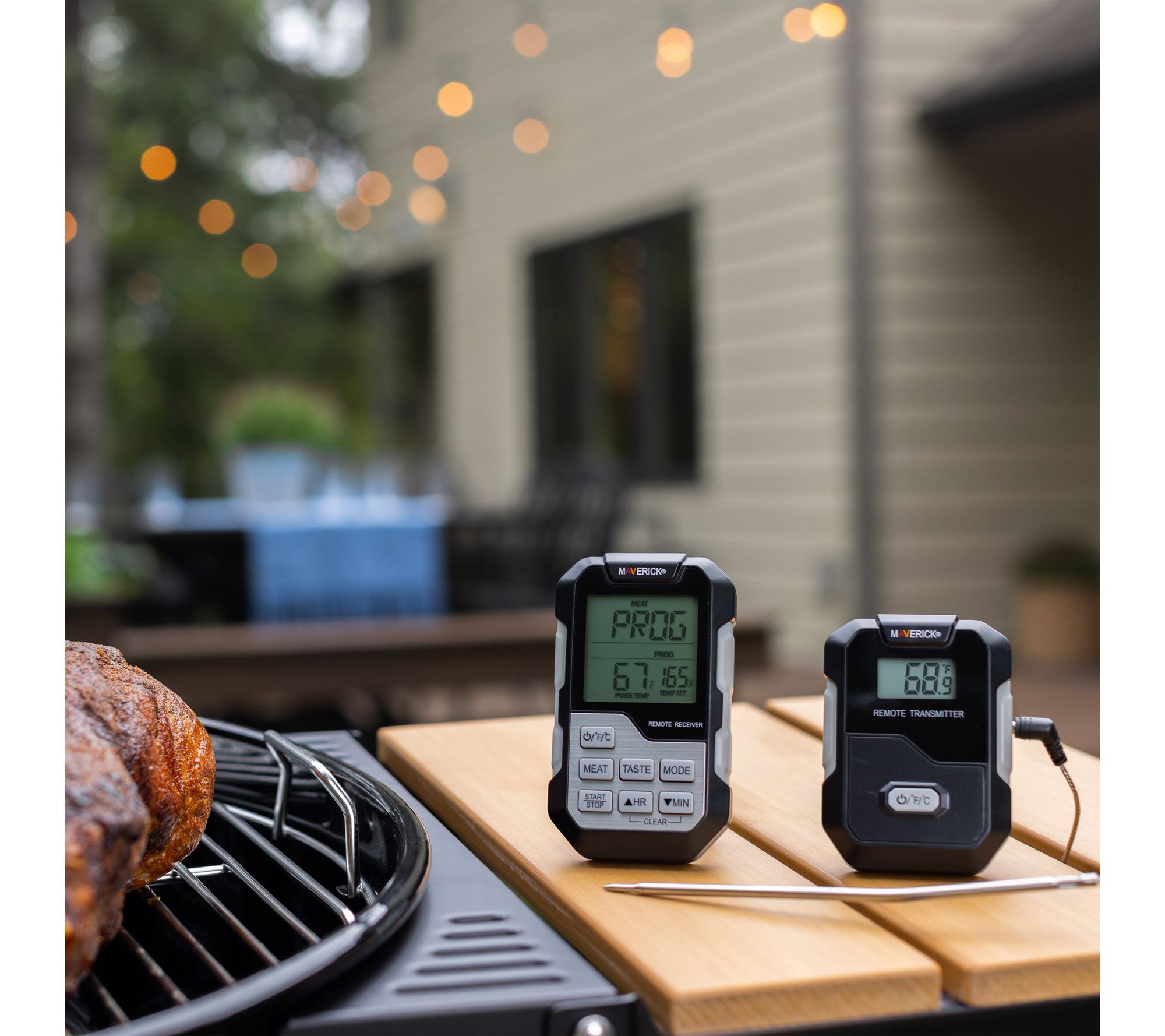 Whether you're hosting a backyard barbecue or perfecting your smoked brisket, this remote cooking thermometer lets you keep an eye on your grill from up to 300 feet away. Set custom alerts, monitor your cooking progress with a color-changing backlight, and enjoy complete control without being tethered to the grill. From Maverick.
