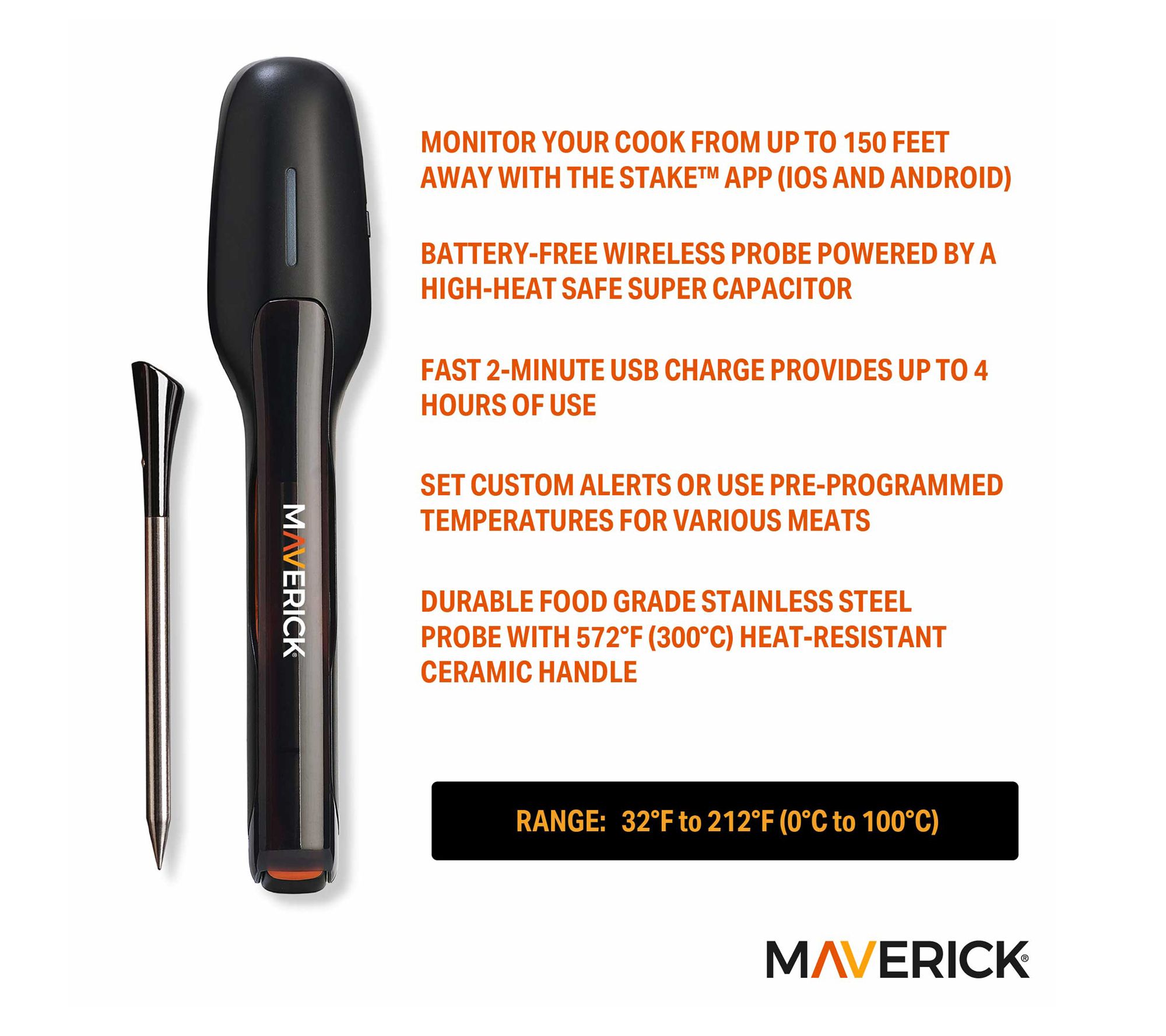 • Food grade stainless steel probe with 572F heat-resistant ceramic handle