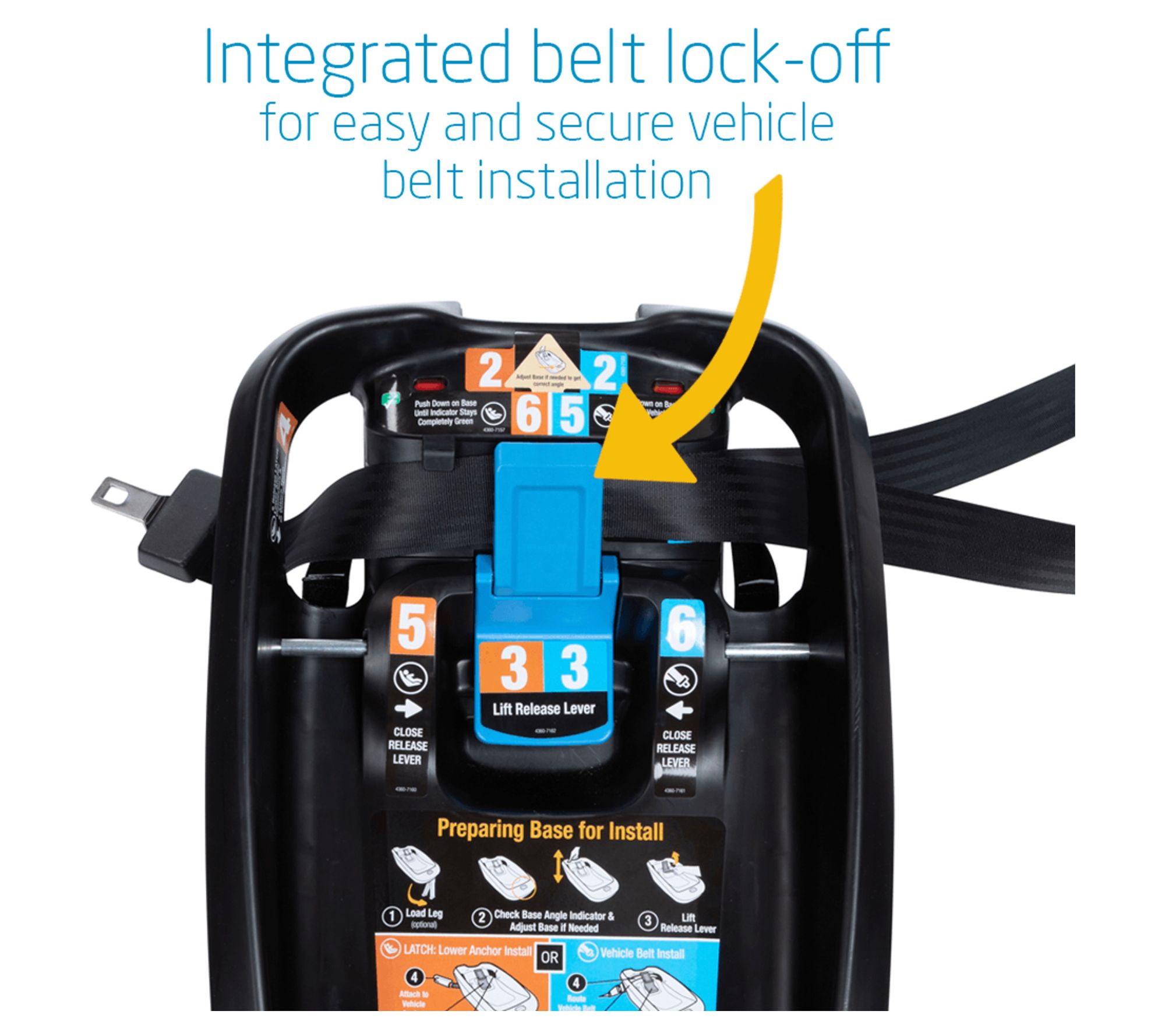 • Integrated belt lock-off for easy and secure vehicle belt installation