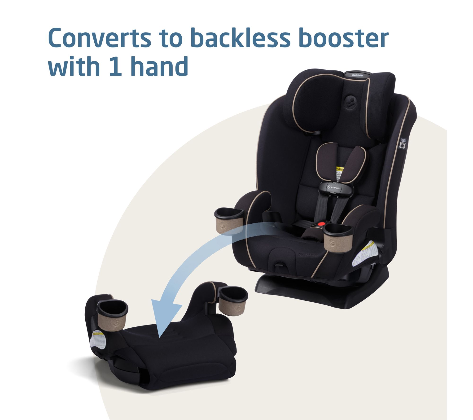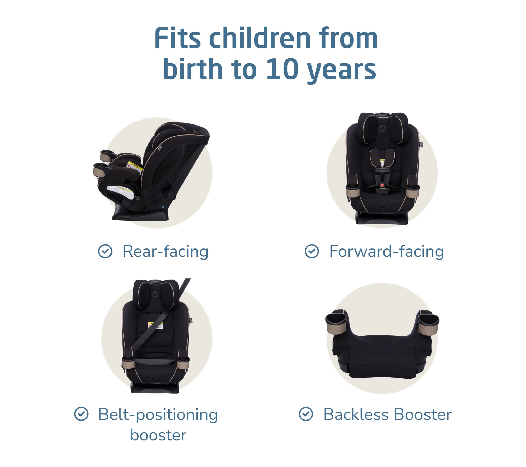Four modes: rear-facing car seat (5-40 lbs., 19-40 inches), forward-facing car seat (30-65 lbs., 34.4-49 inches), belt-positioning high back booster (40-100 lbs., 43.4-52 inches), and backless booster (40-100 lbs., 43.4-57 inches)