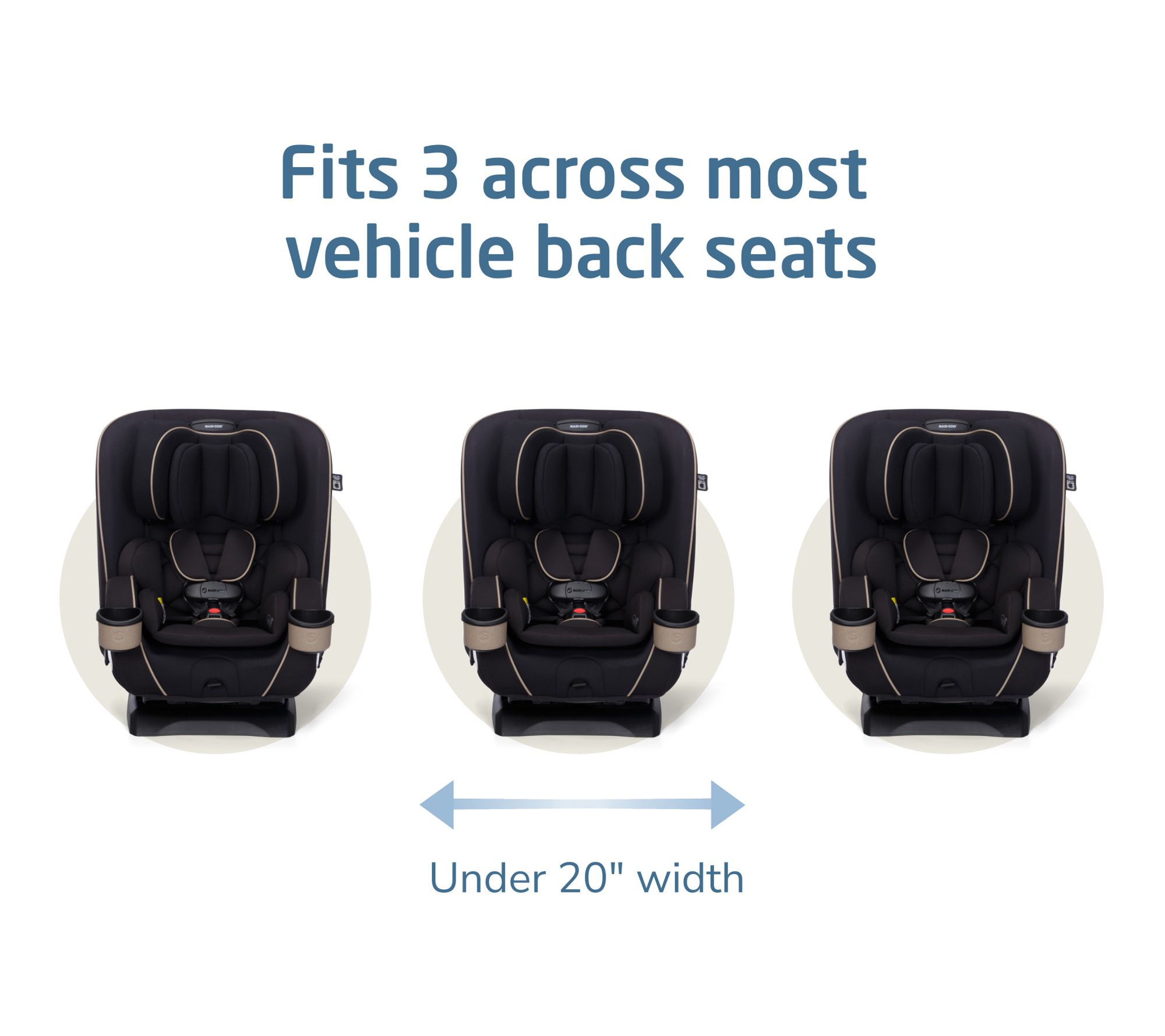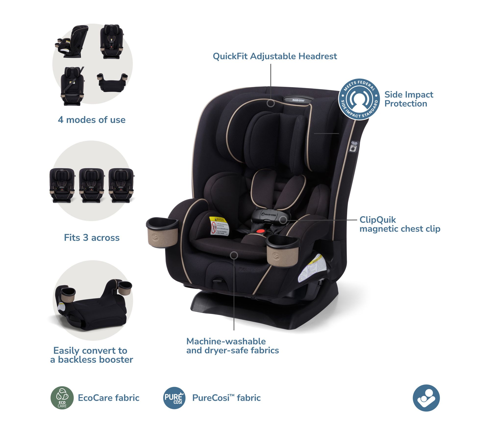 From morning drop-offs to cross-country road trips, this all-in-one car seat keeps your child comfortable and secure from birth through their big kid years. Thoughtfully designed to fit three across most back seats, it features easy-to-adjust harness and headrest positions, plush support, and quick-release buckling for smooth transitions at every stage. From Maxi-Cosi.