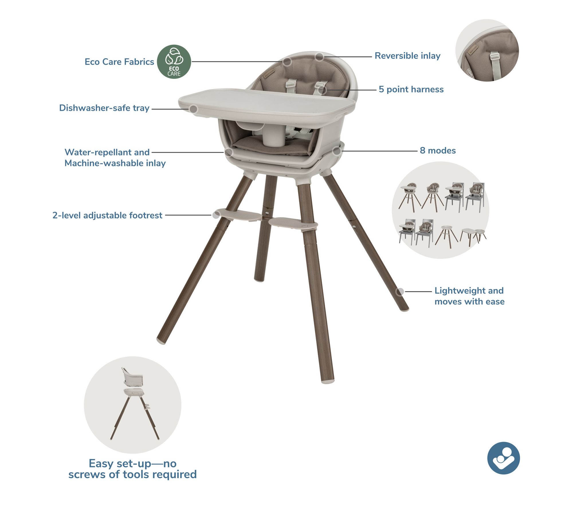 • Washable 5-point harness and dishwasher-safe insert tray