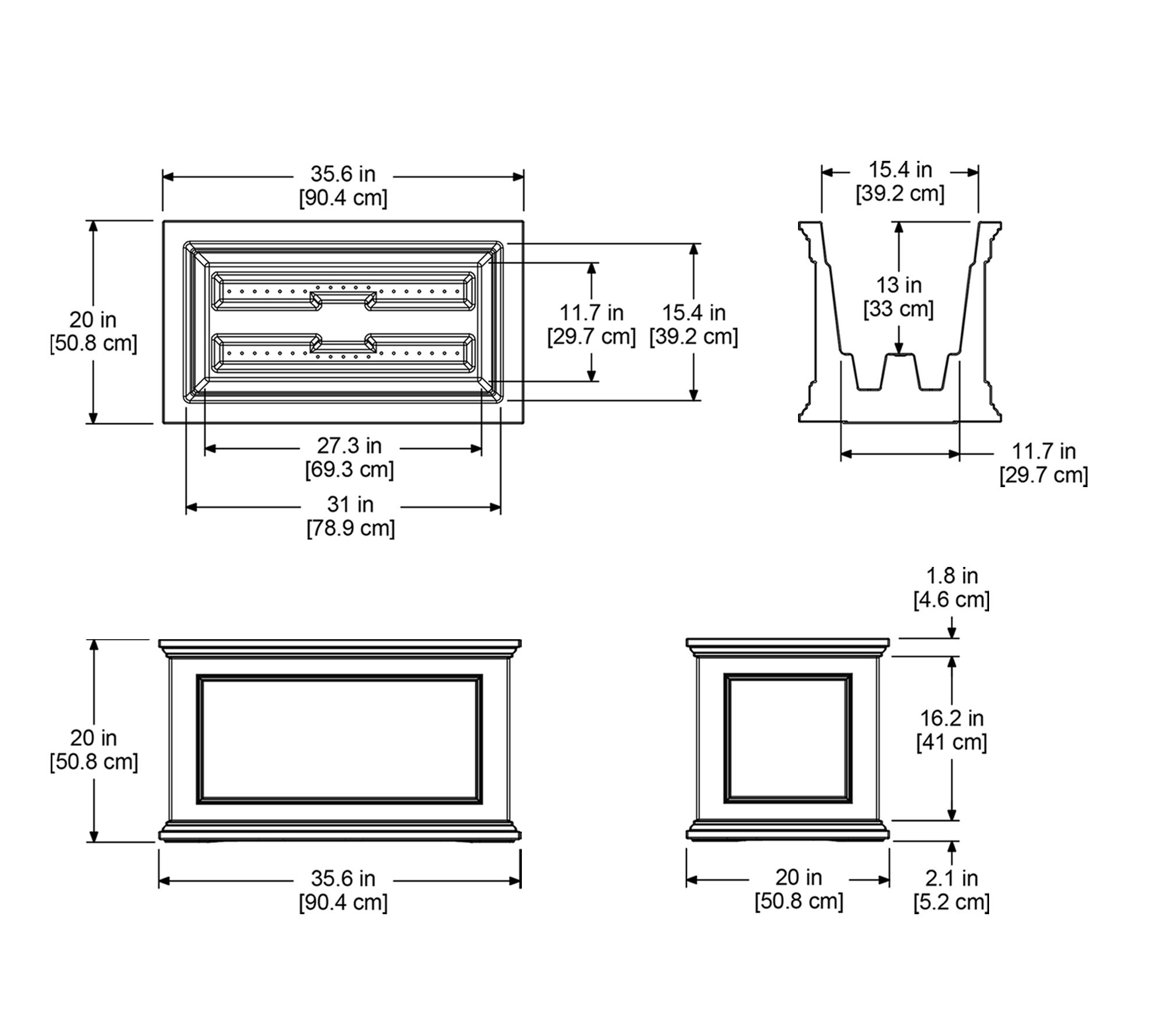 • Measurements: Outside 36"L x 20"W x 20"H; Inside 31"L x 15"W x 13"D