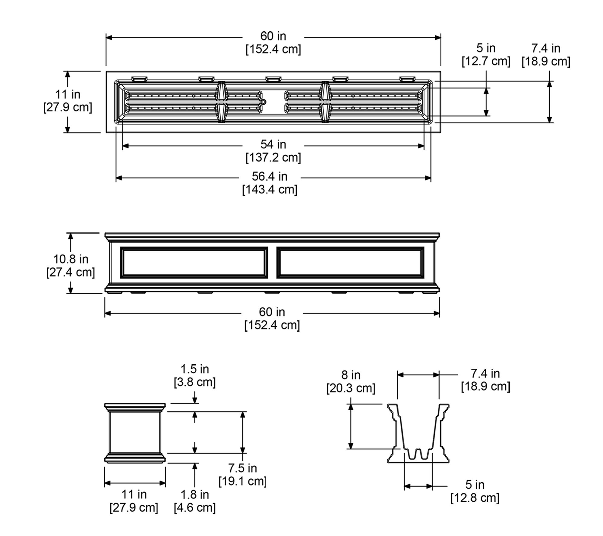 • Measurements: Outside 60"L x 11"W x 11"H; Inside 56"L x 7"W x 8"D