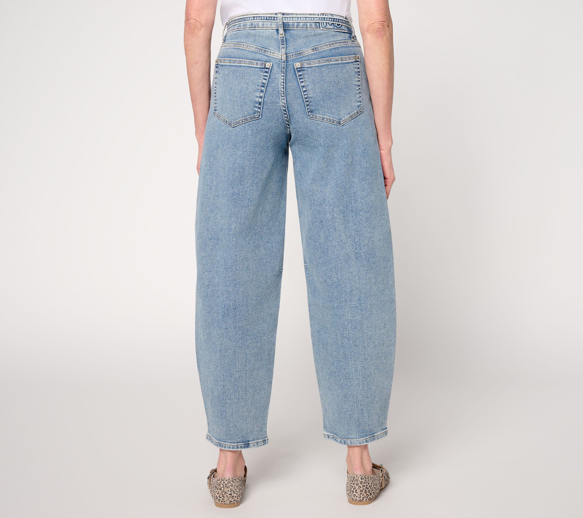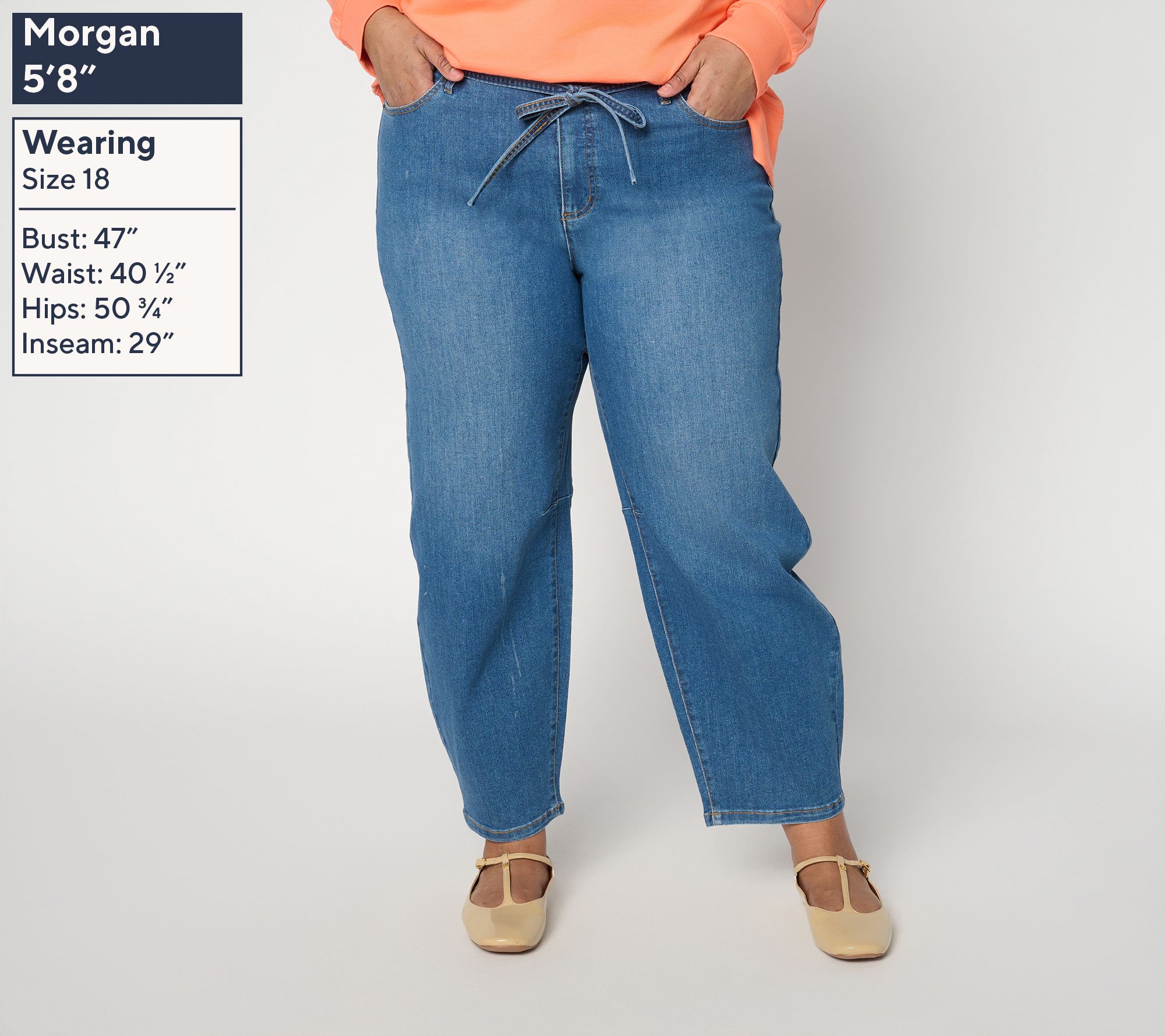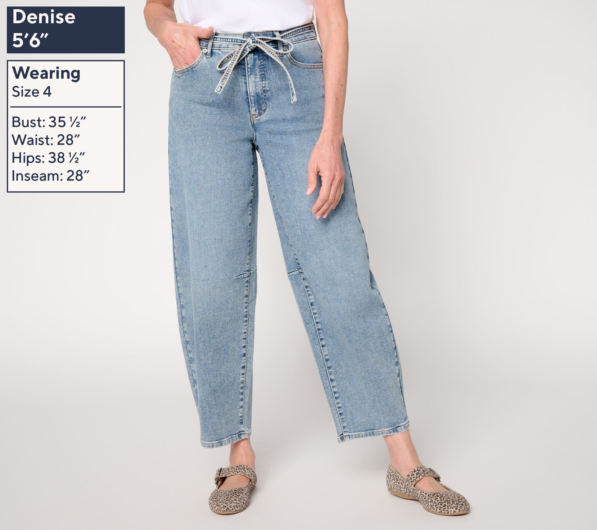 Fit to be tied! Style these denim pants for a coffee date or weekend errands and enjoy an easy, pulled-together vibe. Barrel-shaped legs, a tres-chic skinny self-tie at the waist, and classic five-pocket details create a modern fashion moment. From Me by Jenni Garth.