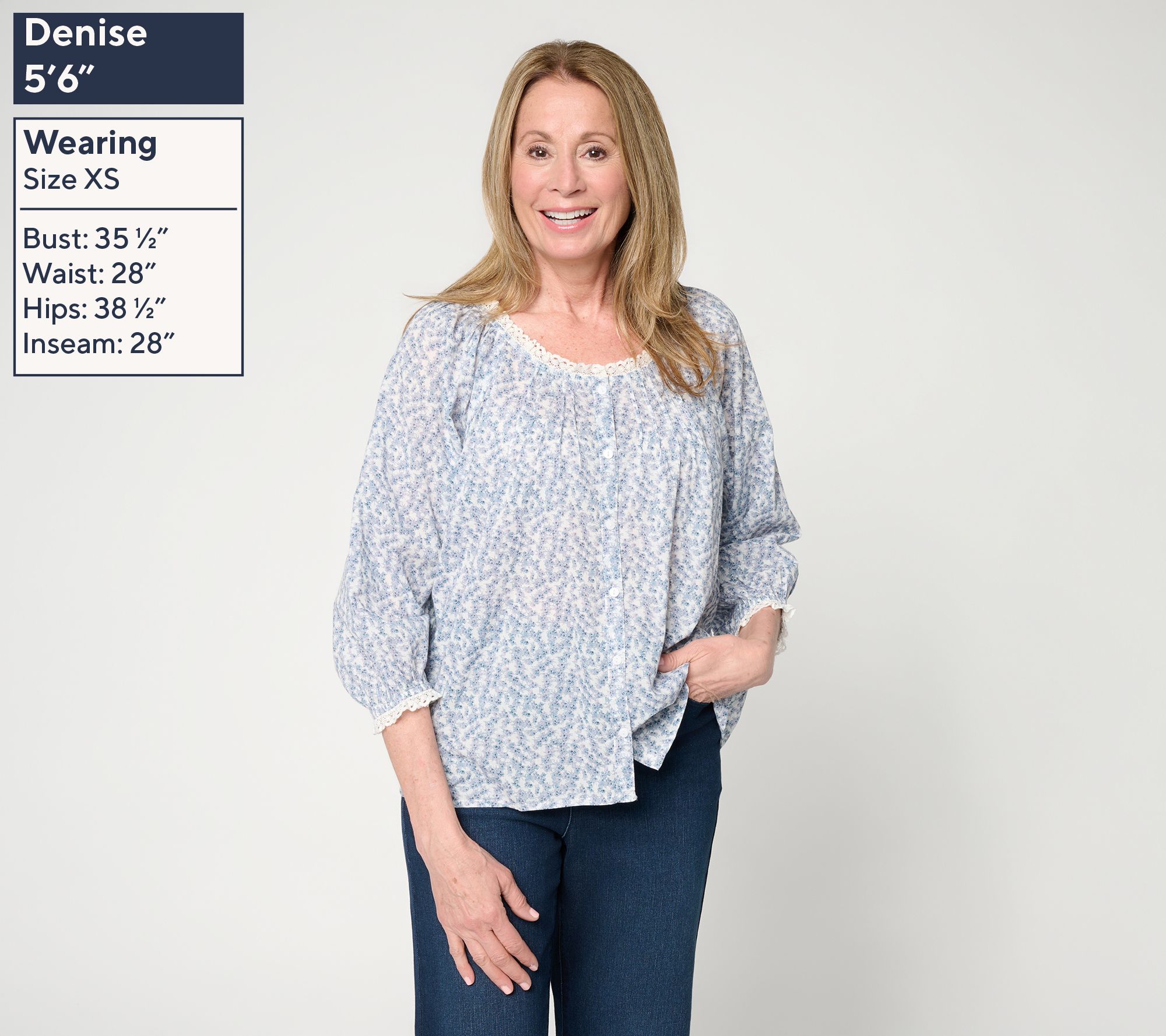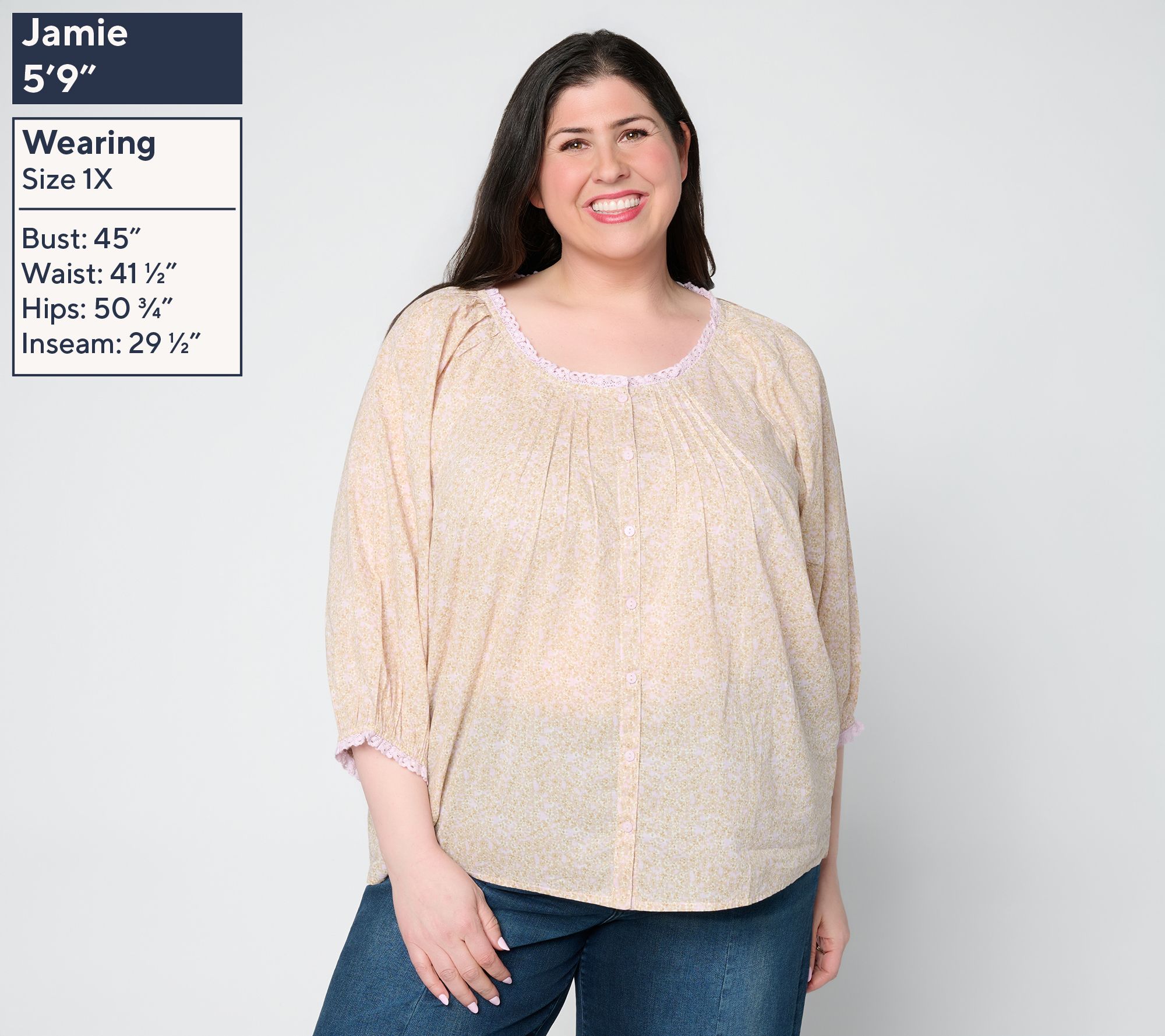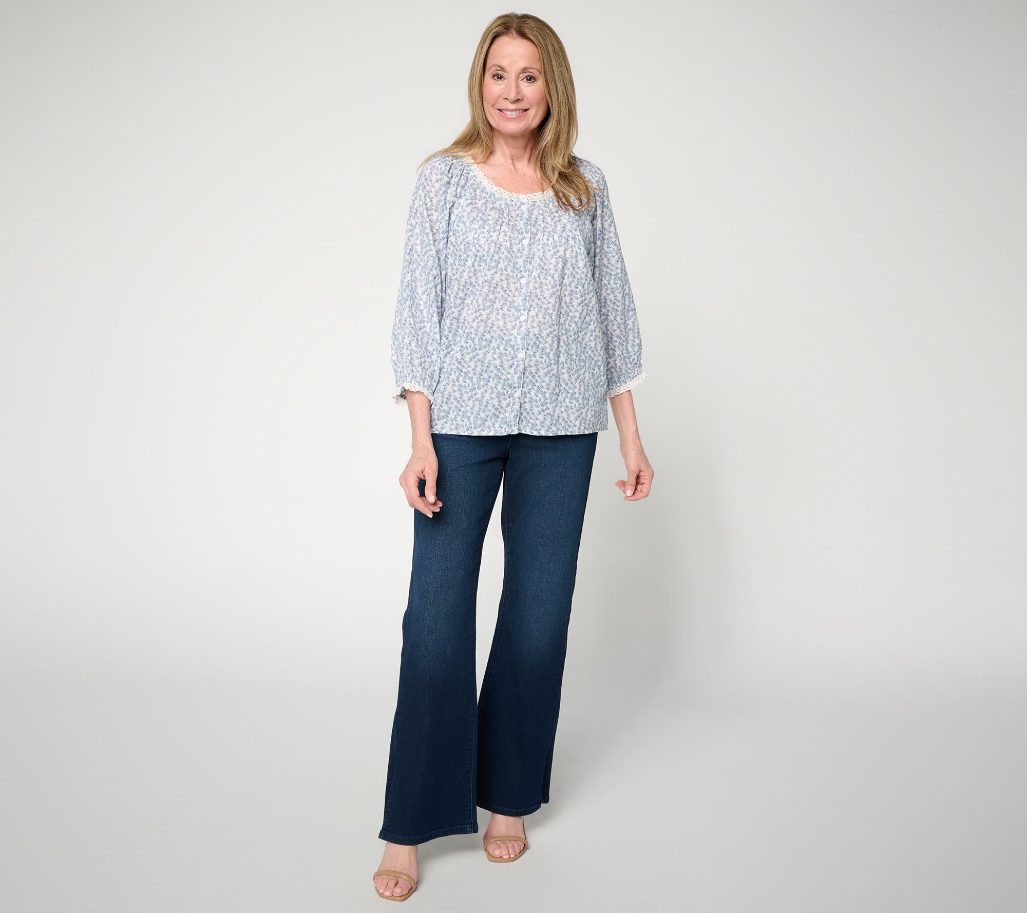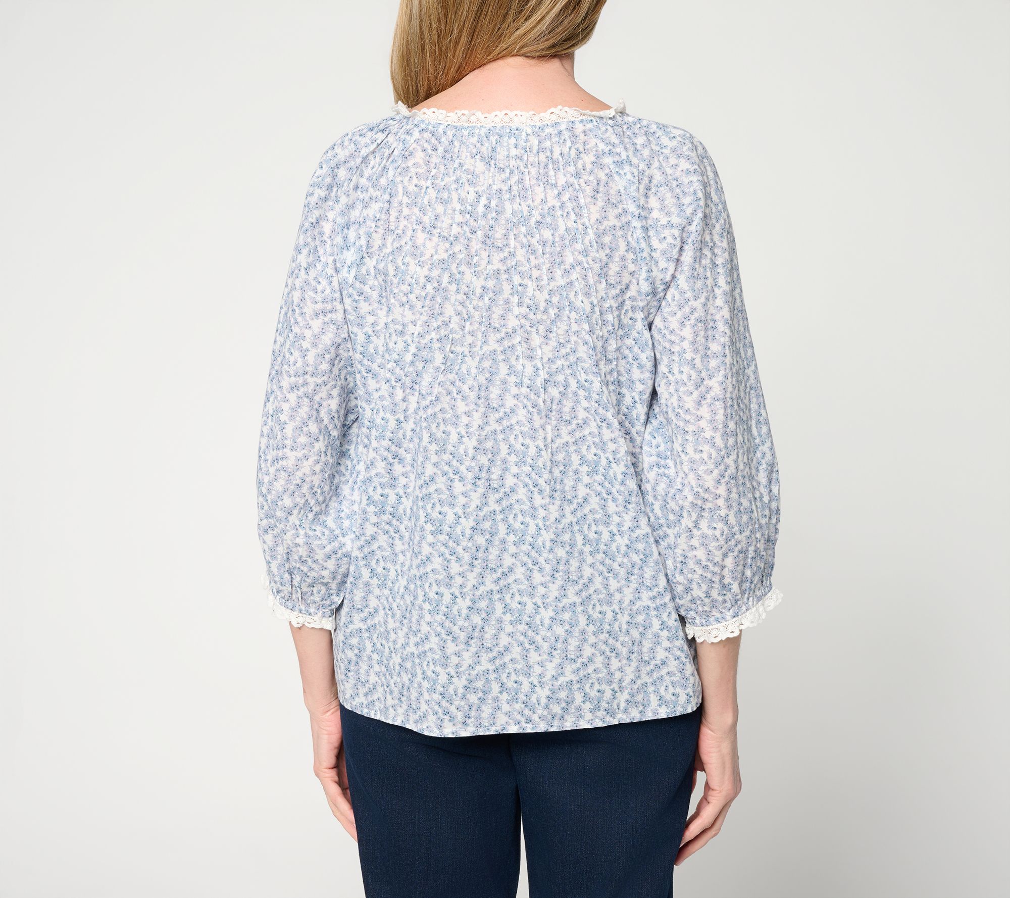 A sunny lunch date or botanical garden visit calls for the easygoing elegance of this woven cotton blouse, with delicate lace trim outlining the open neckline and airy sleeves. Front and back pintucks add subtle texture, while a functional button placket invites versatile wear from casual coffee runs to relaxed afternoons. From Jennie Garth.