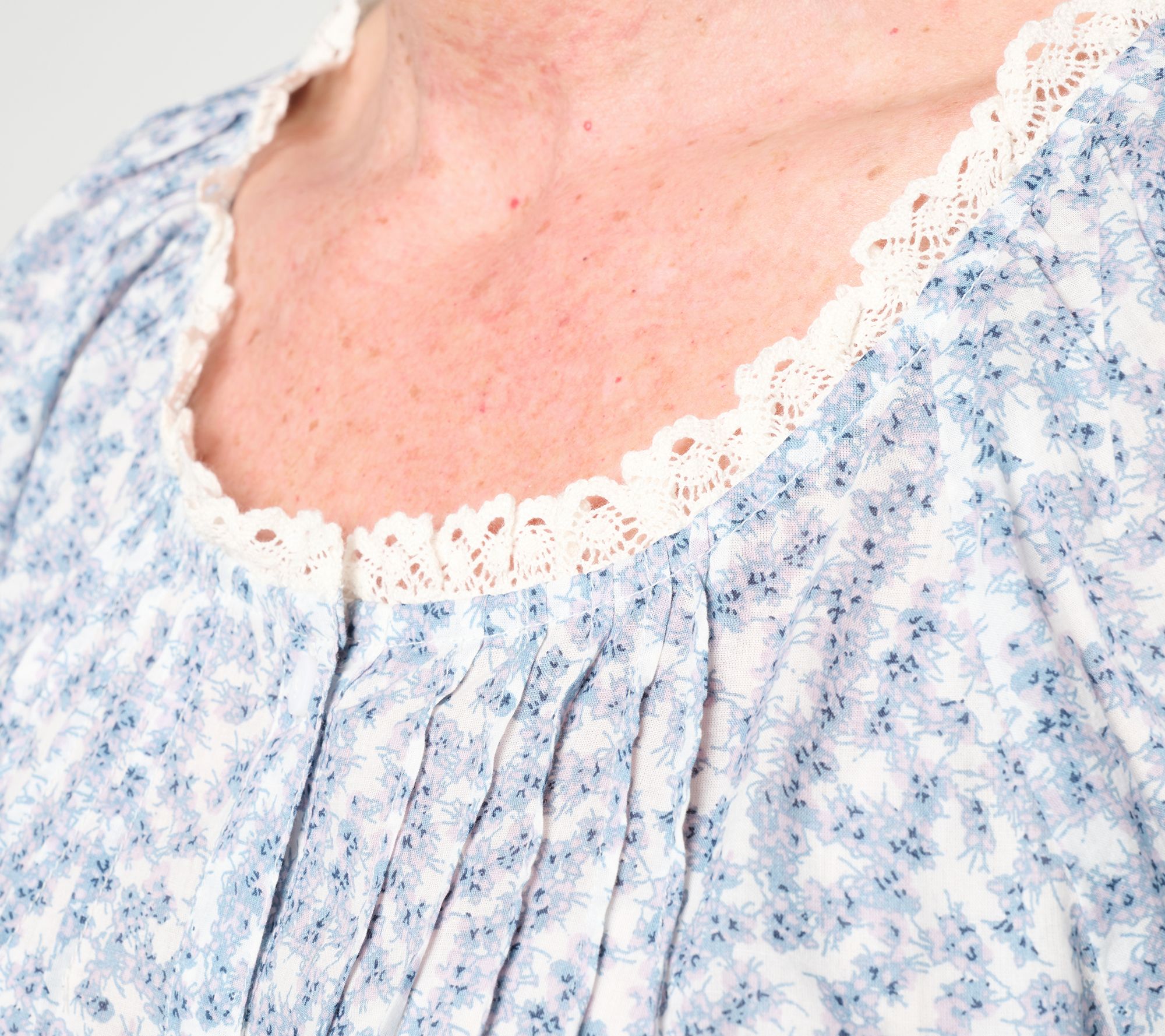 Features: printed, lace-trimmed open neckline and sleeve openings, front and back pintucks, shirred raglan sleeves, button-front closure