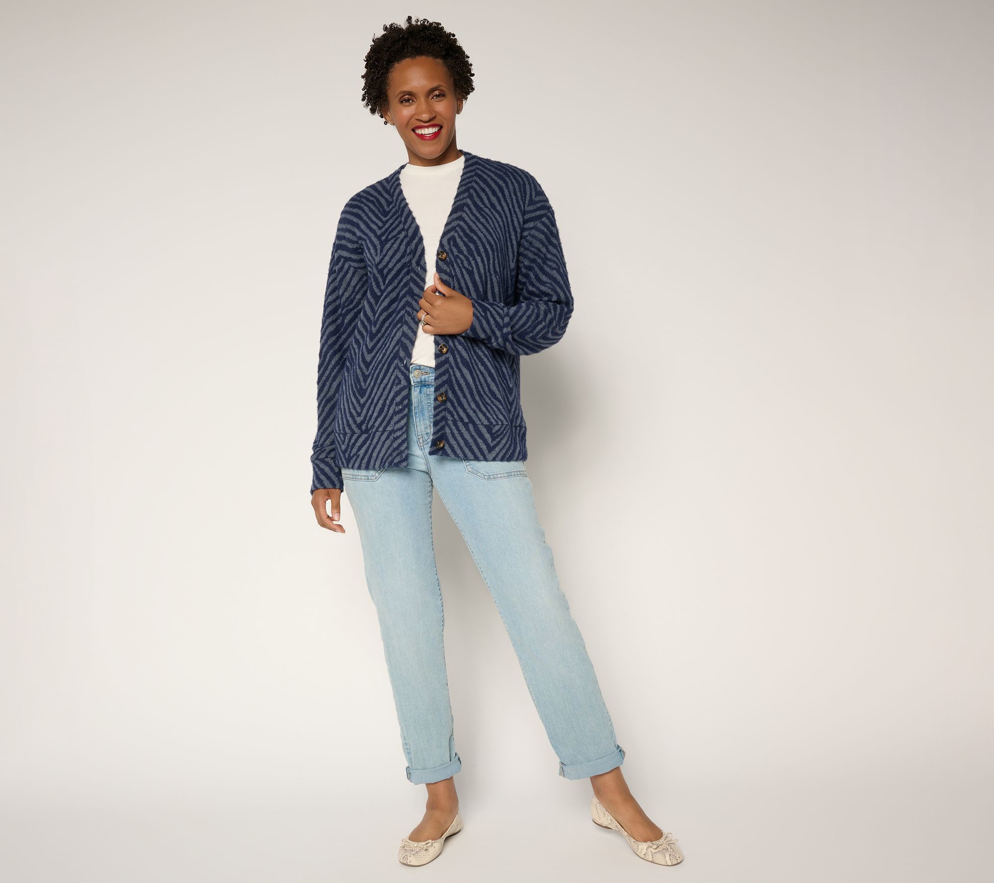 All-day errands or spontaneous get-togethers call for a cardigan that balances chic and cozy vibes. With its relaxed fit and striking jacquard design, this knit adds stand-out style to your jeans-and-tee days or layers beautifully over dresses for that extra touch of flair. From Me by Jennie Garth.