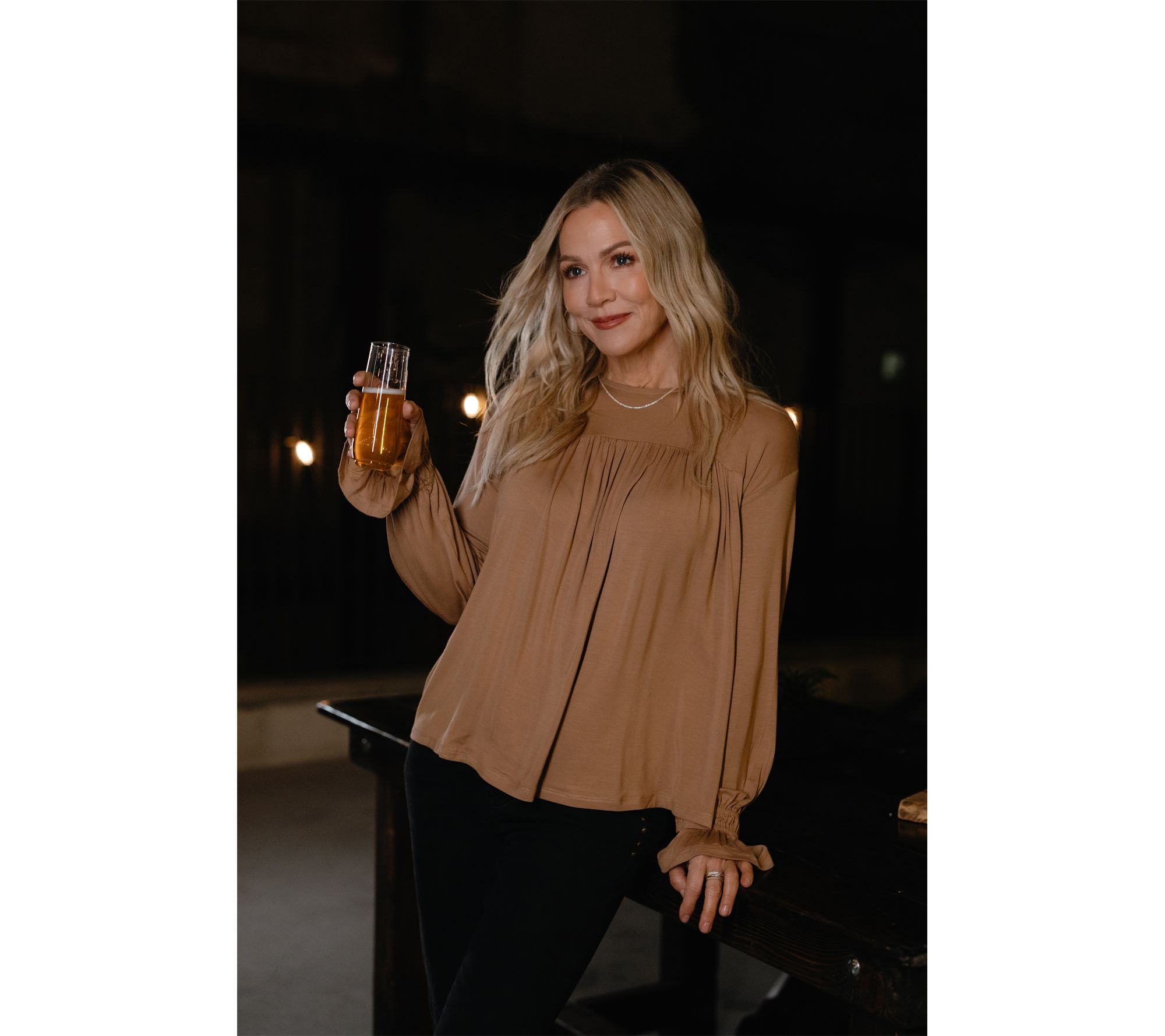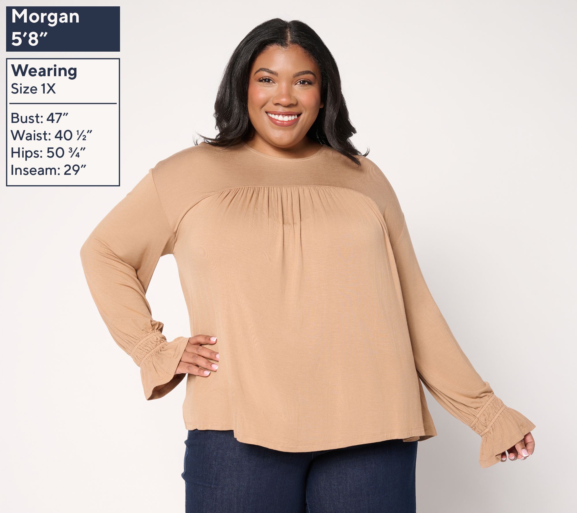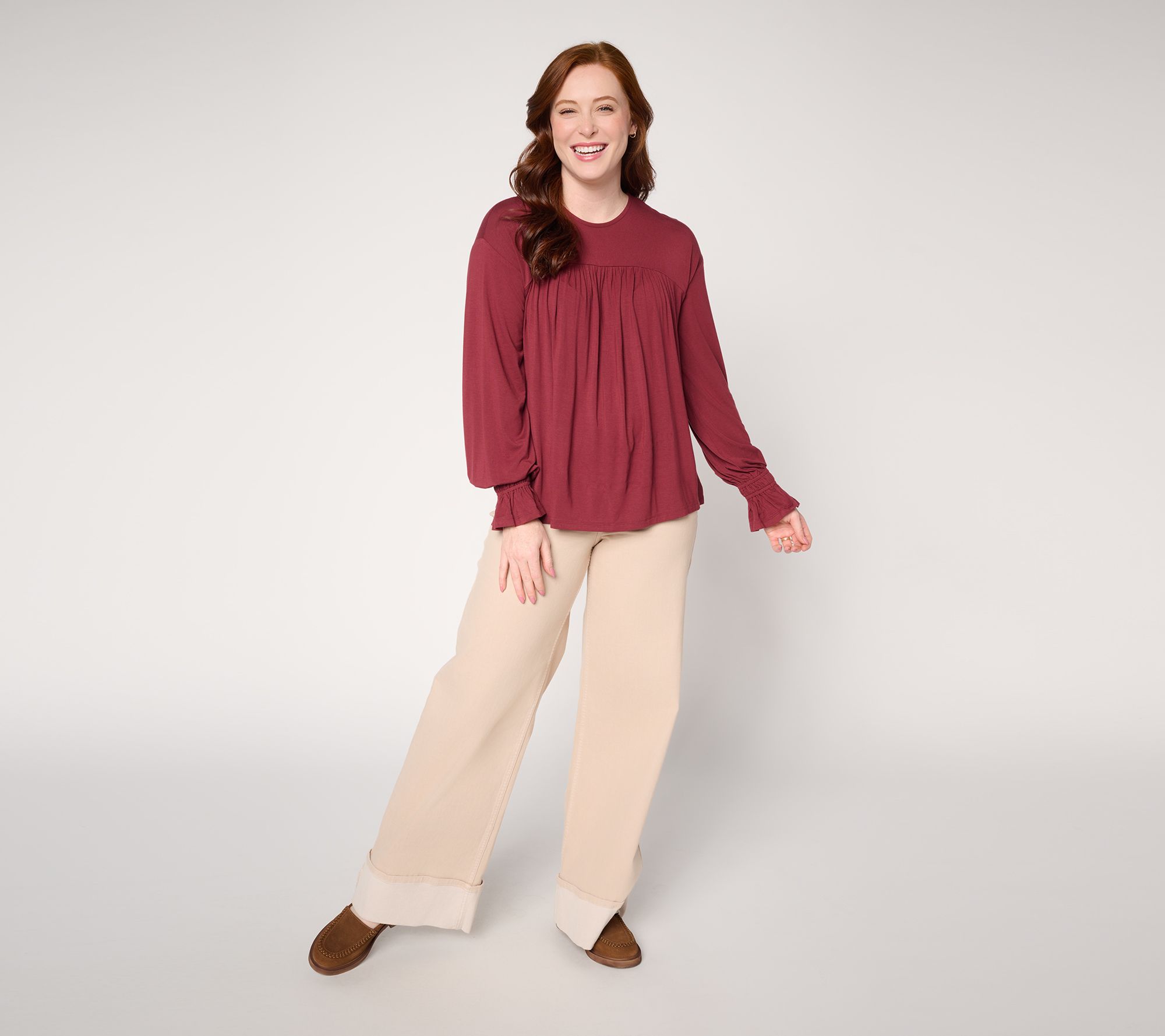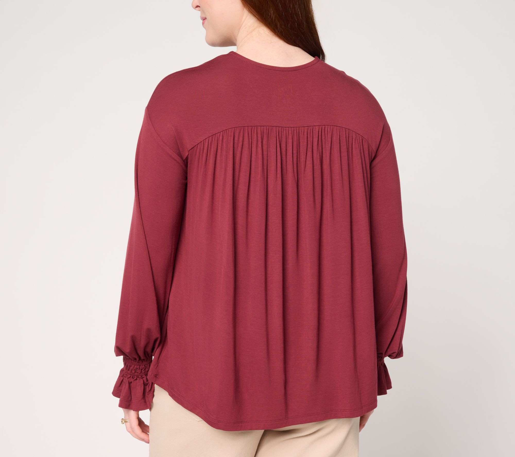 Stay comfortable through morning meetings, weekend plans, or travel with this soft knit blouse, crafted for easy elegance wherever your day takes you. Shirred detailing along the curved yoke and sleeves add movement and dimension, while elastic and ruffled cuffs lend a feminine touch. From Me by Jennie Garth.