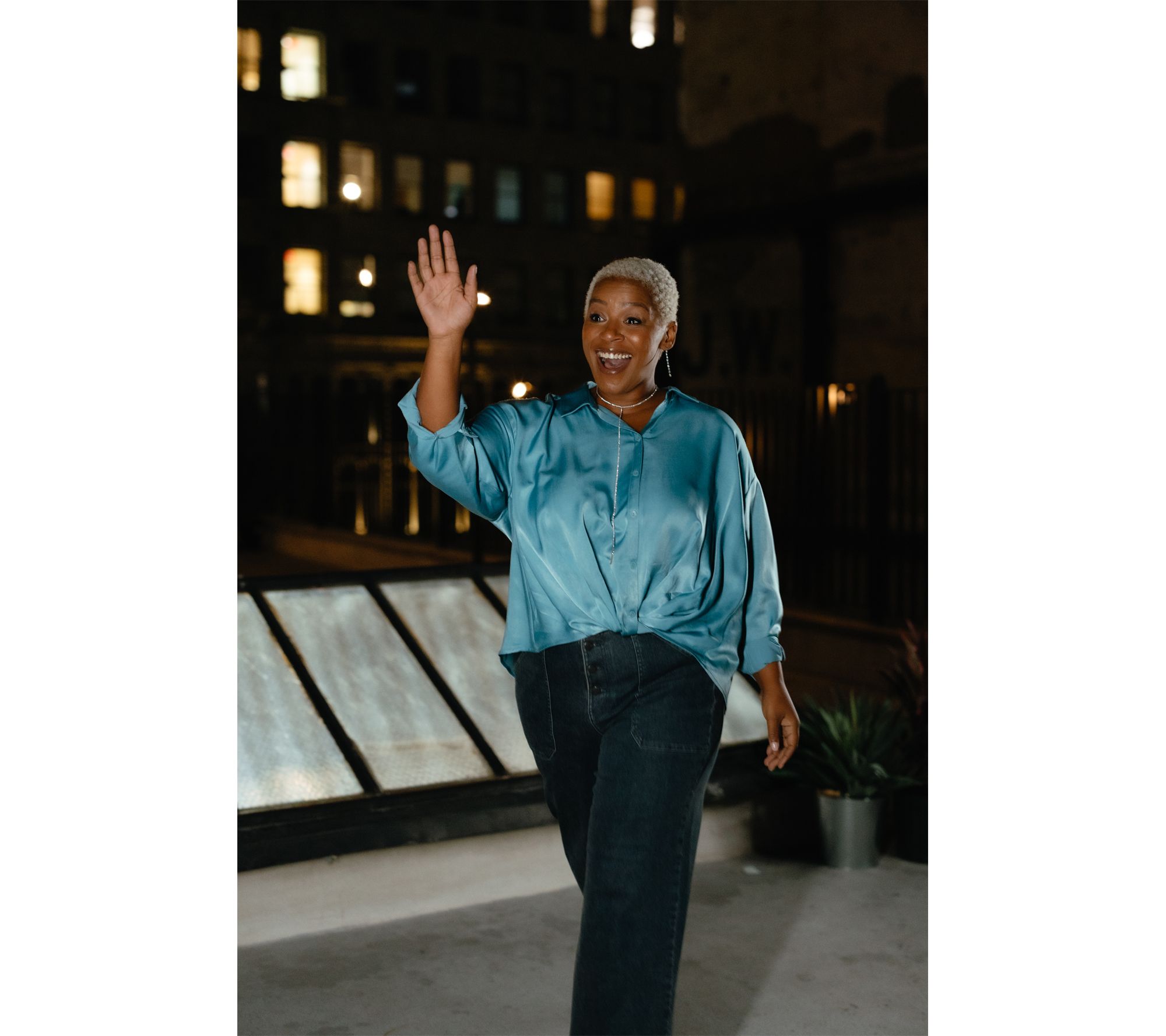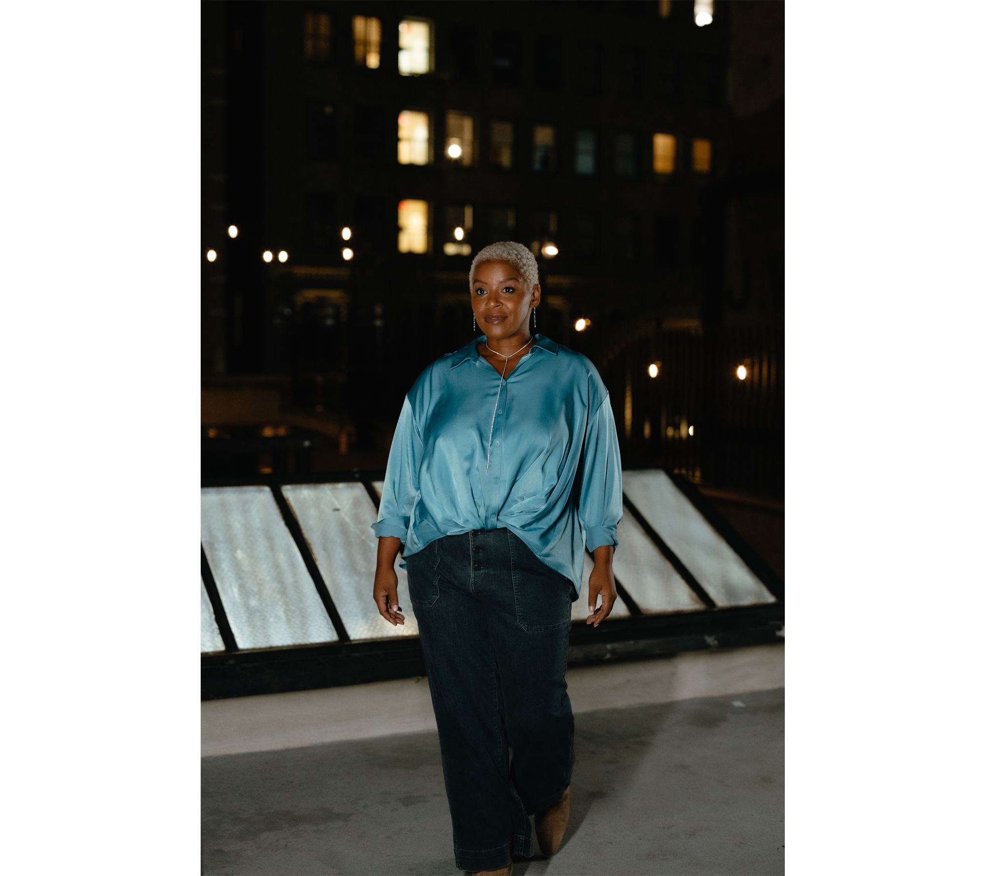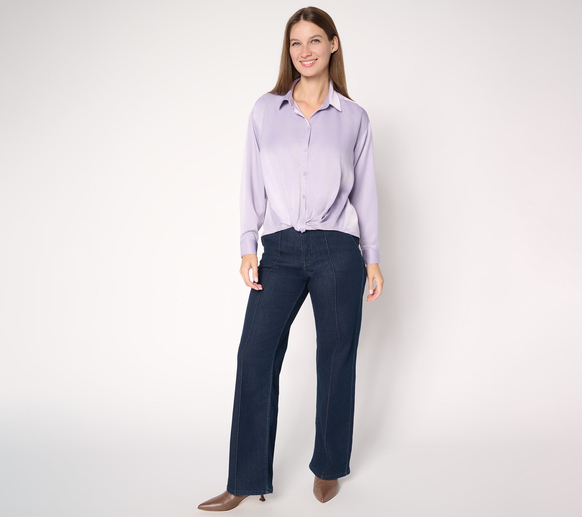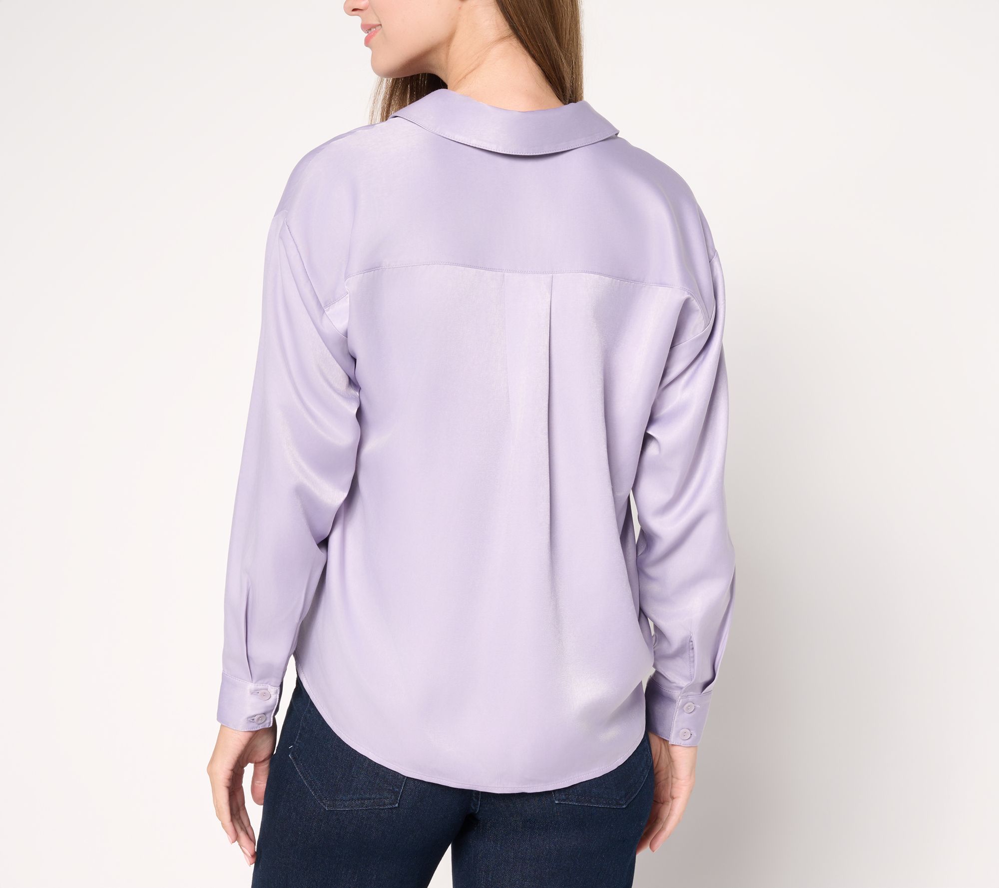 Heading into a dinner date or updating your workday wardrobe, this satin blouse offers relaxed sophistication and effortless charm. The stylish twist front detail and dropped shoulders flatter your shape while button cuffs and a classic collar add tailored polish to each look. From Me by Jennie Garth.