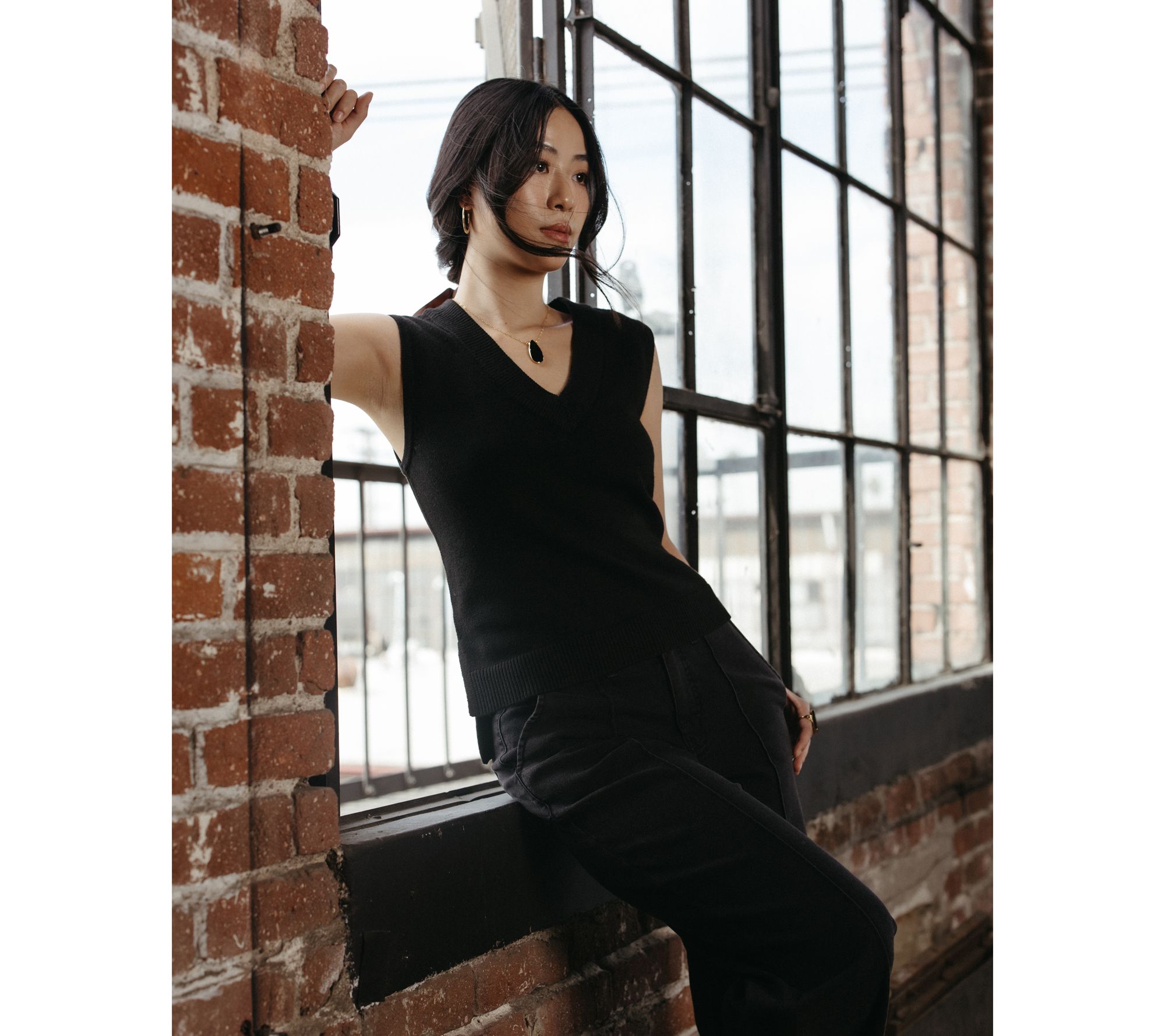 • Features: ribbed V-neckline and bottom hem, high-low hem, sleeveless