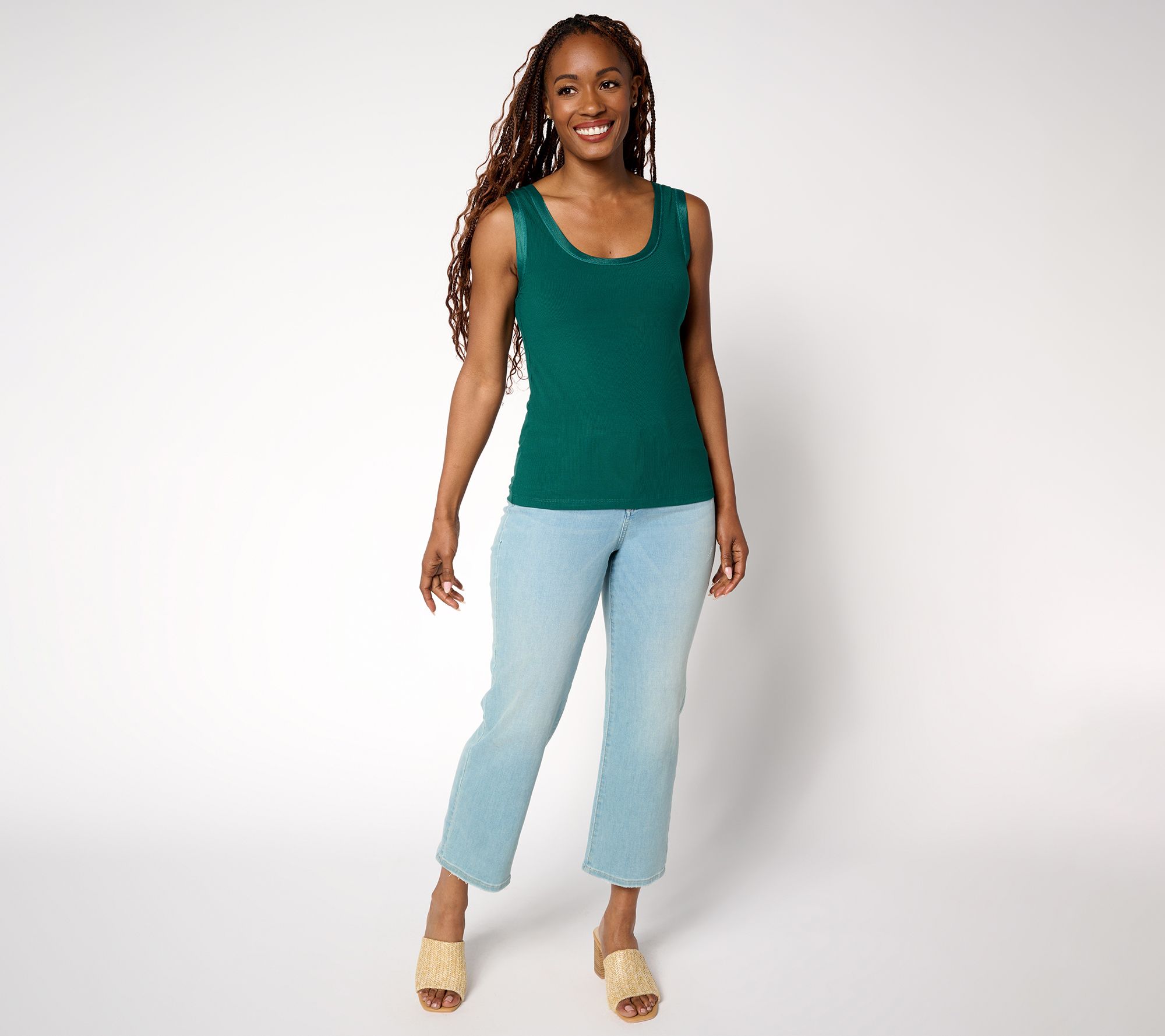 From casual weekends to evenings with friends, this reversible knit tank brightens up your wardrobe options -- and your favorite jean jacket. (Jennie's got a few of those!). Designed to flatter with its fitted silhouette and clever mesh band detail at the neck and armholes, it delivers effortless polish whether worn solo or as a base layer. From Me by Jennie Garth.