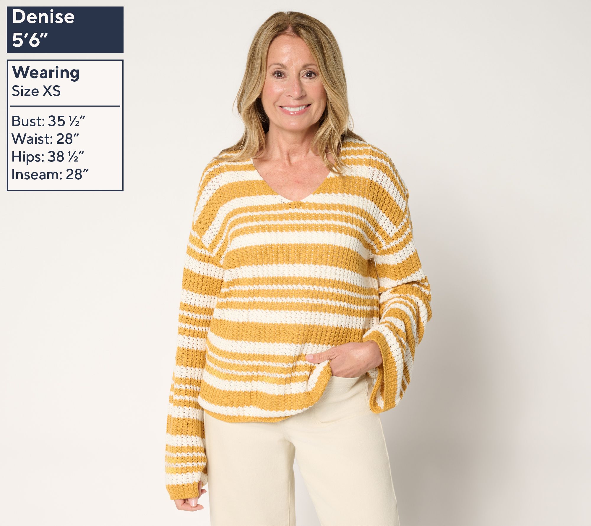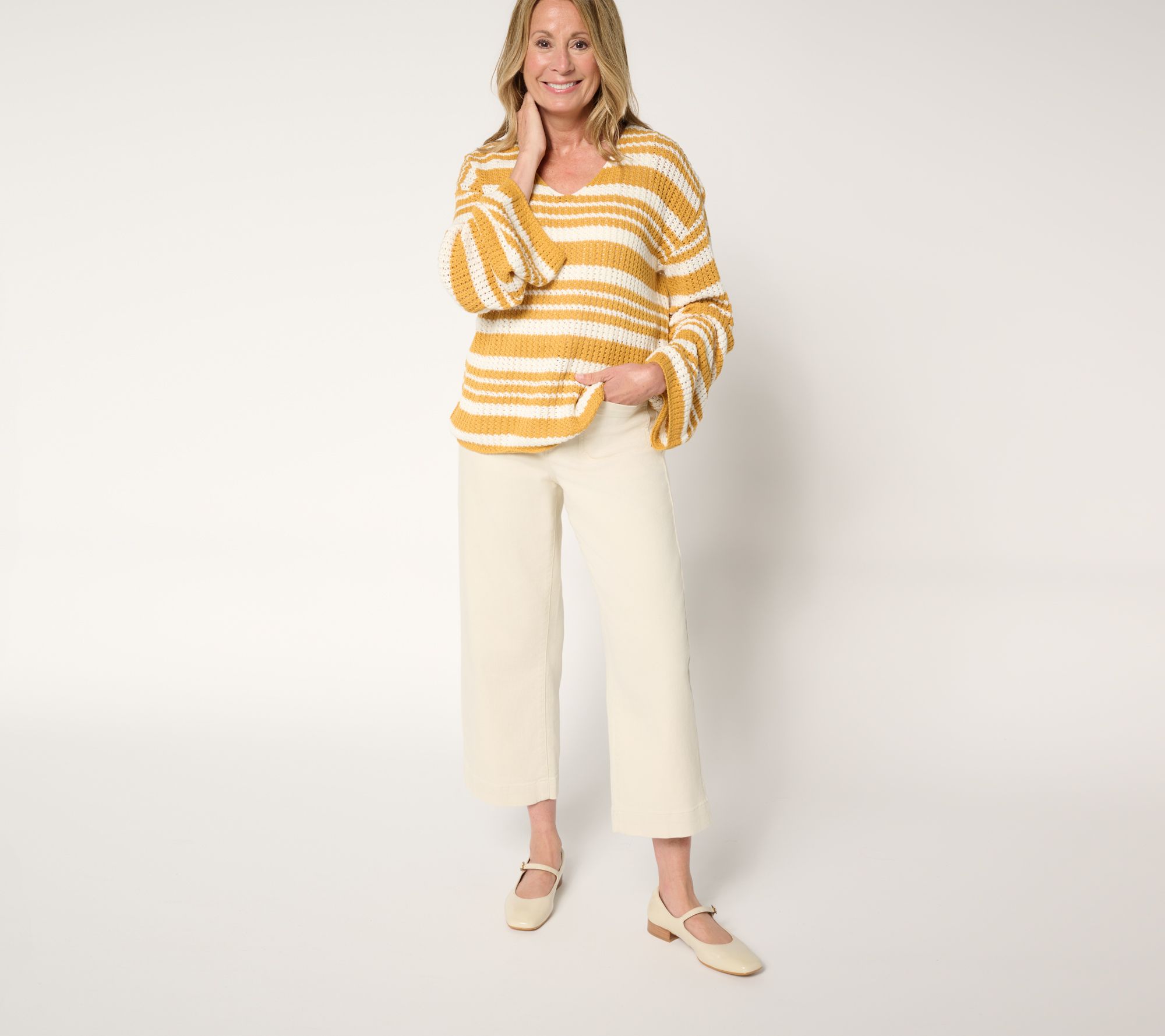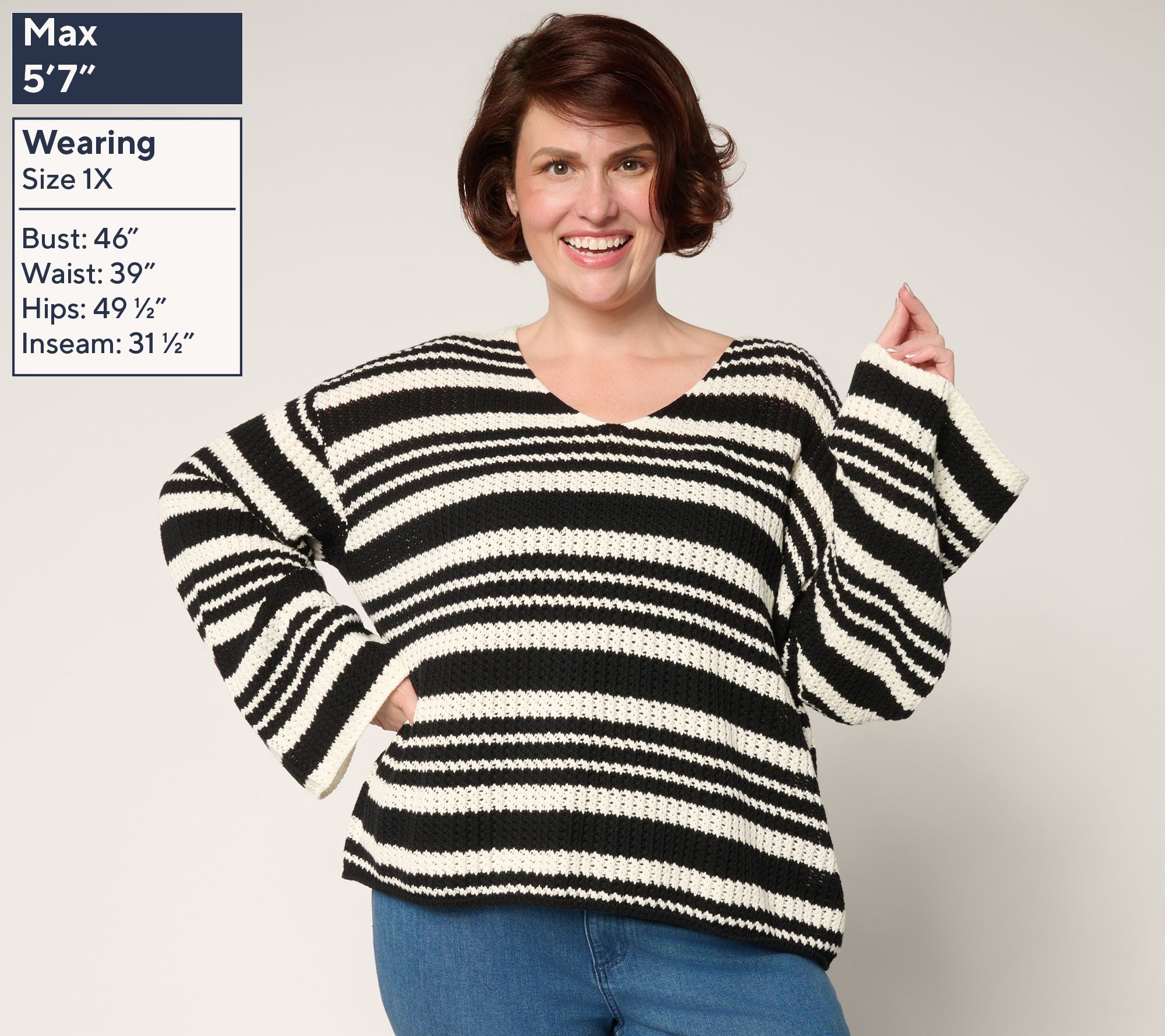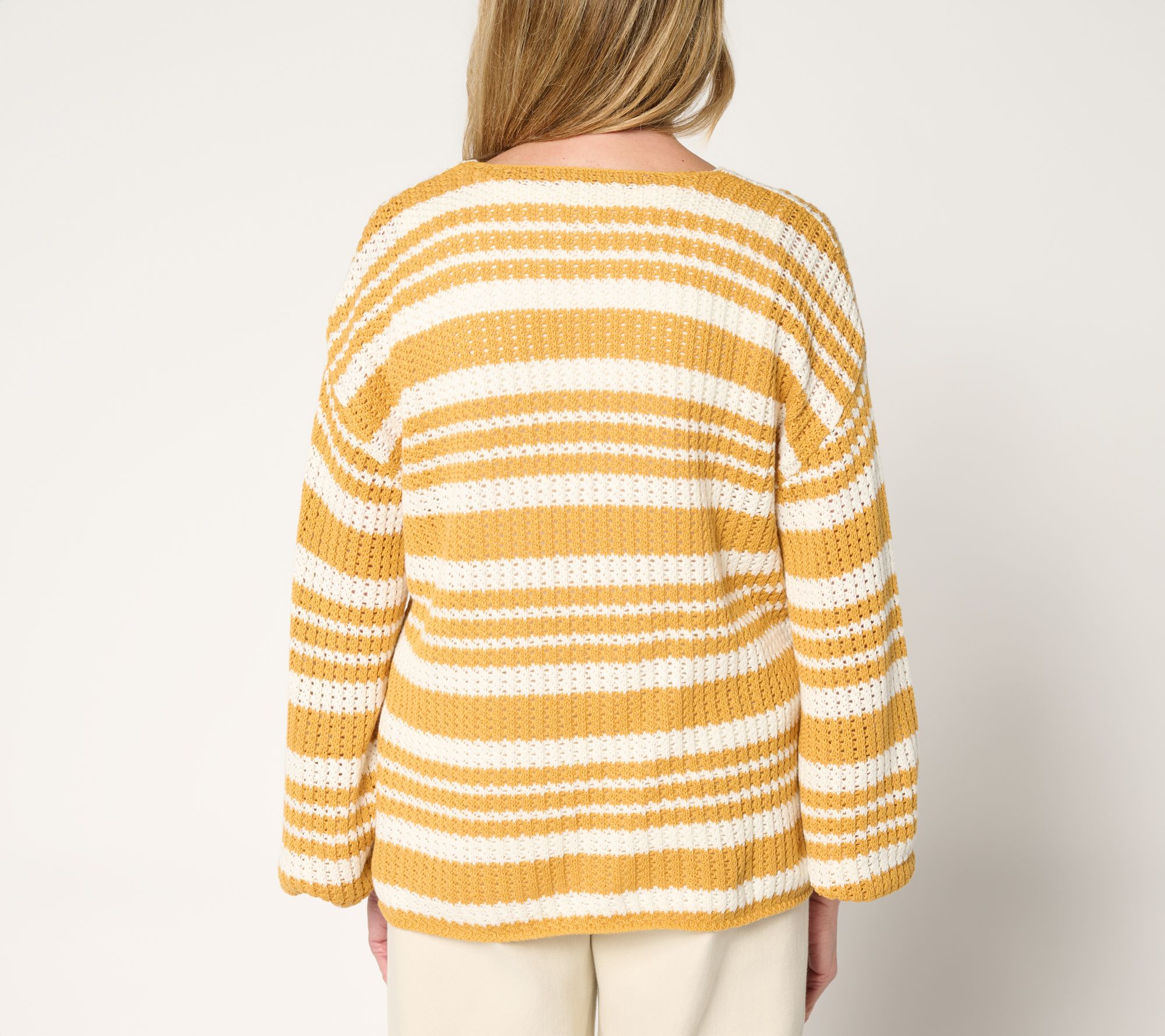 Bold stripes give this pullover sweater a playful twist that's ready for relaxed days or casual plans. The open V-neckline and wide bell sleeves add airy movement, while dropped shoulders create a laid-back silhouette. Style it over your favorite jeans or leggings for effortless all-day comfort. From Me by Jennie Garth.