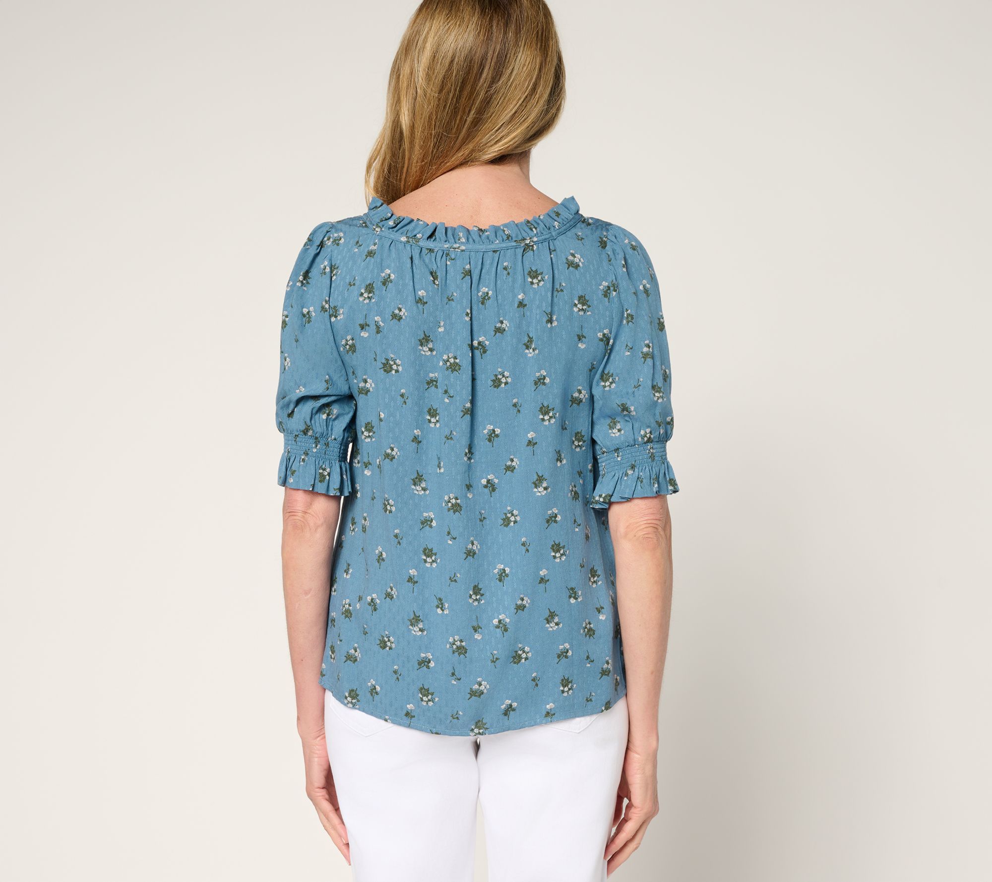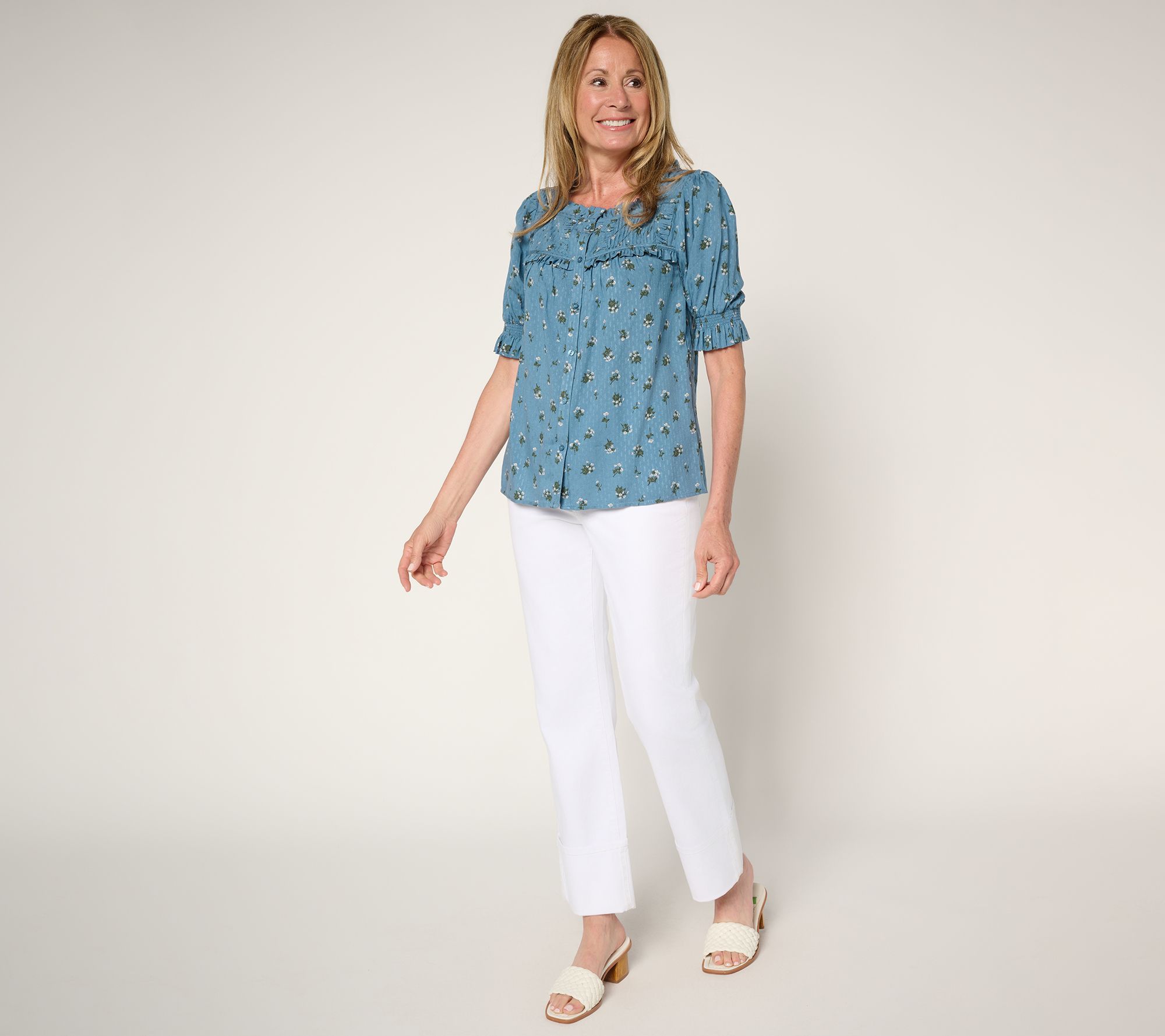 Where you go, sunshine follows in this sweetly detailed marigold blouse. The squared neckline, ruffled accents, and delicate pintucking layer on the charm for lunch dates, special gatherings, and weekend trips. Pair it with sleek pants or a casual skirt -- and lots of warm happy greetings! From Me by Jennie Garth.
