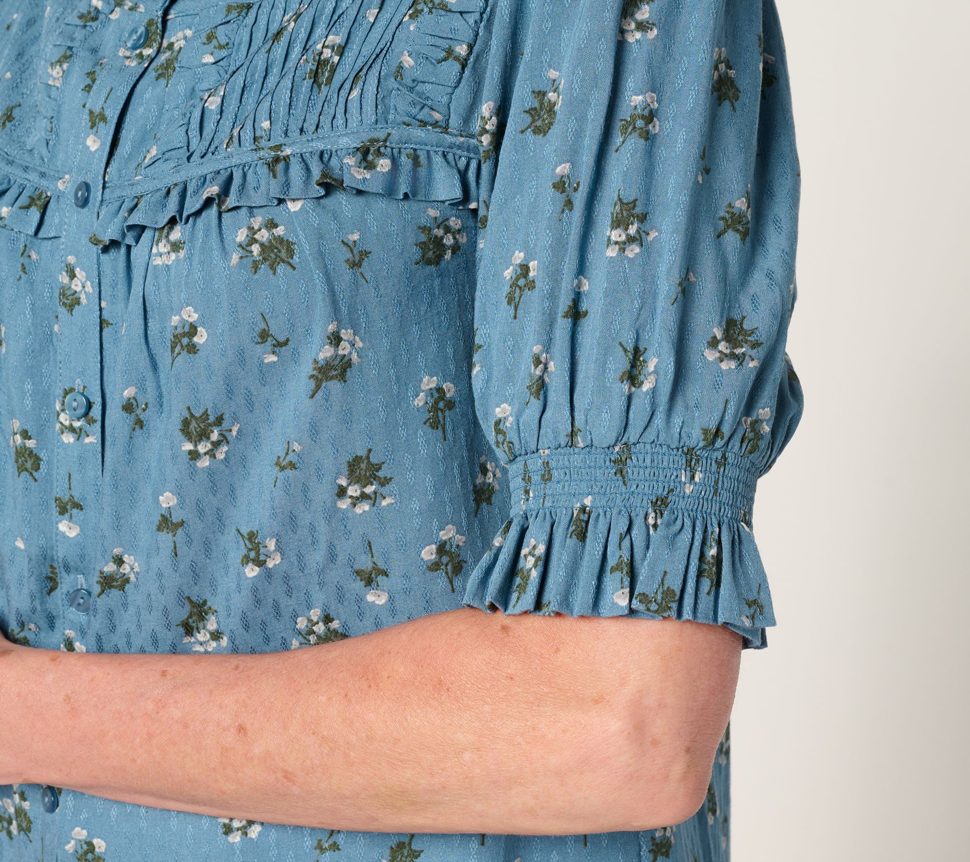 Features: printed design, shirred and ruffled squared neckline and yoke, pintucking and smocking details, ruffled puff sleeves