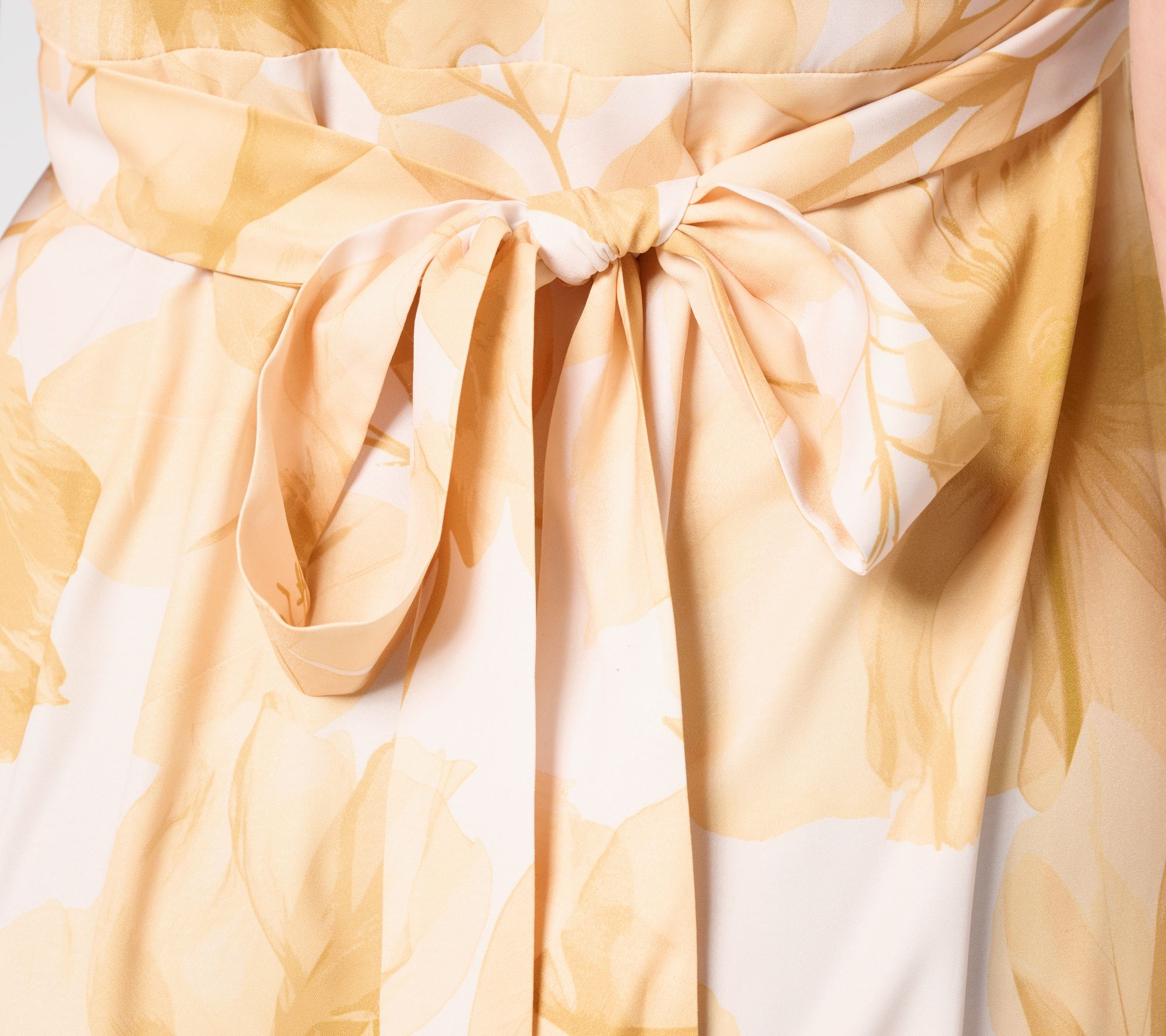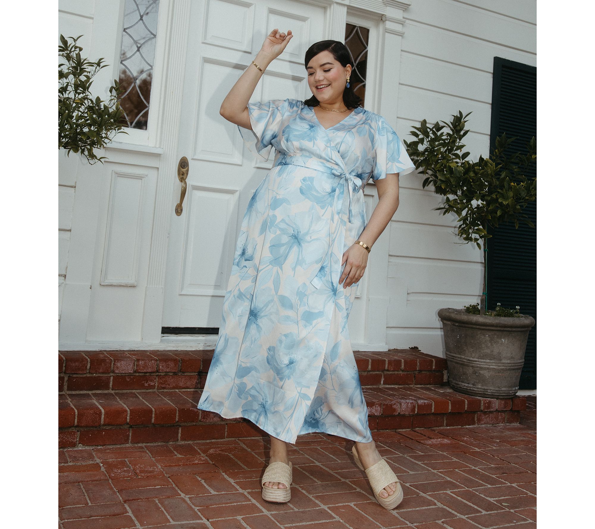Celebrate special moments such as weddings and graduations with the enchanting print and sweet touches of this Camellia dress. Its wrap design and flutter sleeves make it a feminine, flattering choice. From Me by Jennie Garth.