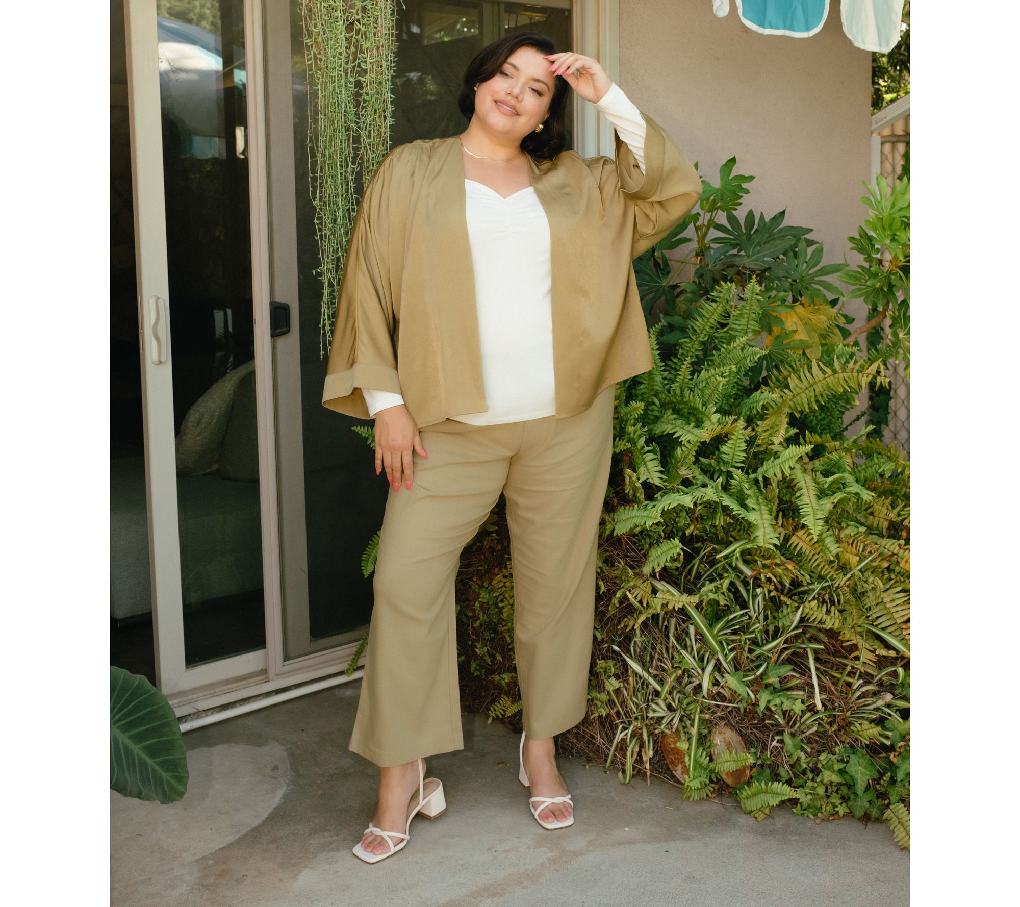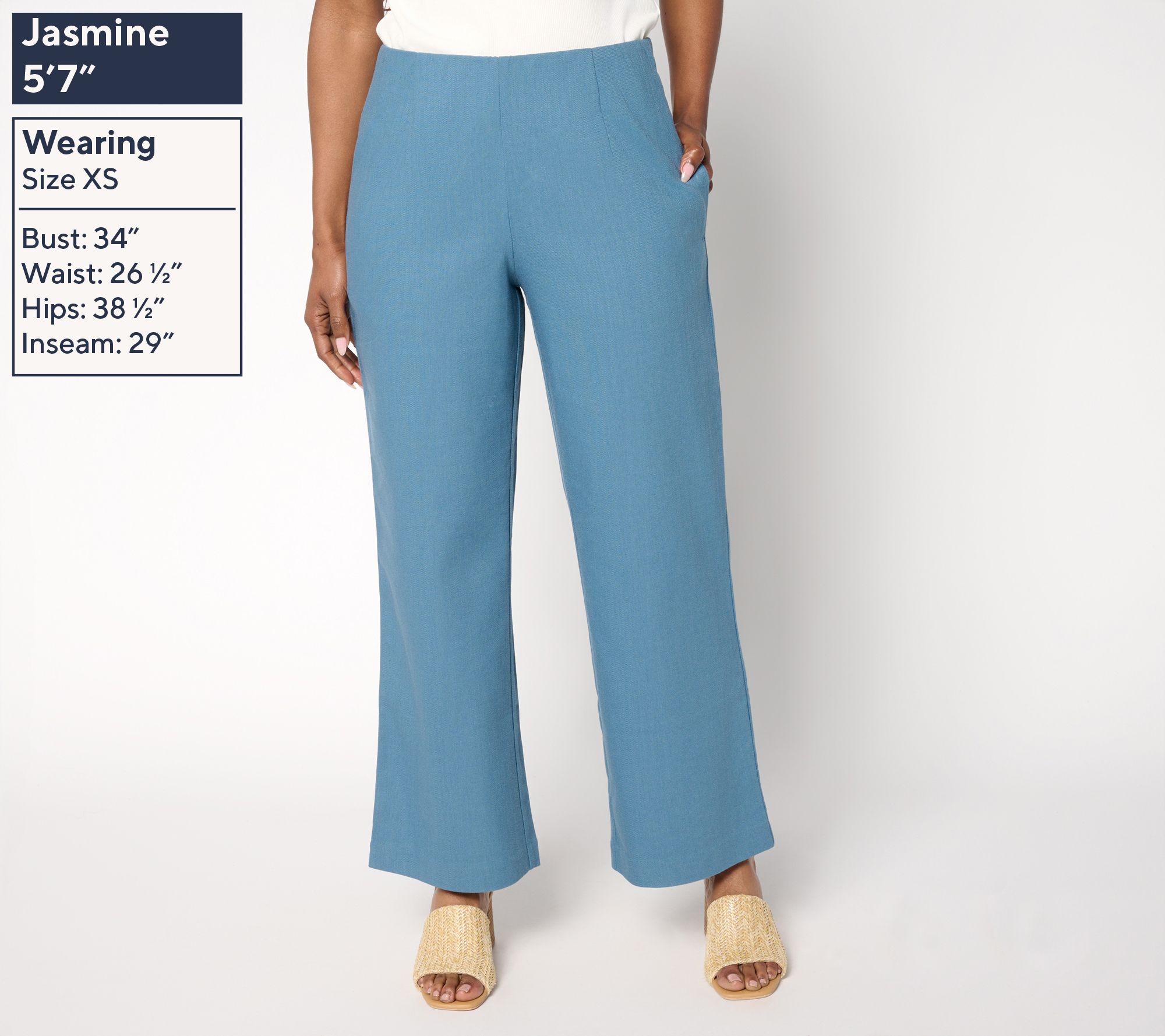 We have lift off! Launch your work-ready looks with these Me by Jennie Garth twill pants. A trouser style with clean lines and a no-fuss fit, the Hollywood waistband and soft stretch keep things smooth around the waist, while the wide-leg silhouette make styling so easy for both polished casual and more profesh looks. Front and back waist darts lend a tailored touch, while side seam pockets add just the right amount of function. From Me by Jennie Garth.