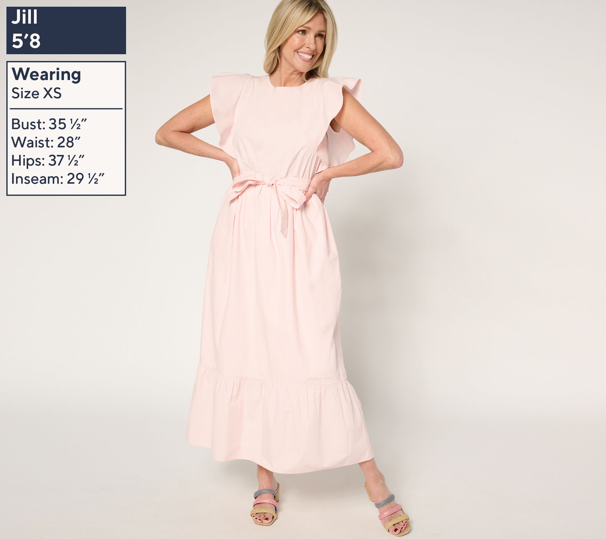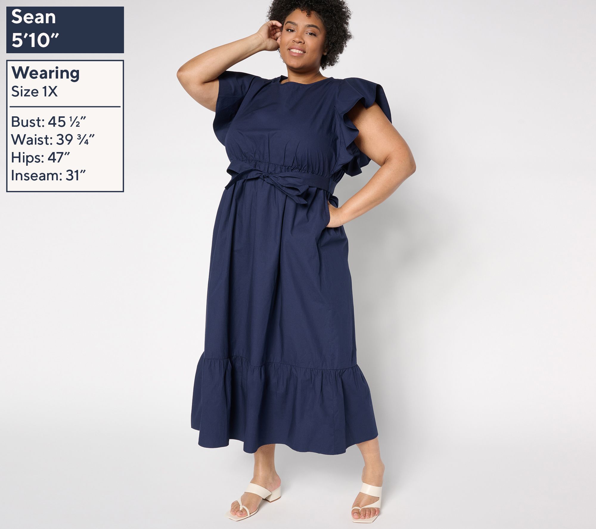 Features: maxi length, flutter sleeves with side gussets, keyhole back neckline, elastic waist seam, shirred bottom tier