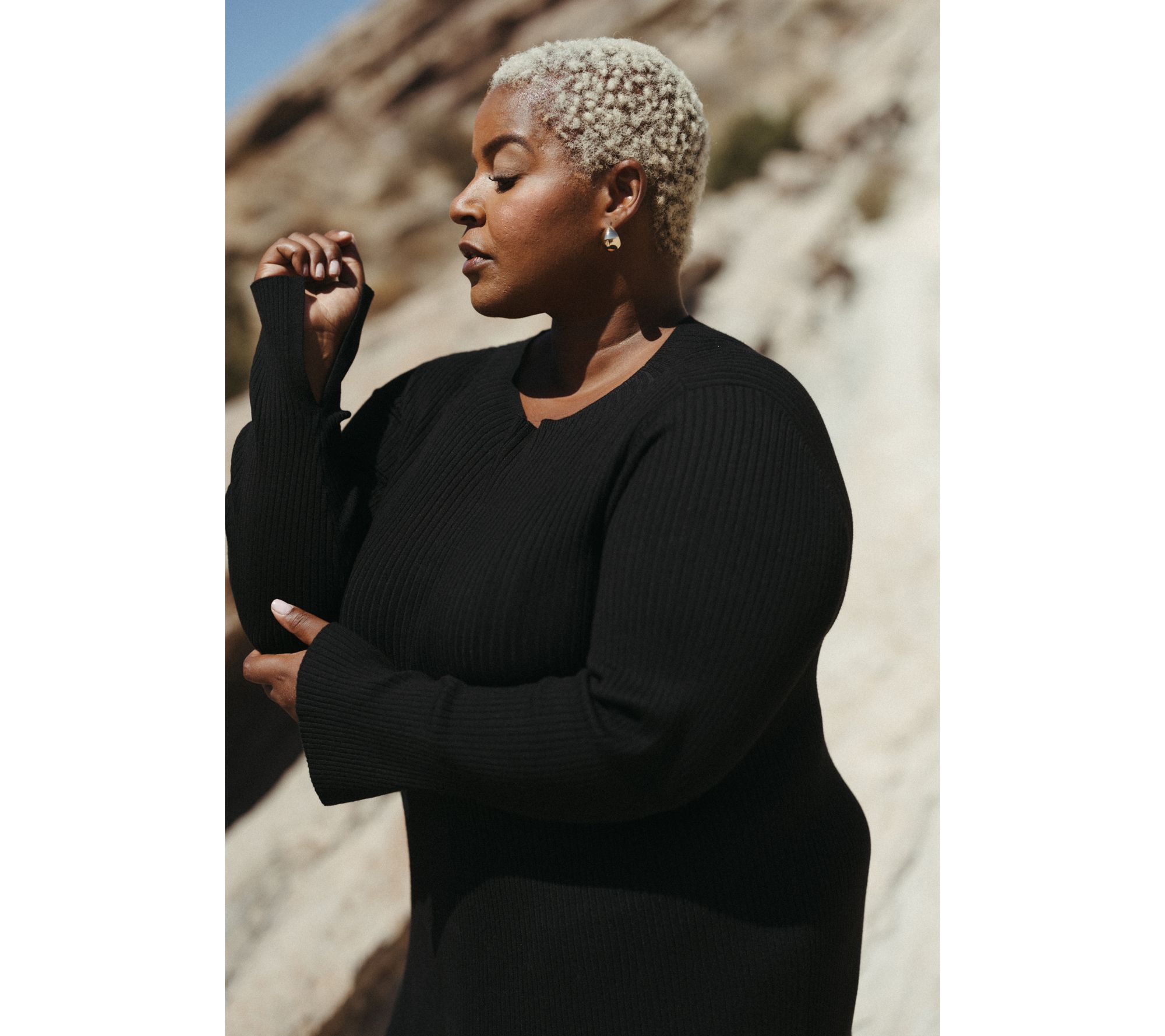 Features: midi length, high boatneck, long sleeve with side slits, tubular finish at hem