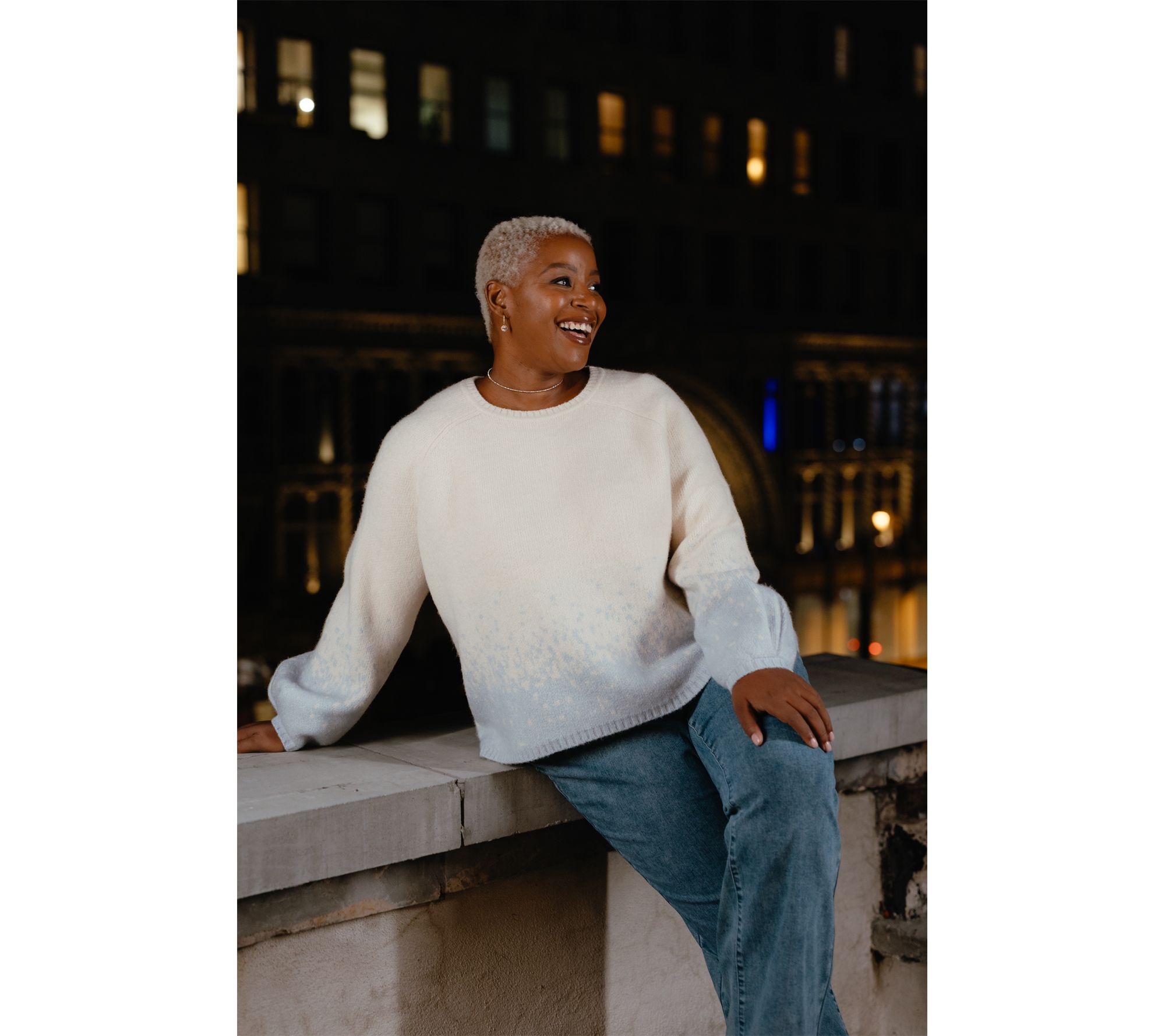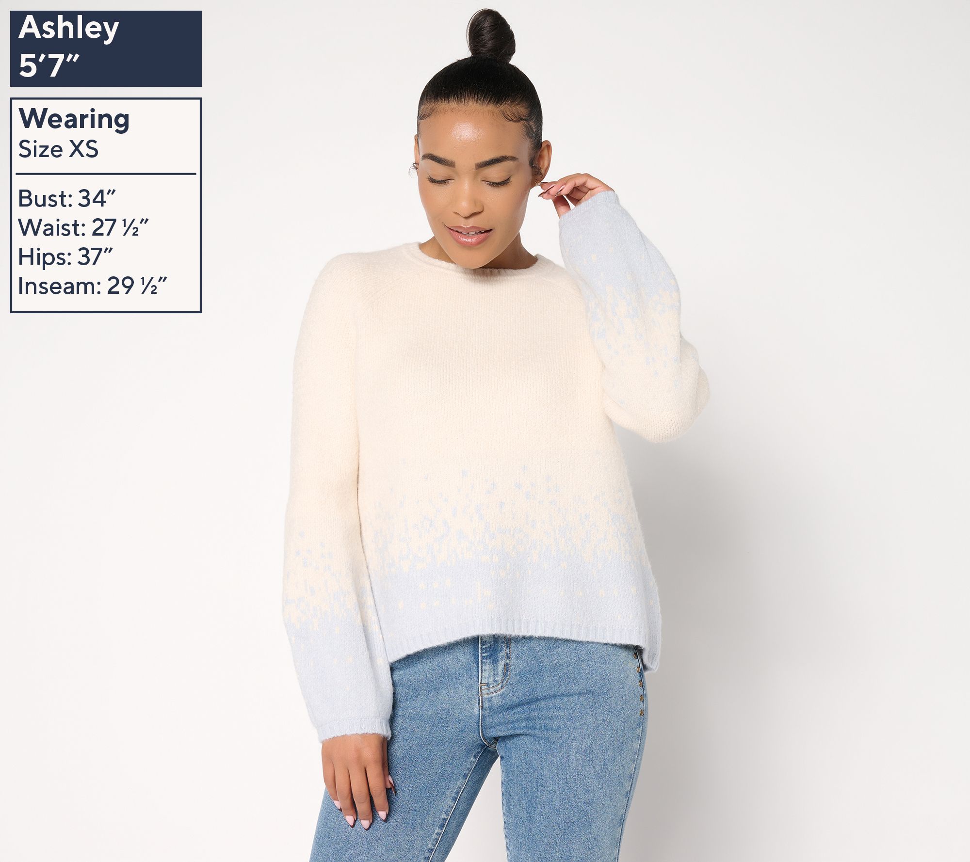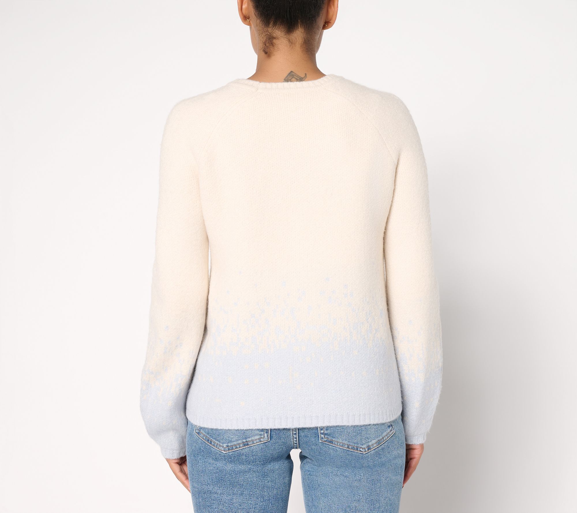 Embrace cozy evenings and casual afternoons with this raglan-sleeve ombre cloud sweater, styled with a high-low hem and relaxed shape for easy layering. A gently textured pleat detail at the sleeve adds a modern twist, making it a standout whether paired with jeans or lounge pants. From Me by Jennie Garth.