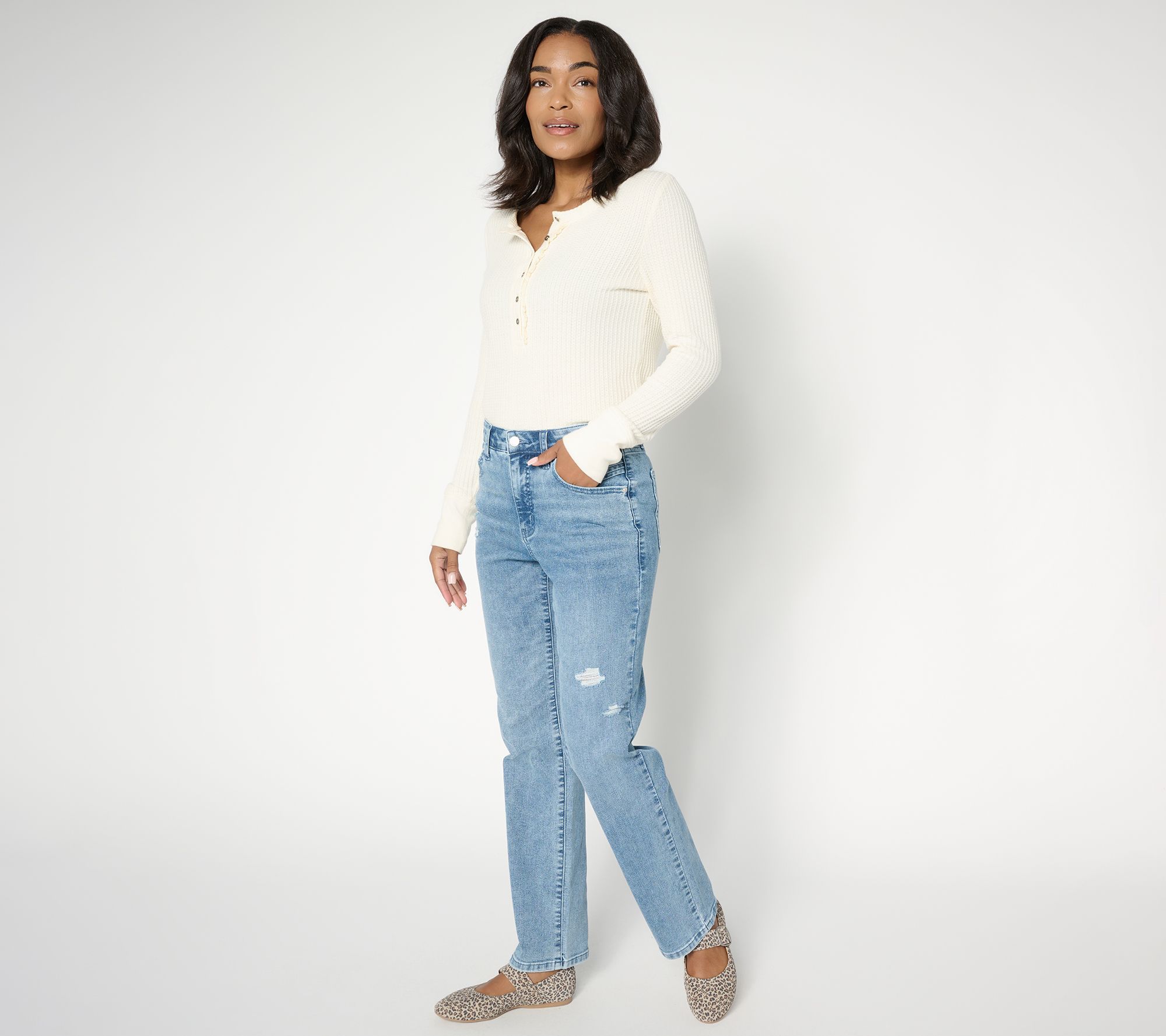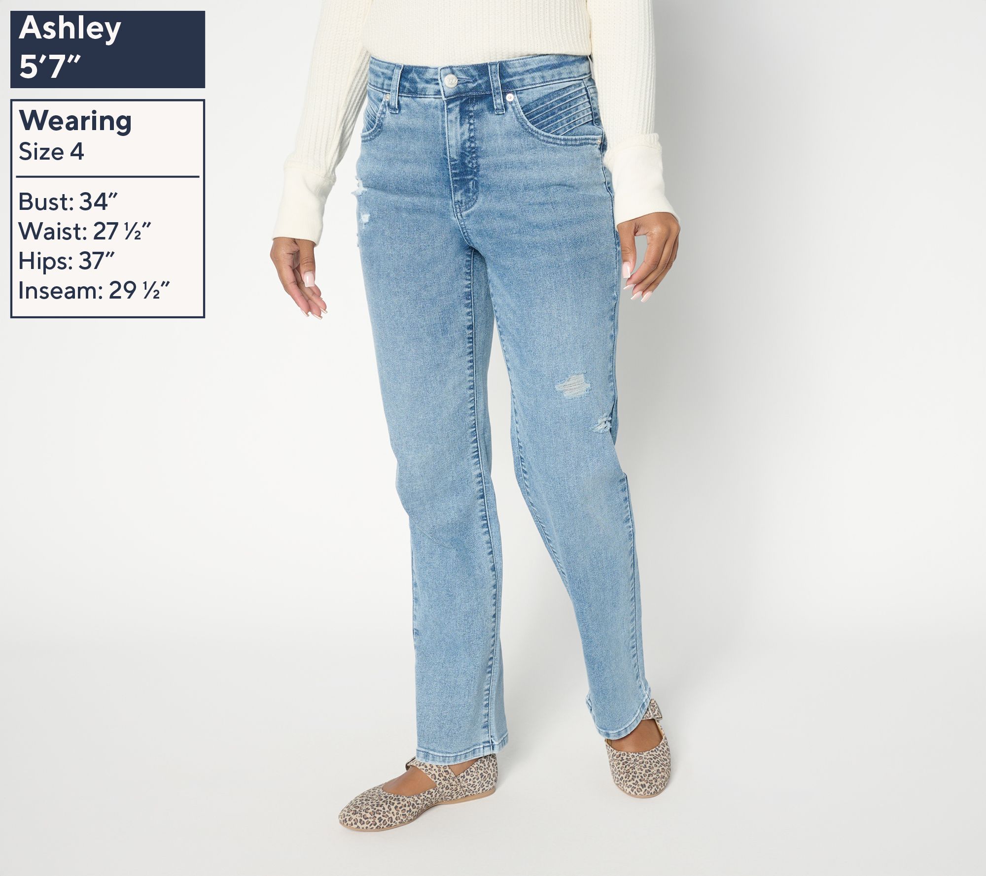 When the day calls for casual style, these jeans are ready to keep up -- featuring slight front distressing. The contour waistband with functional zip fly adds structure, while seam details on the front and back pockets lend a fresh update to a denim essential. From Me by Jennie Garth.