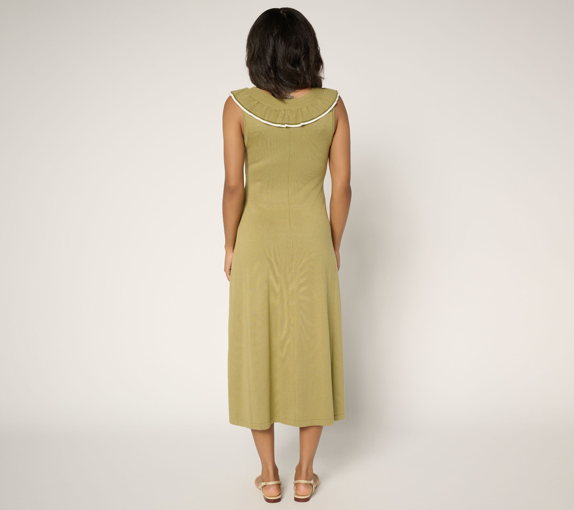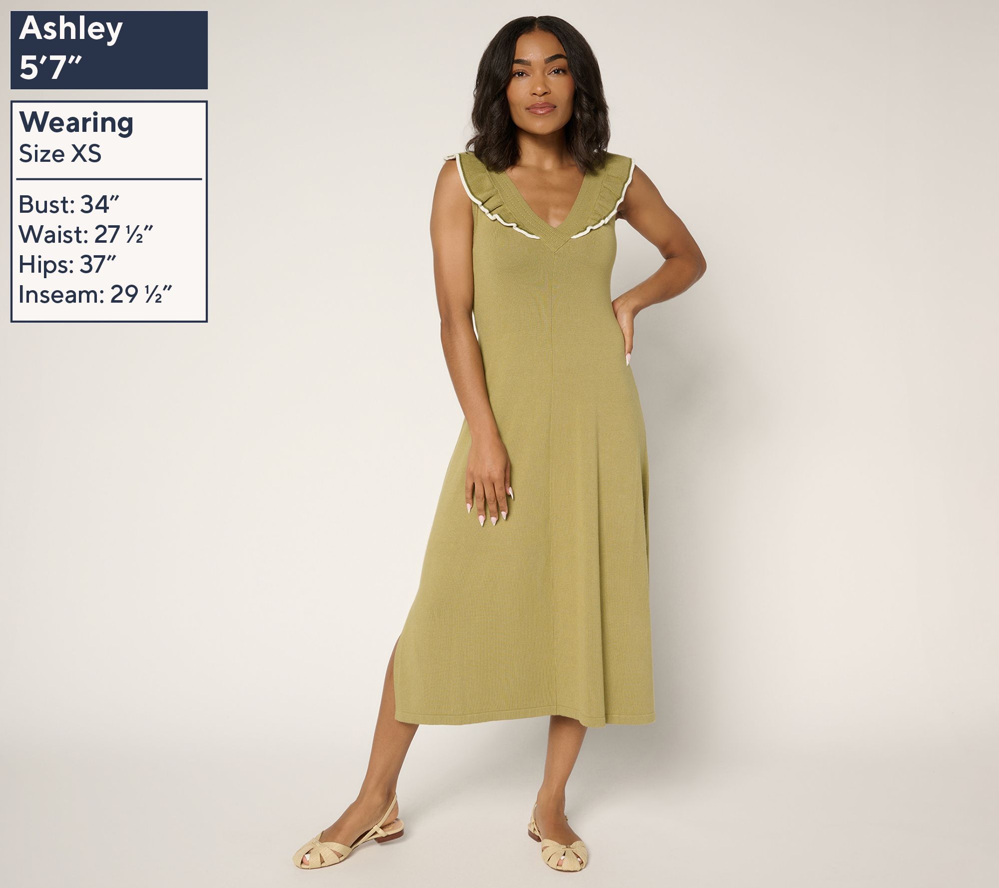 Bring a playful twist to your everyday look with this sweater dress, detailed with romantic ruffles at the front and back neckline. The soft, drapey knit and deep V-neck create an effortlessly put-together look. From Me by Jennie Garth.