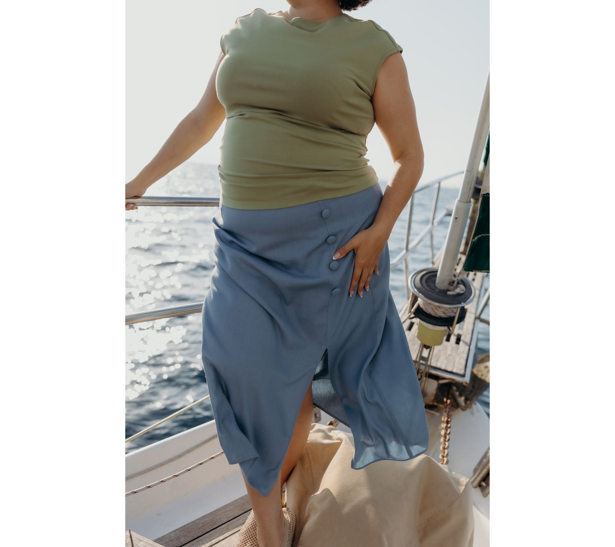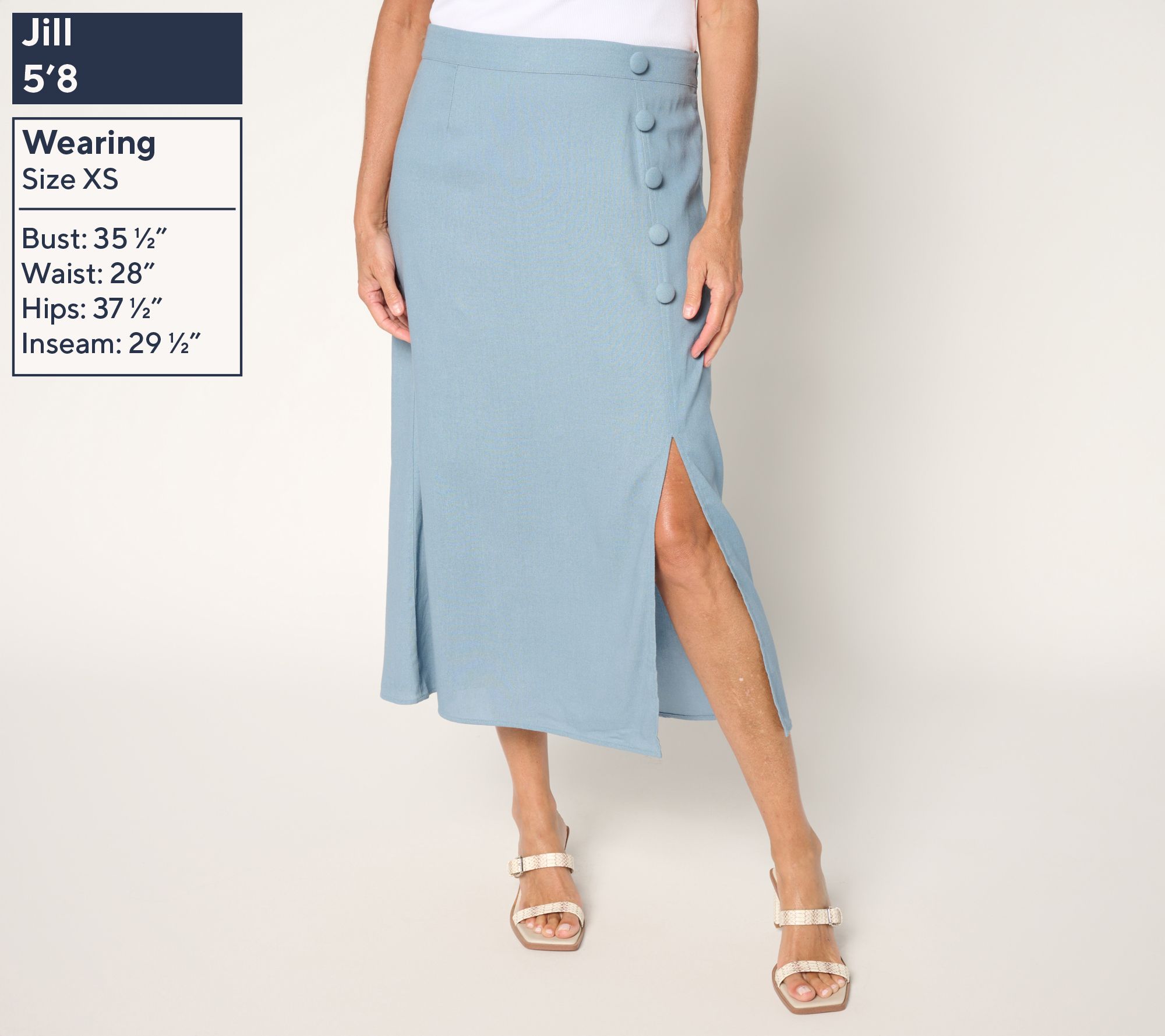 Features: midi length, front slit, front novelty button detail