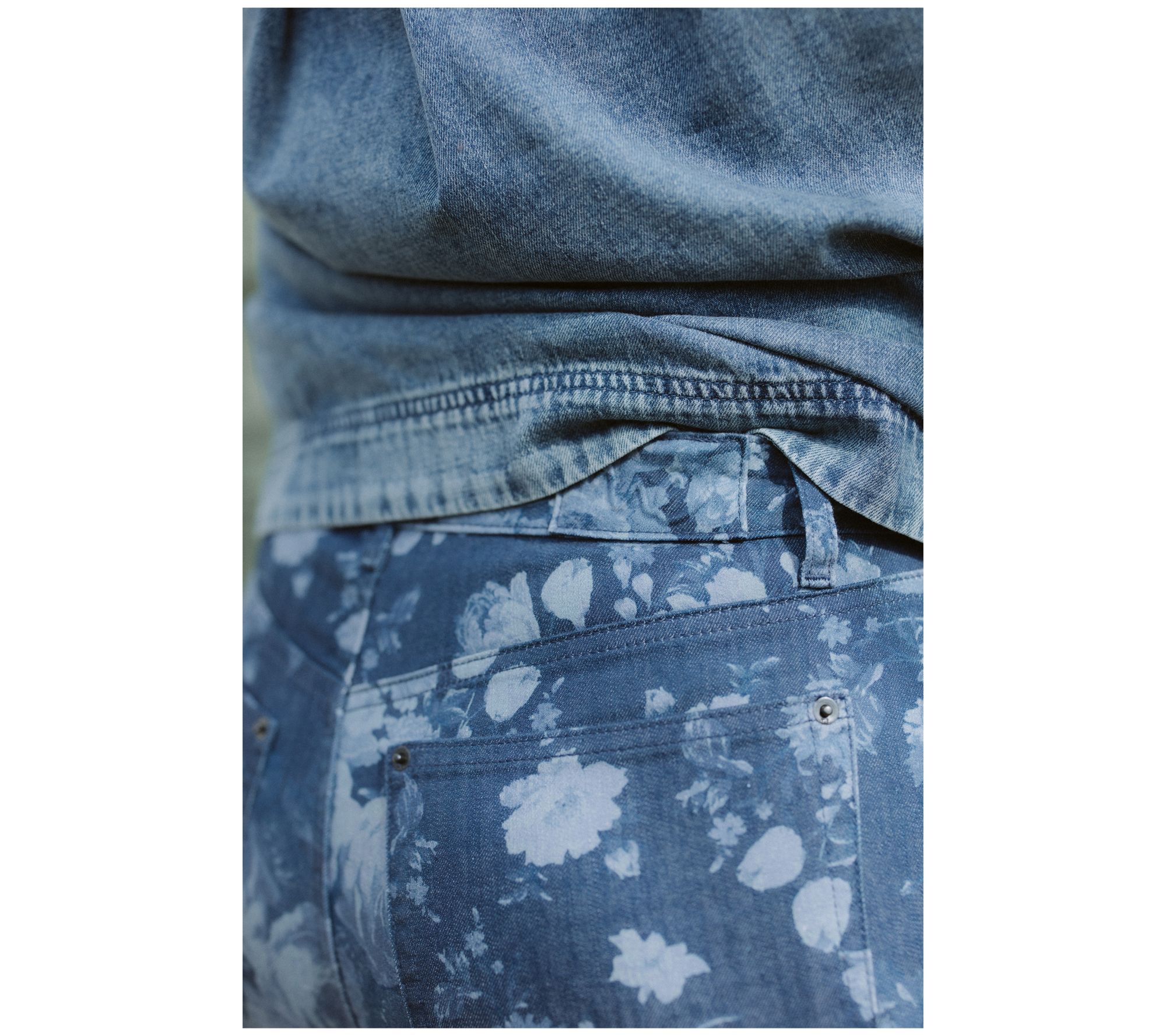 Features: floral print, five-pocket styling, belt loops, back yoke, back patch pockets, front and back inner knee darts, back hem darts