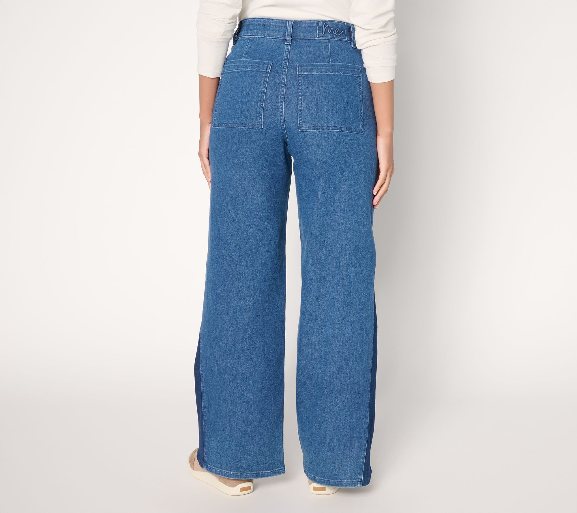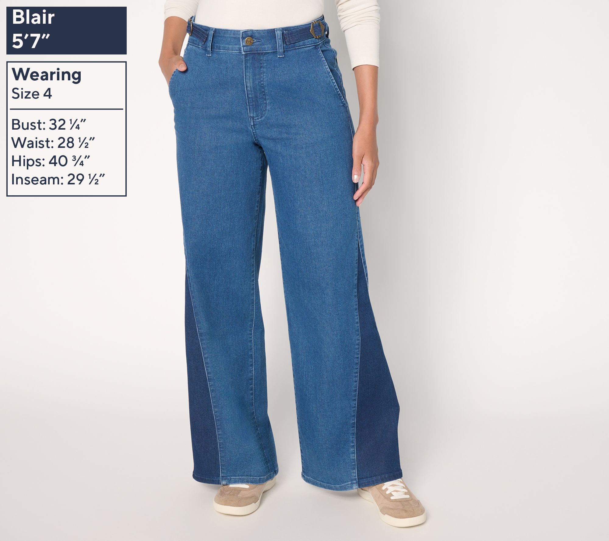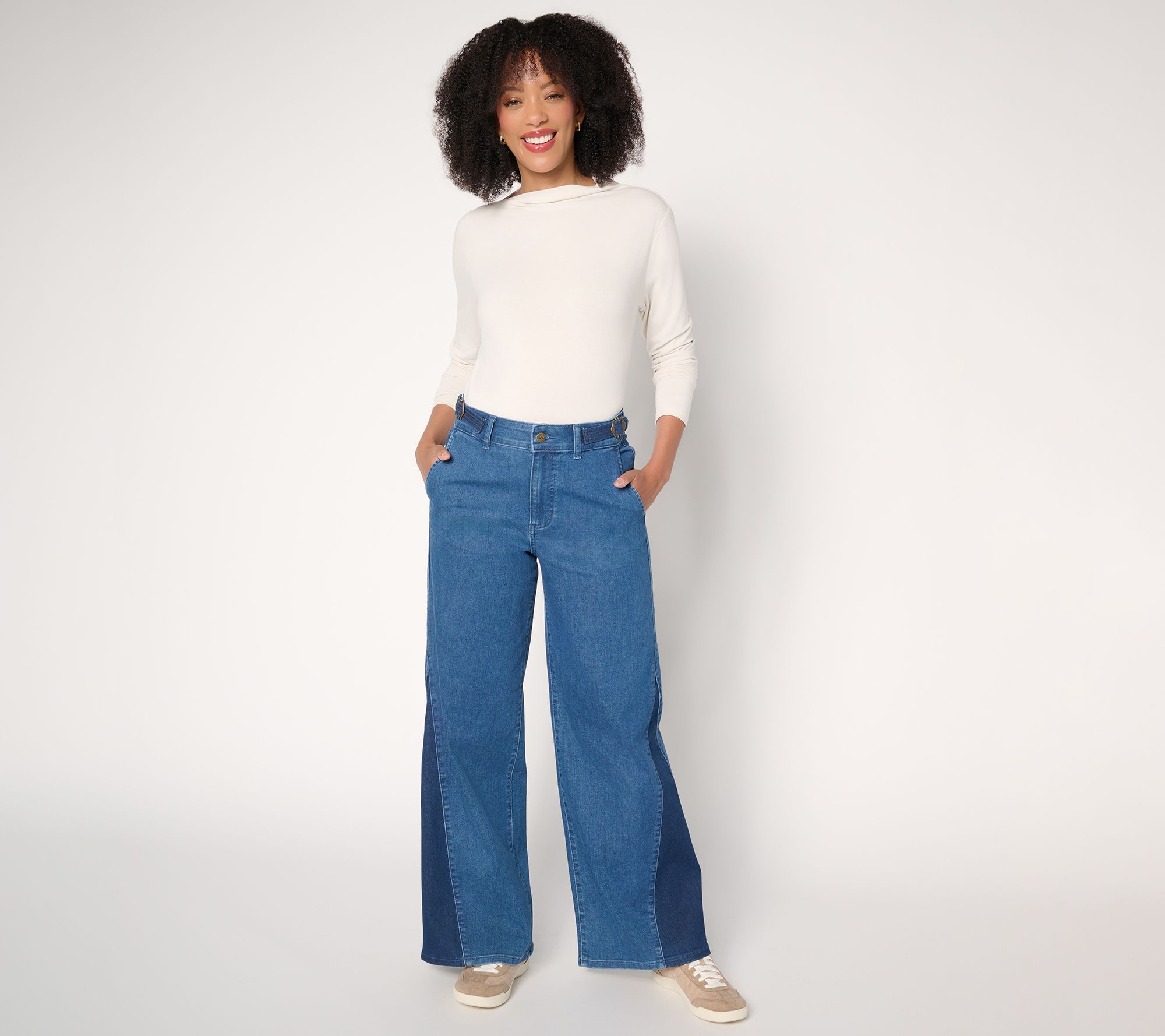 Why stick with a solid-color jean when a two-tone look is twice as nice?! Shake up your shade choices with Jennie Garth's wide-leg denim. The two-tone diagonal panel and adjustable side belts add a modern twist and customized comfort to everyday practicality. From Me by Jennie Garth.