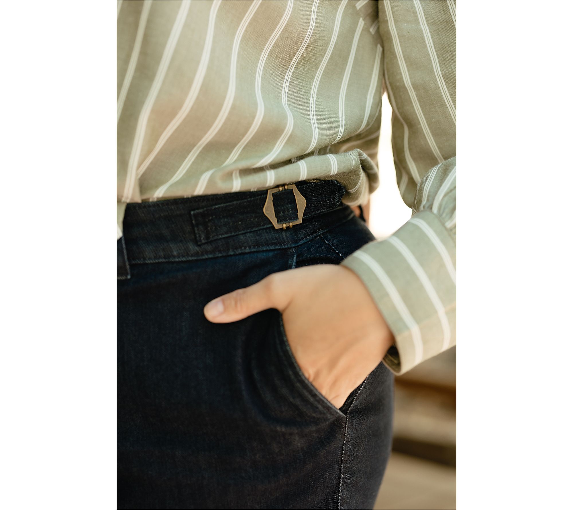 Features: self belt loops, adjustable belts with metal pull-through, back darts, patch pockets, front slash pockets, inset diagonal contrast panel