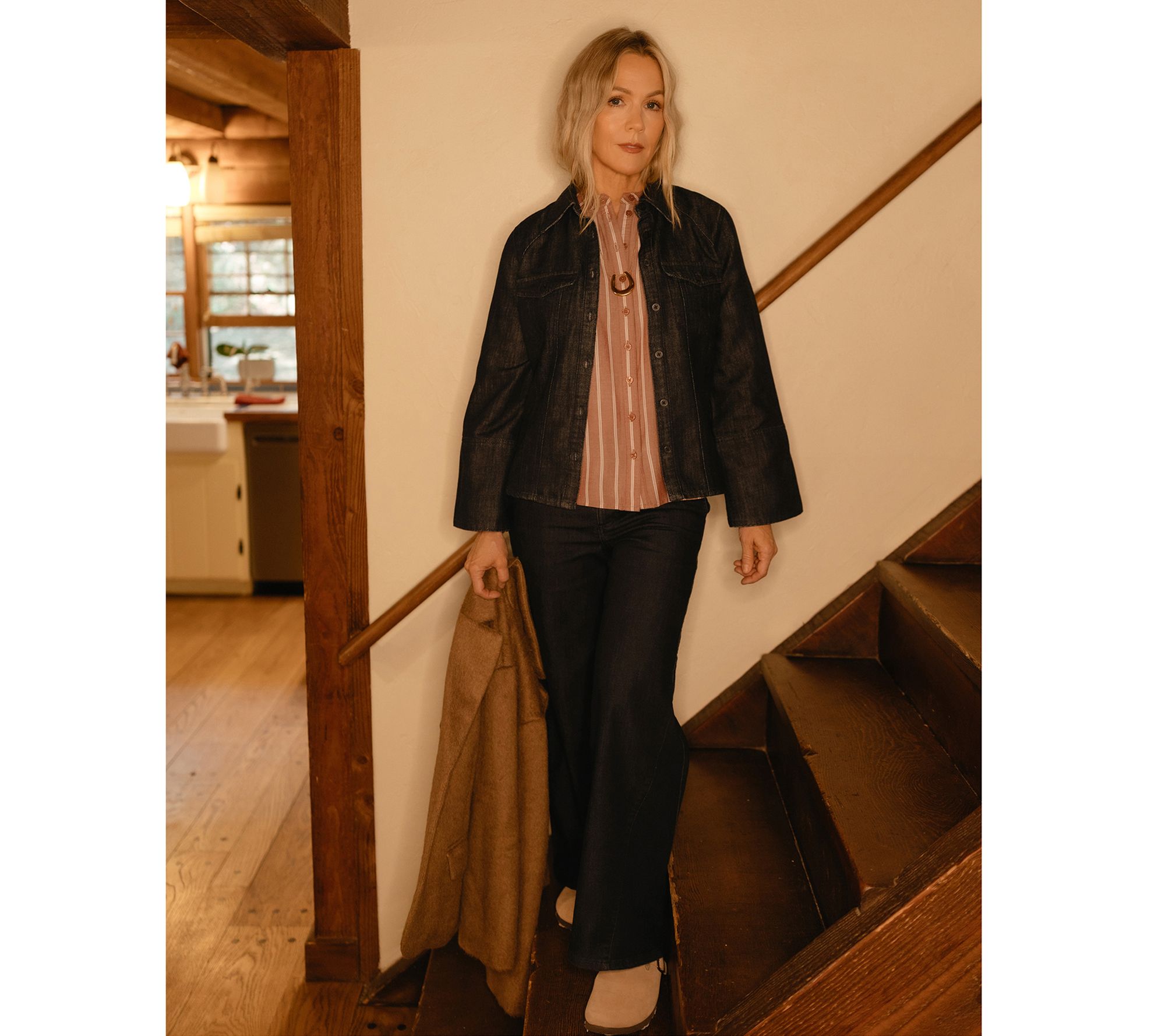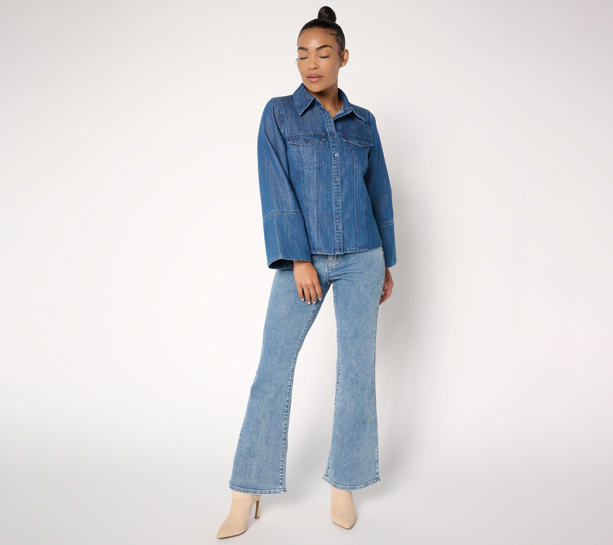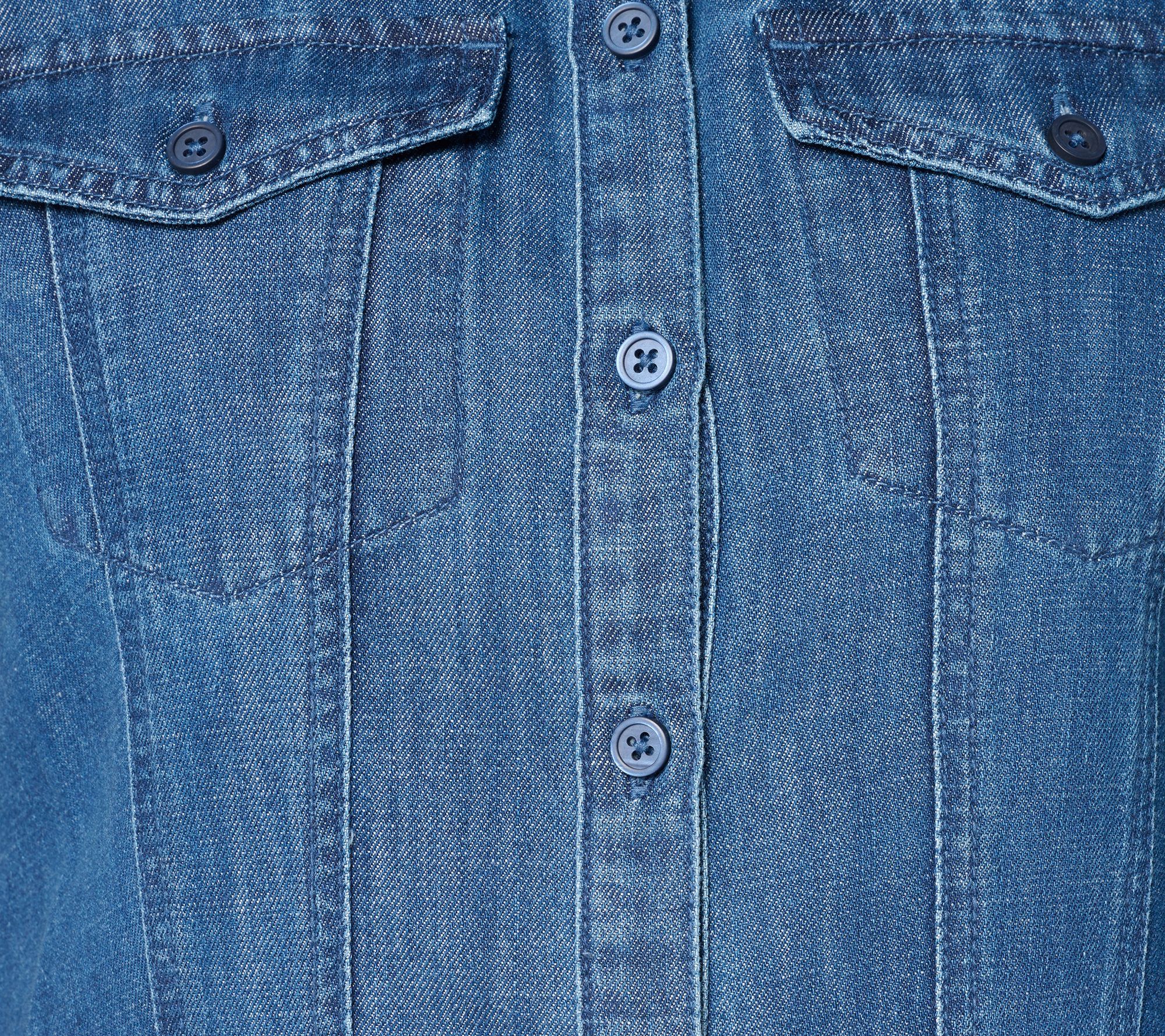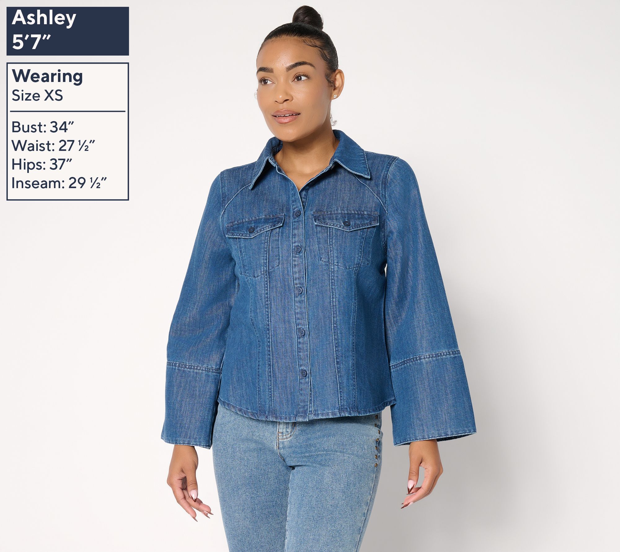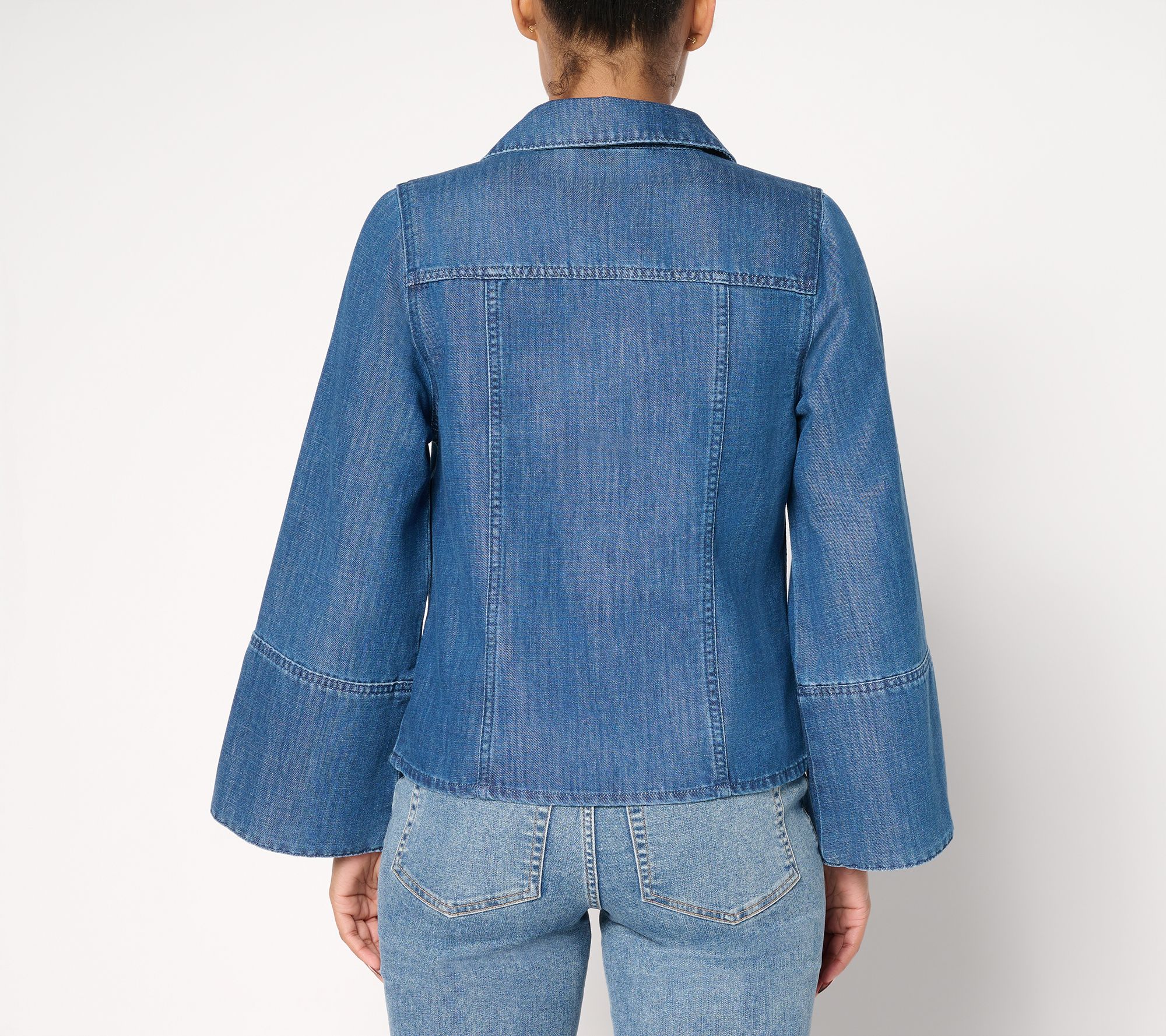 Attention, denim devotees! Rock the casual-chic aesthetic of this Rockie denim shirt by Jennie Garth. Wide bell sleeves frame the semi-fitted silhouette (and flatter yours!), with curved princess seams to lend plenty of attitude whether you button it up over a cami or wear it solo. From Me by Jennie Garth.