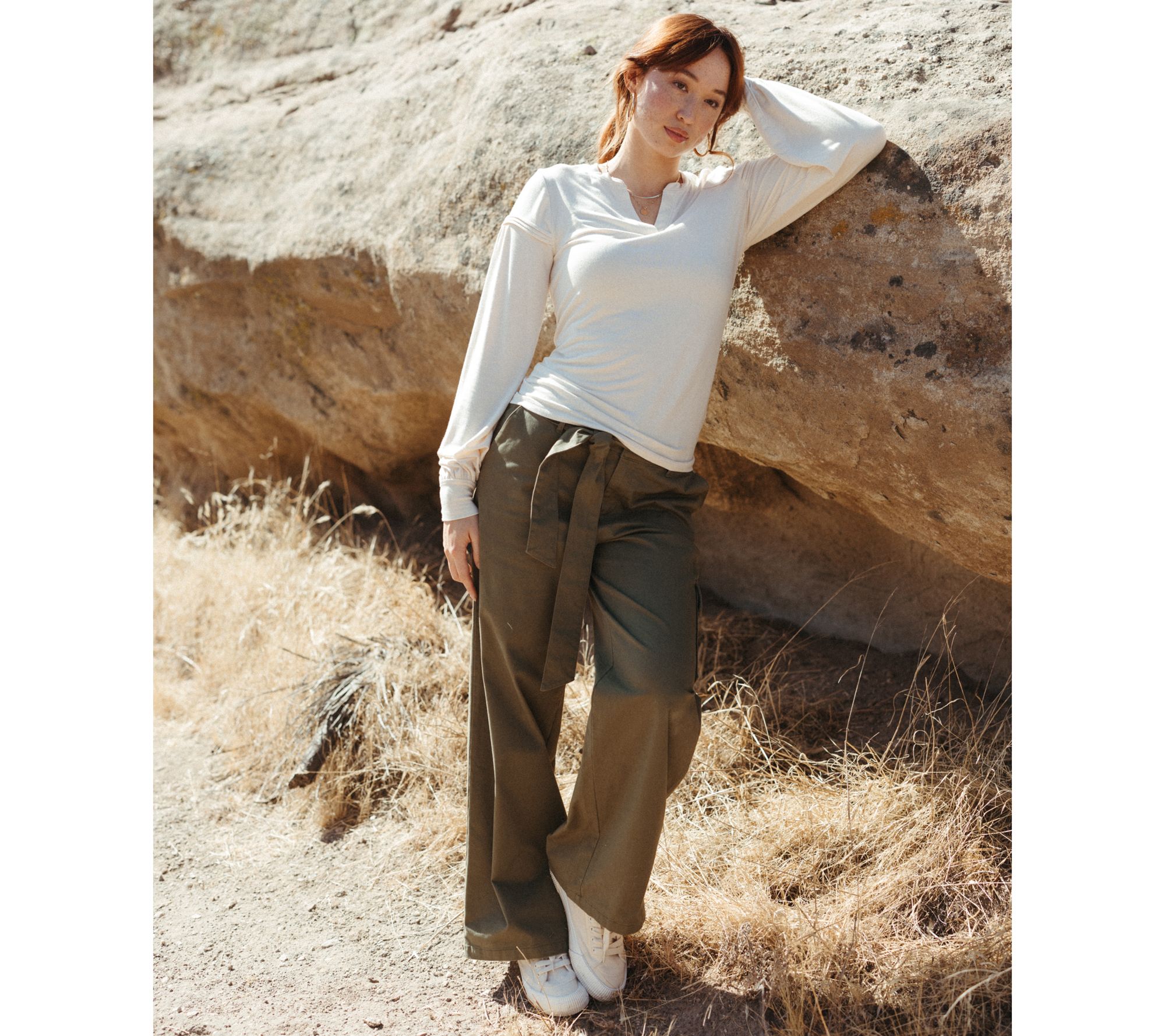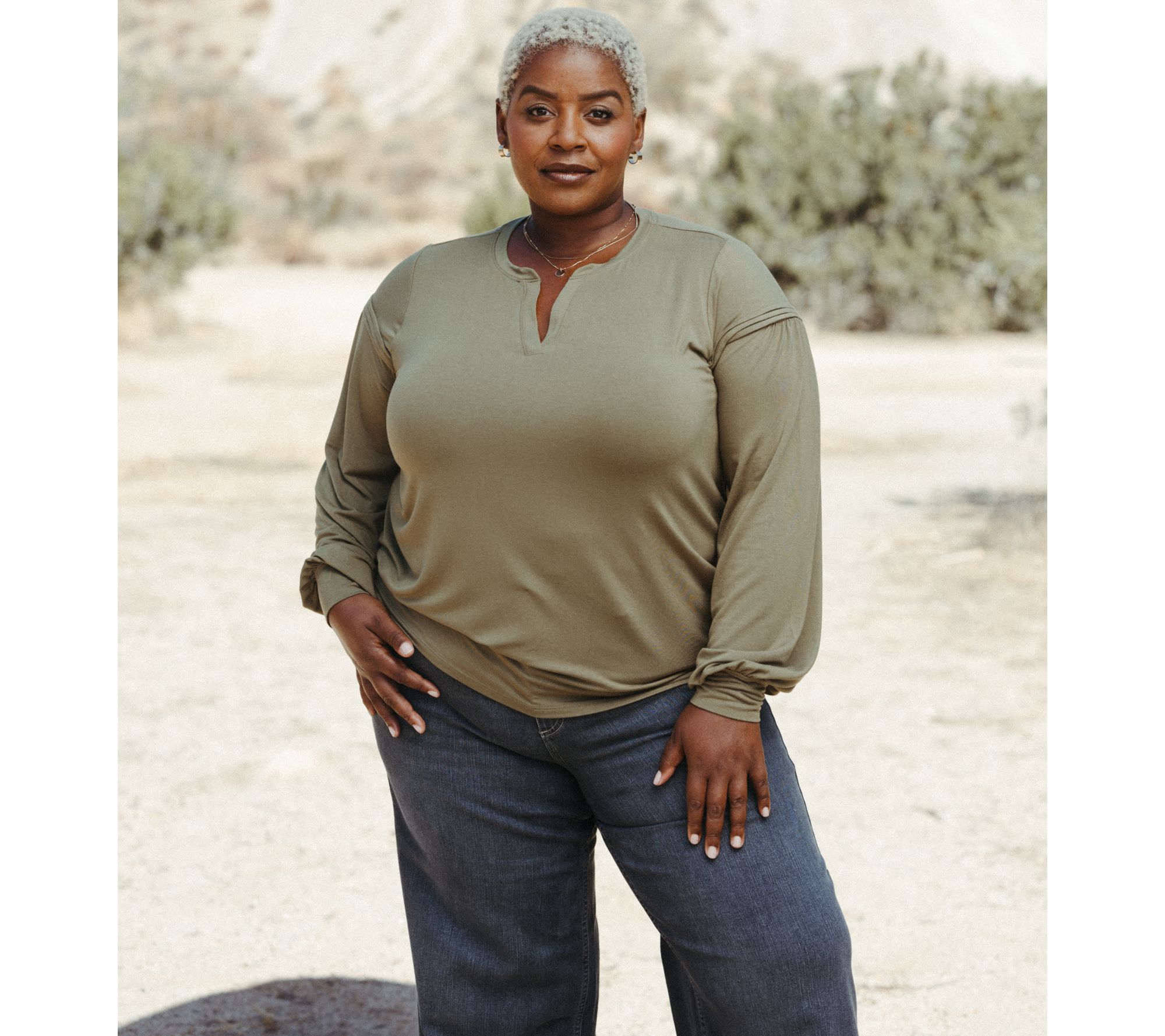 The vibe: elevated-casual. The comfort level: dreamy! This drapey knit top won't be on the hanger for long. From Me by Jennie Garth.