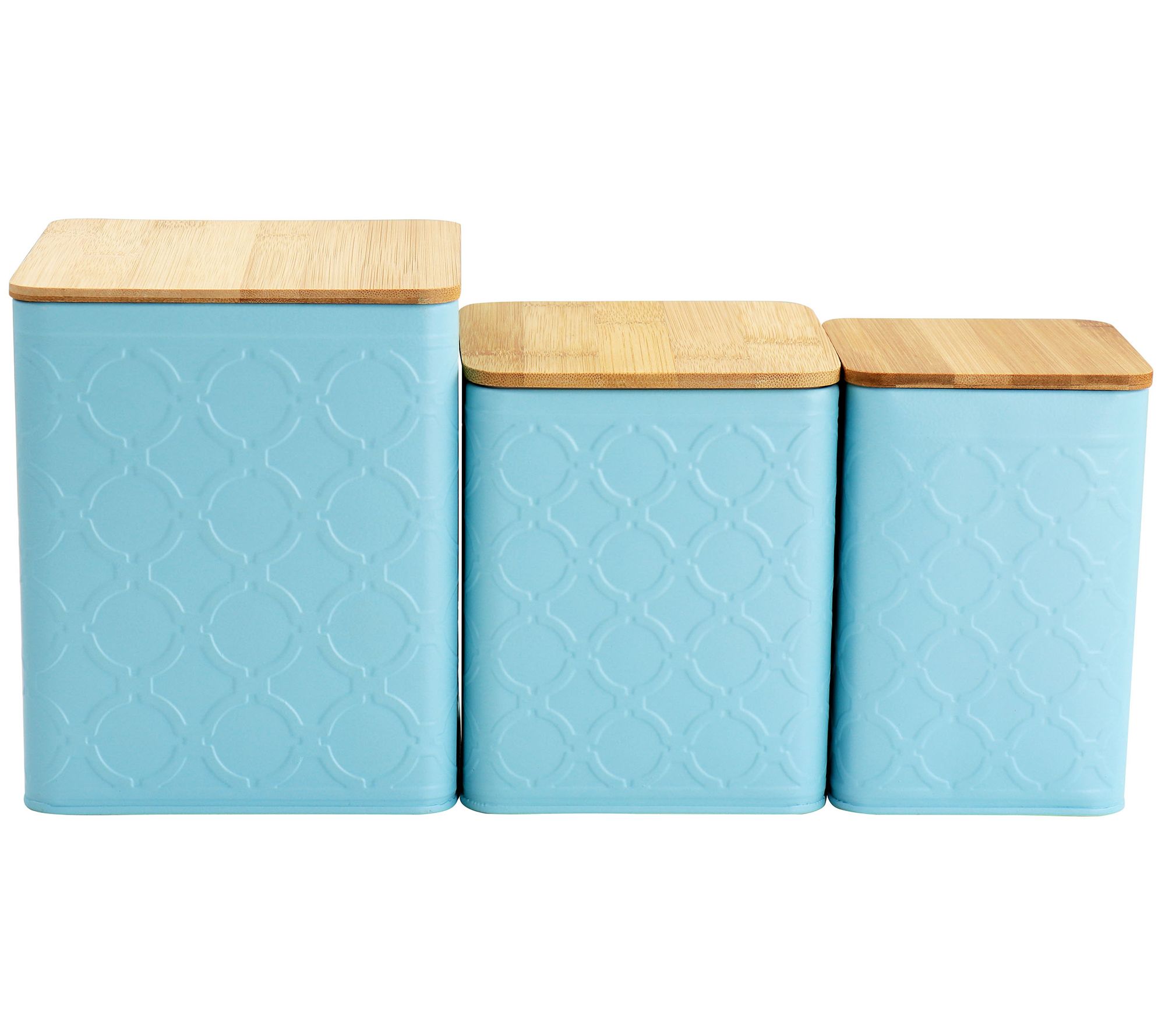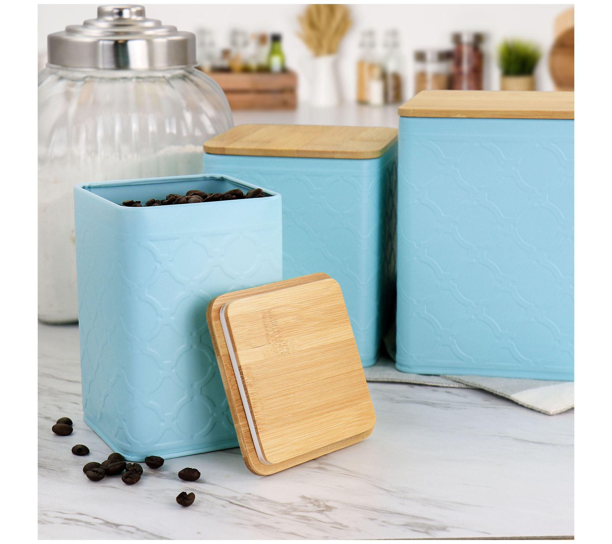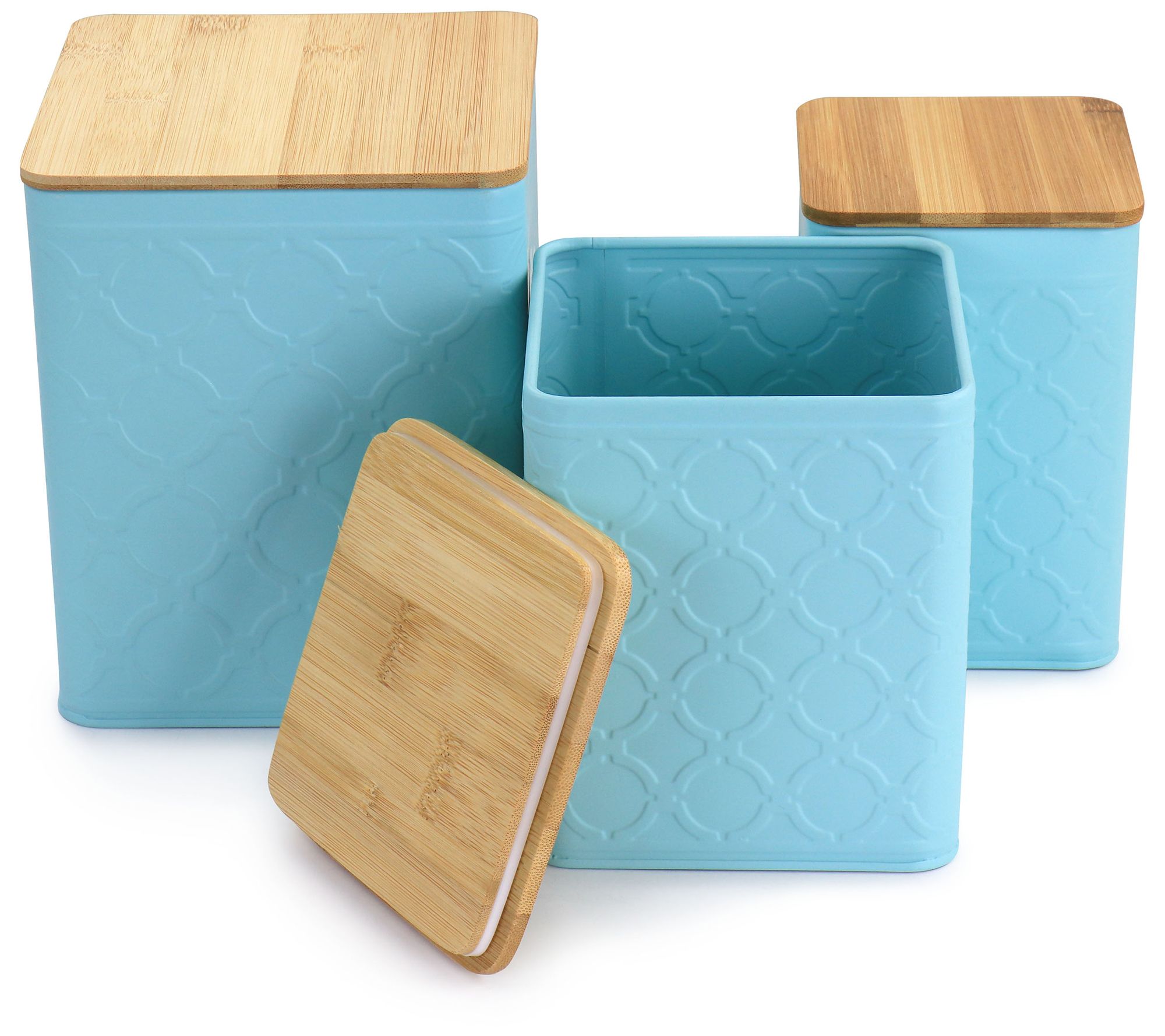 Keep your kitchen neat and organized with this food storage and organization 3 piece canister set by MegaChef. Assorted sizes are perfect for separating your countertop essentials. Organize your coffee, tea, sugar, flour, rice, pastas, or anything in between! Each canister has an embossed alternating diamond and circle pattern design with a matte finished, adding a pop of color to your kitchen decor. Bamboo lids keep an air tight seal when closed, locking in freshness. Lightweight iron squared canisters are powder coated in turquoise and are durably made for long lasting use. Set Includes - Large: 5.51in length, 5.51in width, 6.3in height, 1.05lb weight Medium: 4.5in length, 4.5in width, 5.51in height, 0.75lb weight Small: 3.74in length, 3.74in width, 5.31in height, 0.55lb weight;3 Piece Canister Set with Lids