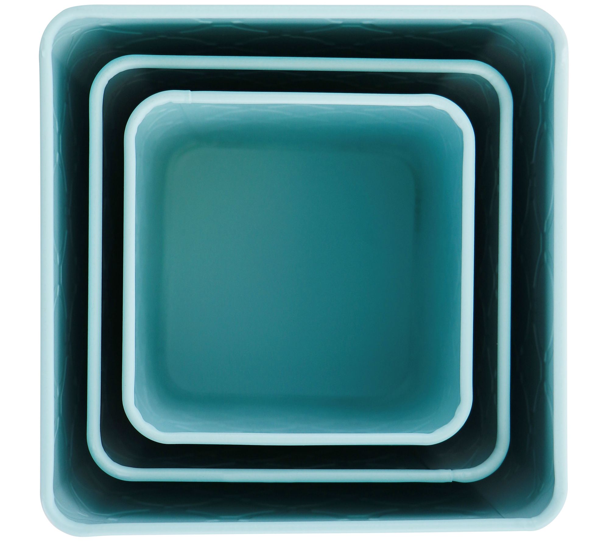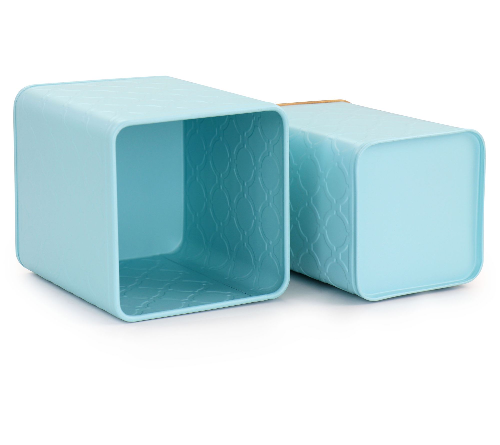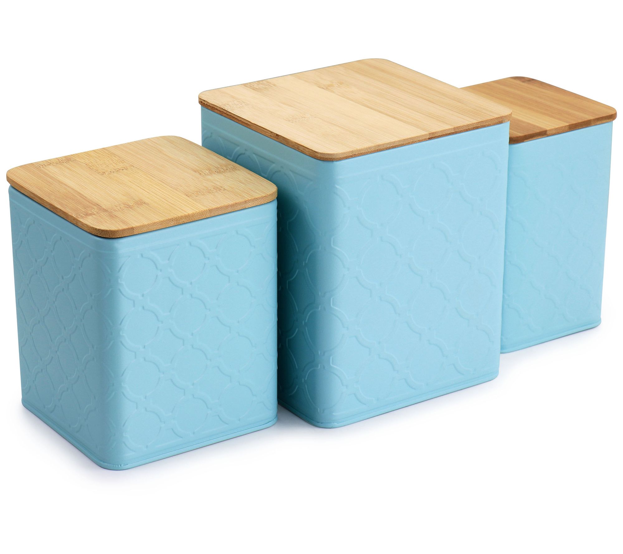 Keep your kitchen neat and organized with this food storage and organization 3 piece canister set by MegaChef. Assorted sizes are perfect for separating your countertop essentials. Organize your coffee, tea, sugar, flour, rice, pastas, or anything in between! Each canister has an embossed alternating diamond and circle pattern design with a matte finished, adding a pop of color to your kitchen decor. Bamboo lids keep an air tight seal when closed, locking in freshness. Lightweight iron squared canisters are powder coated in turquoise and are durably made for long lasting use. Set Includes - Large: 5.51in length, 5.51in width, 6.3in height, 1.05lb weight Medium: 4.5in length, 4.5in width, 5.51in height, 0.75lb weight Small: 3.74in length, 3.74in width, 5.31in height, 0.55lb weight;3 Piece Canister Set with Lids
