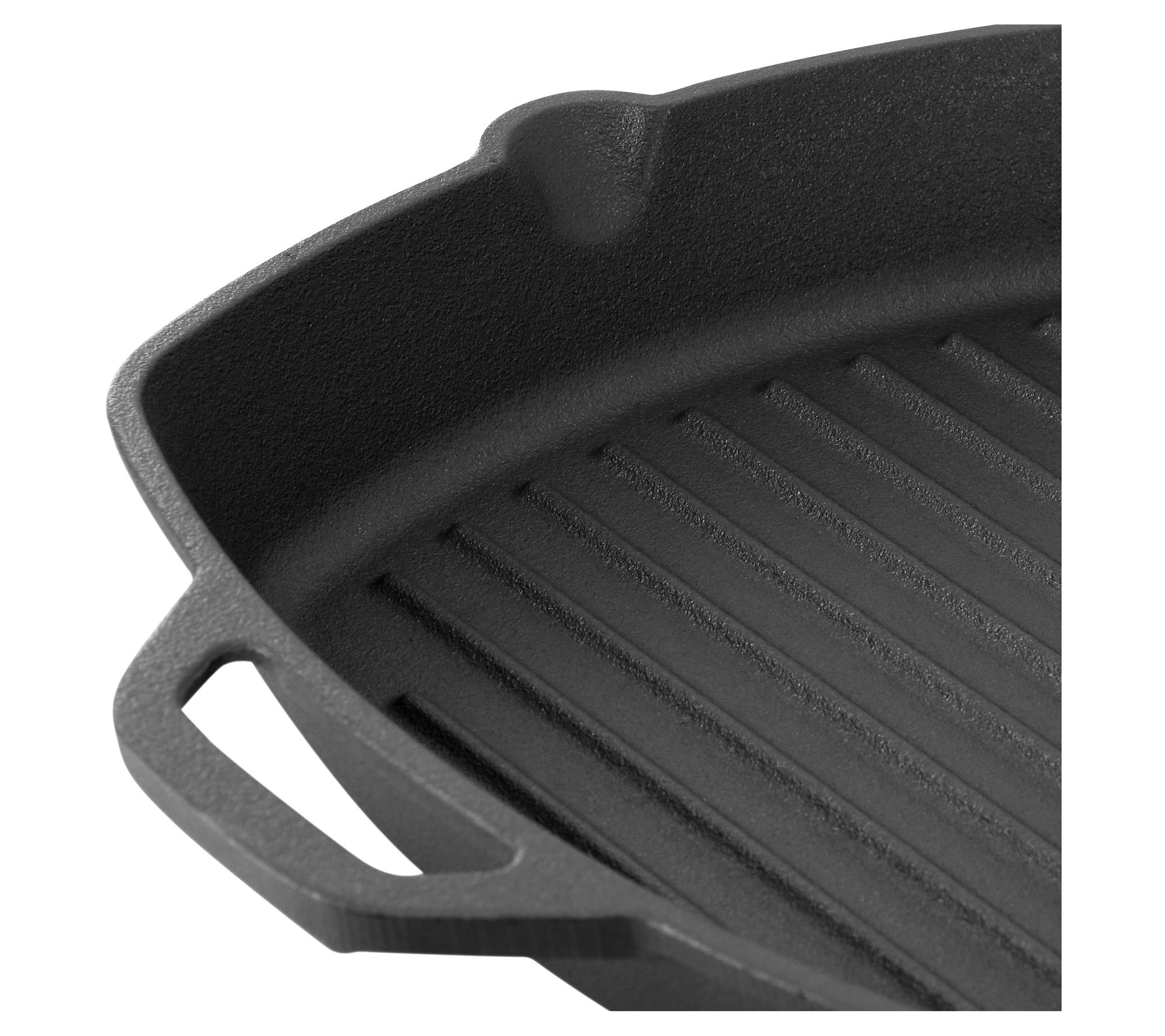 Get the perfect steak with the MegaChef cast iron griddle. Its heavy-duty cast iron construction ensures even heating for cooking steaks, burgers, chicken, and fish. With a convenient helper handle and pour spouts, you’ll easily move it from stove to table. Includes a tempered glass lid for making rich, flavorful sauces. From MegaChef.