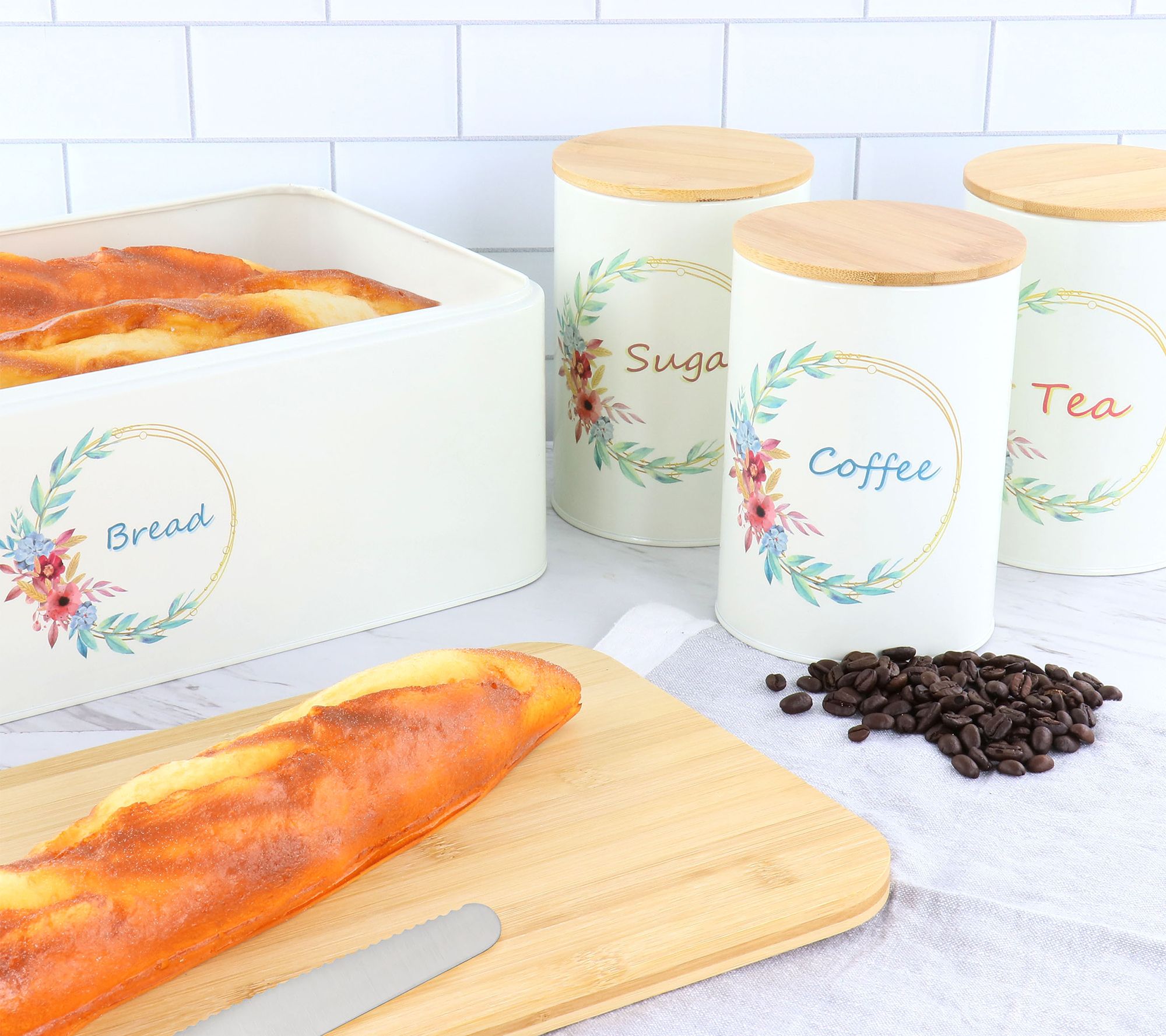 Keep your kitchen tidy, organized, and beautiful with the classic charm of this canister and bread box set. Each piece is topped with a bamboo lid so its contents stay fresh and secure. From MegaChef.